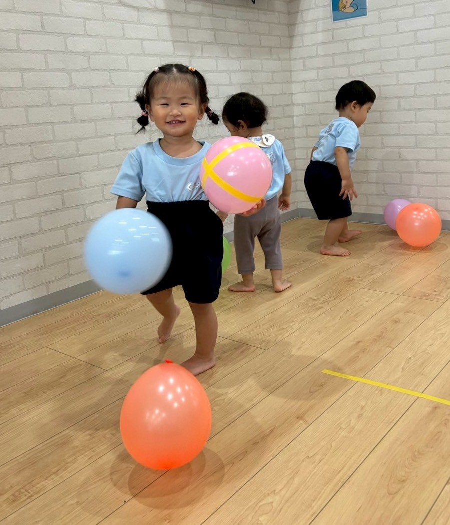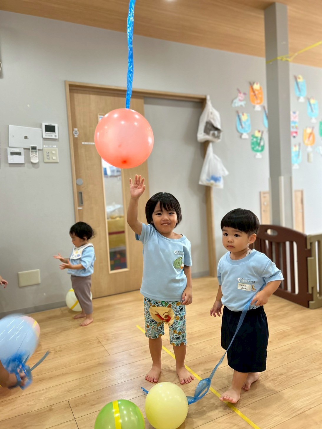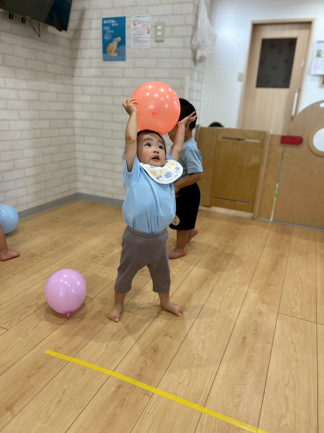 好きな色の風船を膨らませてもらってポンポンと投げたり、ぎゅっと抱っこしたり😊ビニールテープを巻いてボールに変身させたり、紐を付けて風船ワンちゃん🐶のお散歩したりと色んな遊びを楽しみました🥰特に、天井からぶら下げた風船にジャンプしてタッチ🙌🏻が大人気❣️身体をいっぱい動かして遊びました🤗