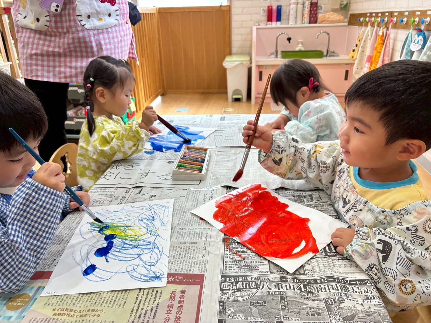 🐿🐼組のお友だちは、クレヨン🖍でお絵描きをした後に好きな色の絵の具を塗って個性溢れる作品が出来ました👏