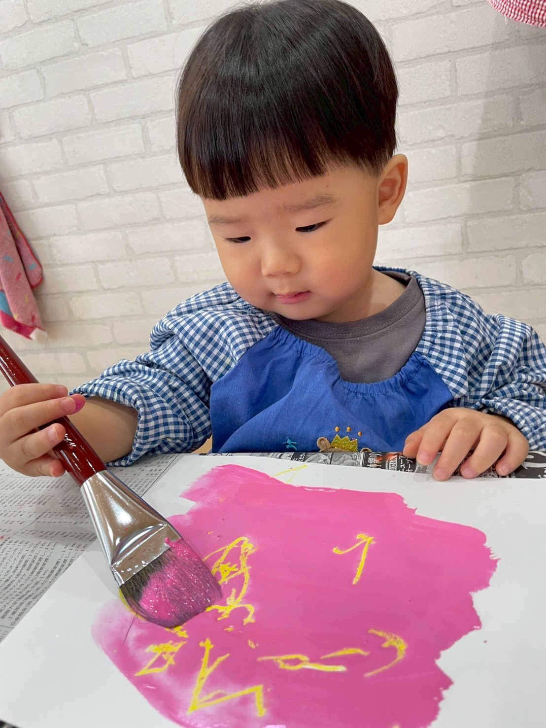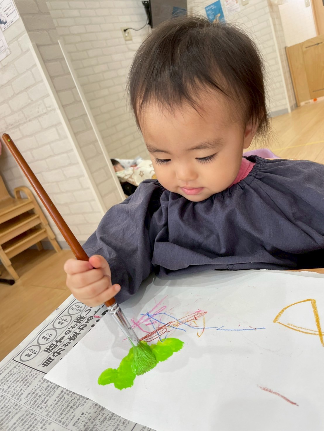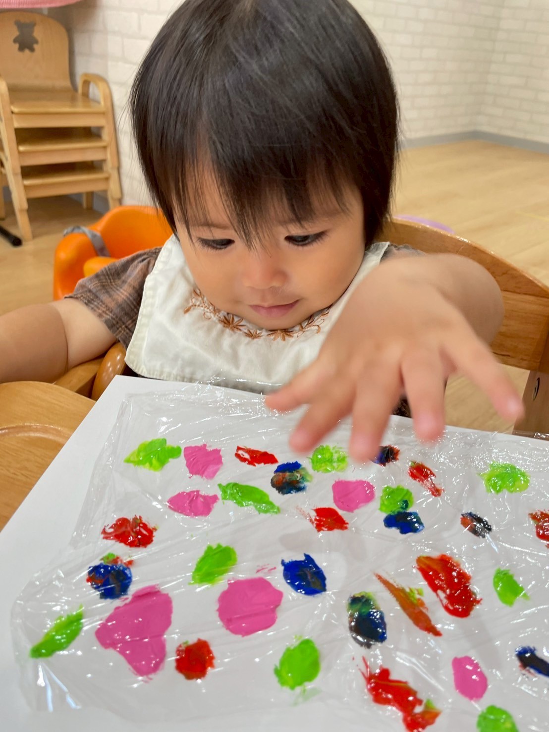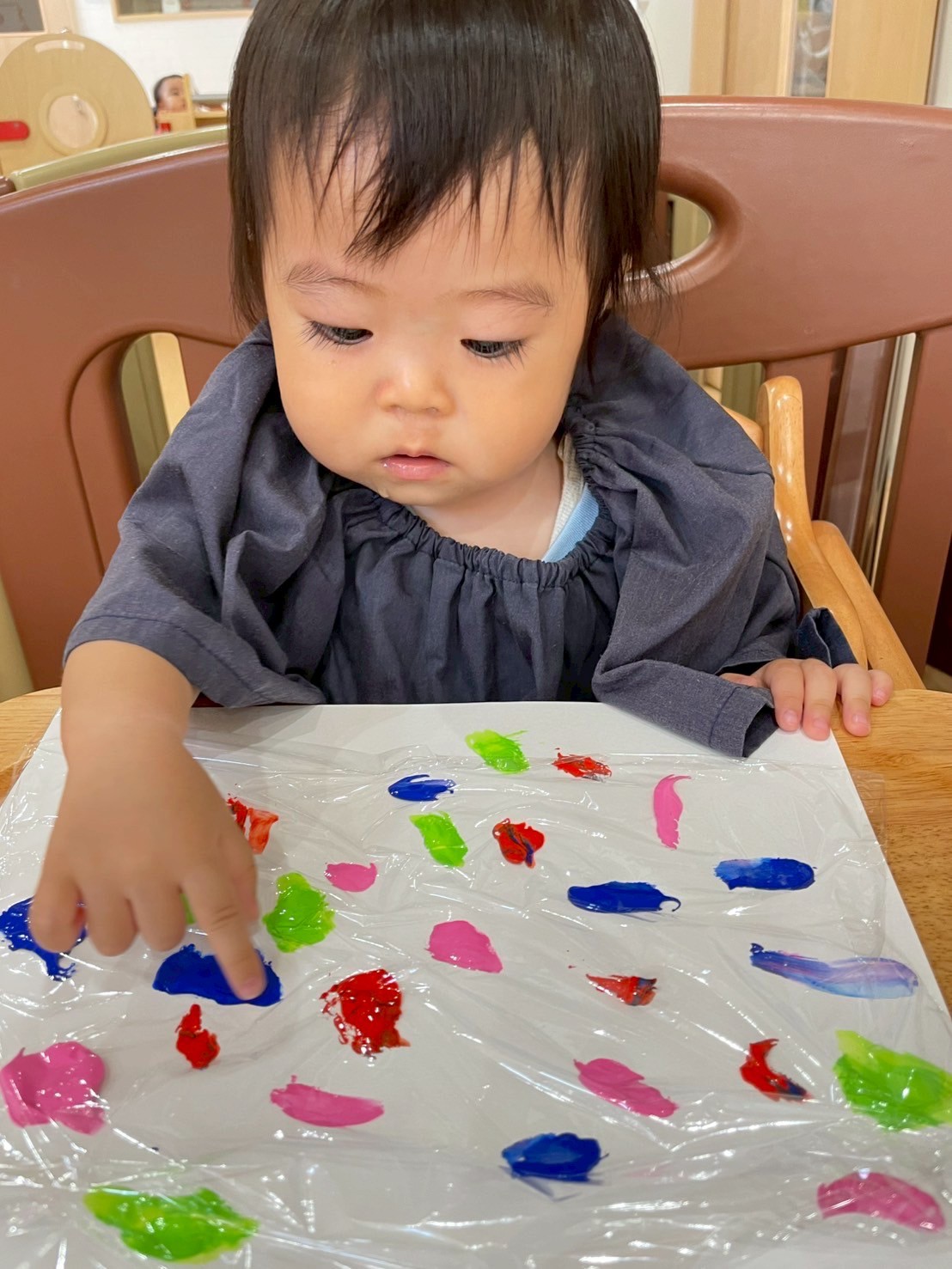 🐥組のお友だちは、プッシュアートで画用紙に色付けしました🎨はじめは、絵の具の触感に不思議そうな表情を見せていましたが、慣れてくると豪快にバンバン叩いて楽しんでいましたよ🤗