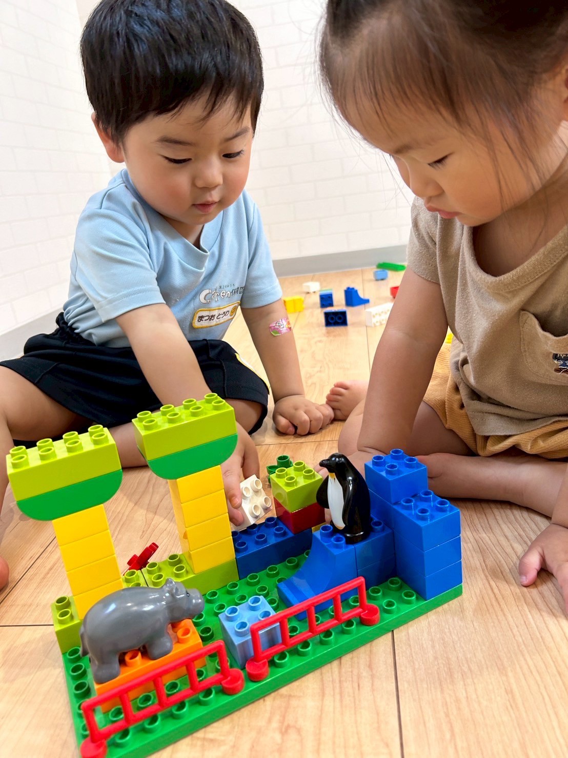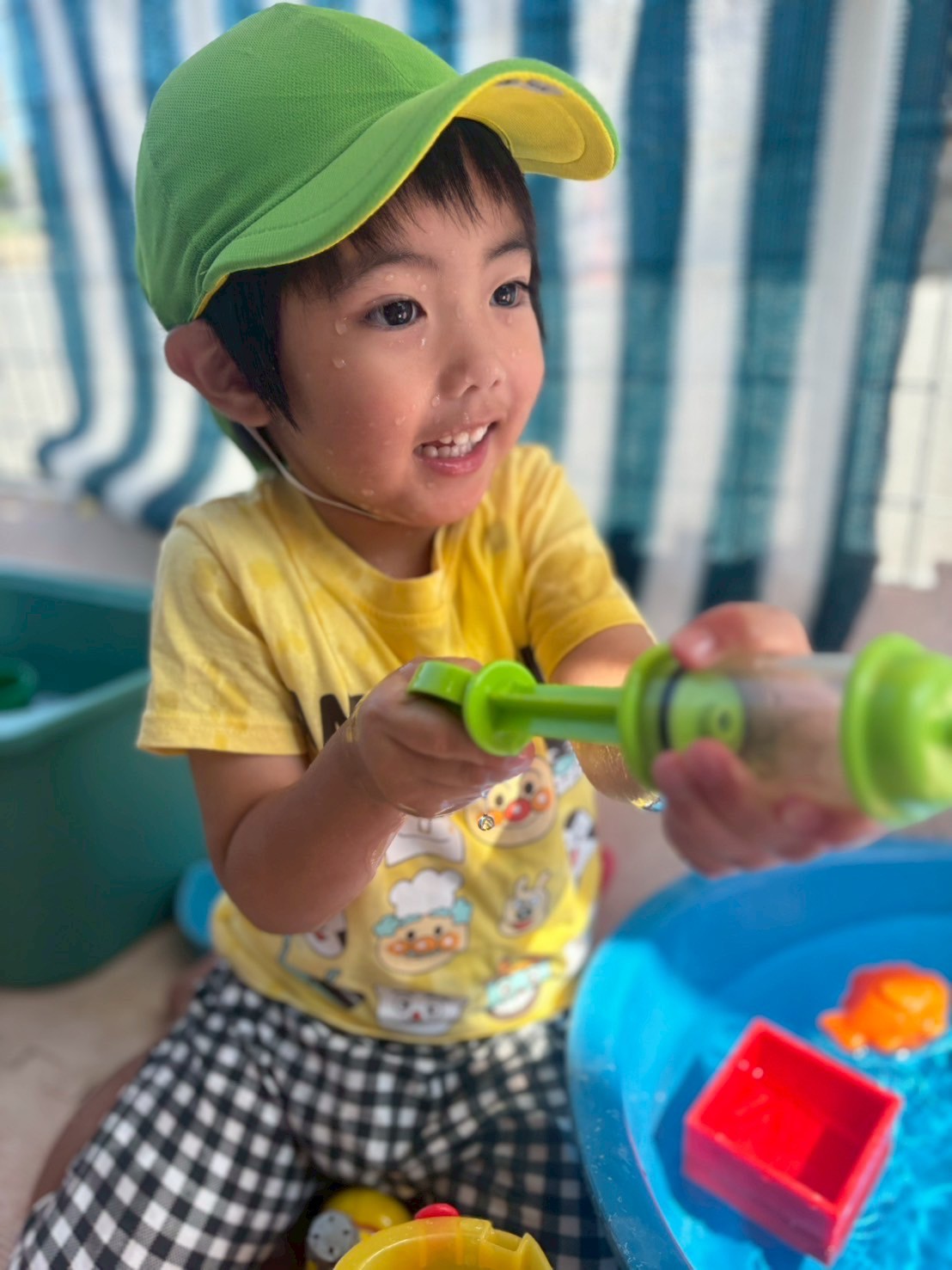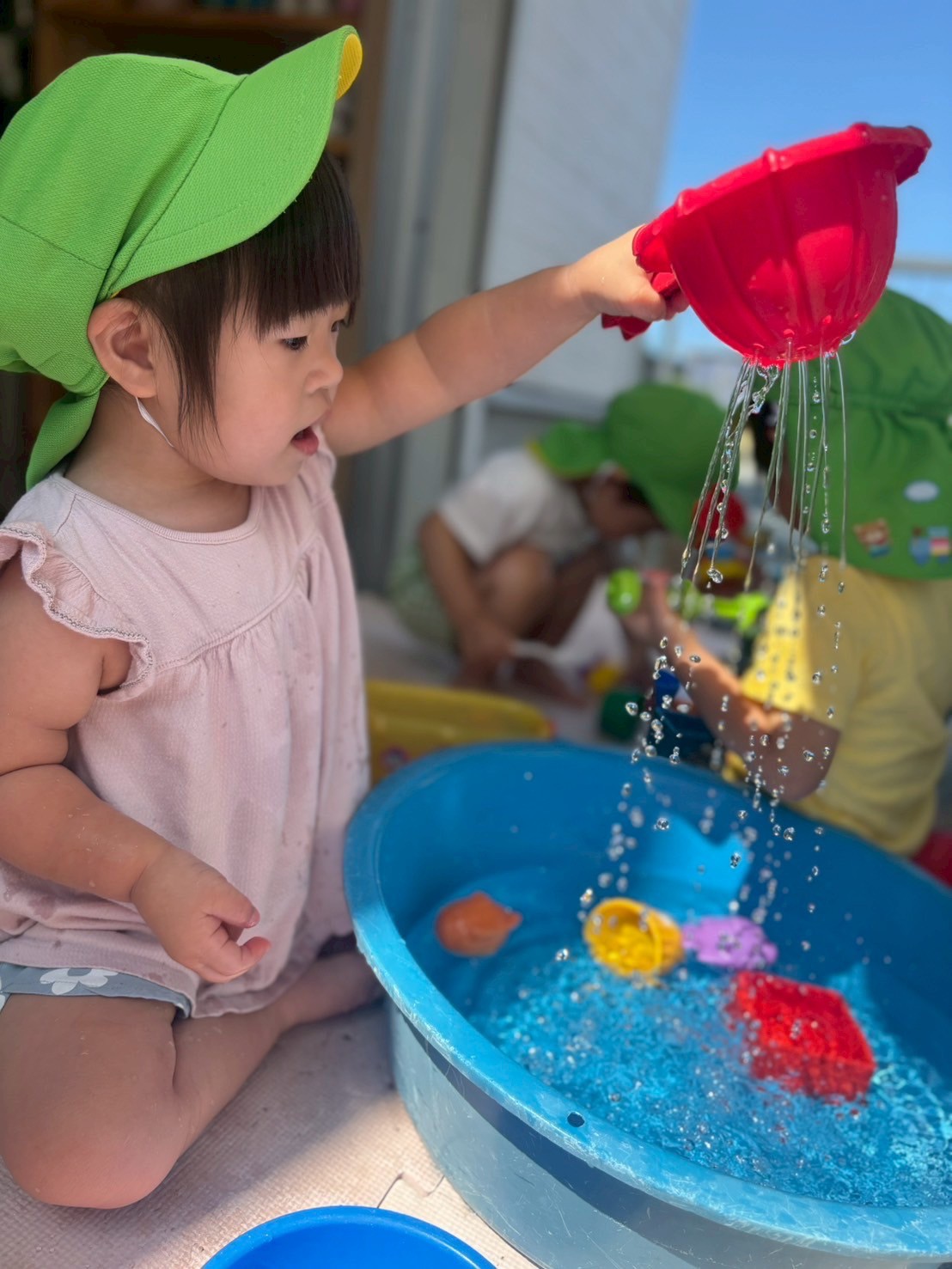 その後はブロック遊びをしながら大好きな水遊びをしました🚿💛お水の冷たい心地良さを感じながら、シャワーをしたり、スプーン🥄でお水をすくったり、思い思いの遊びを楽しみました🤗💓