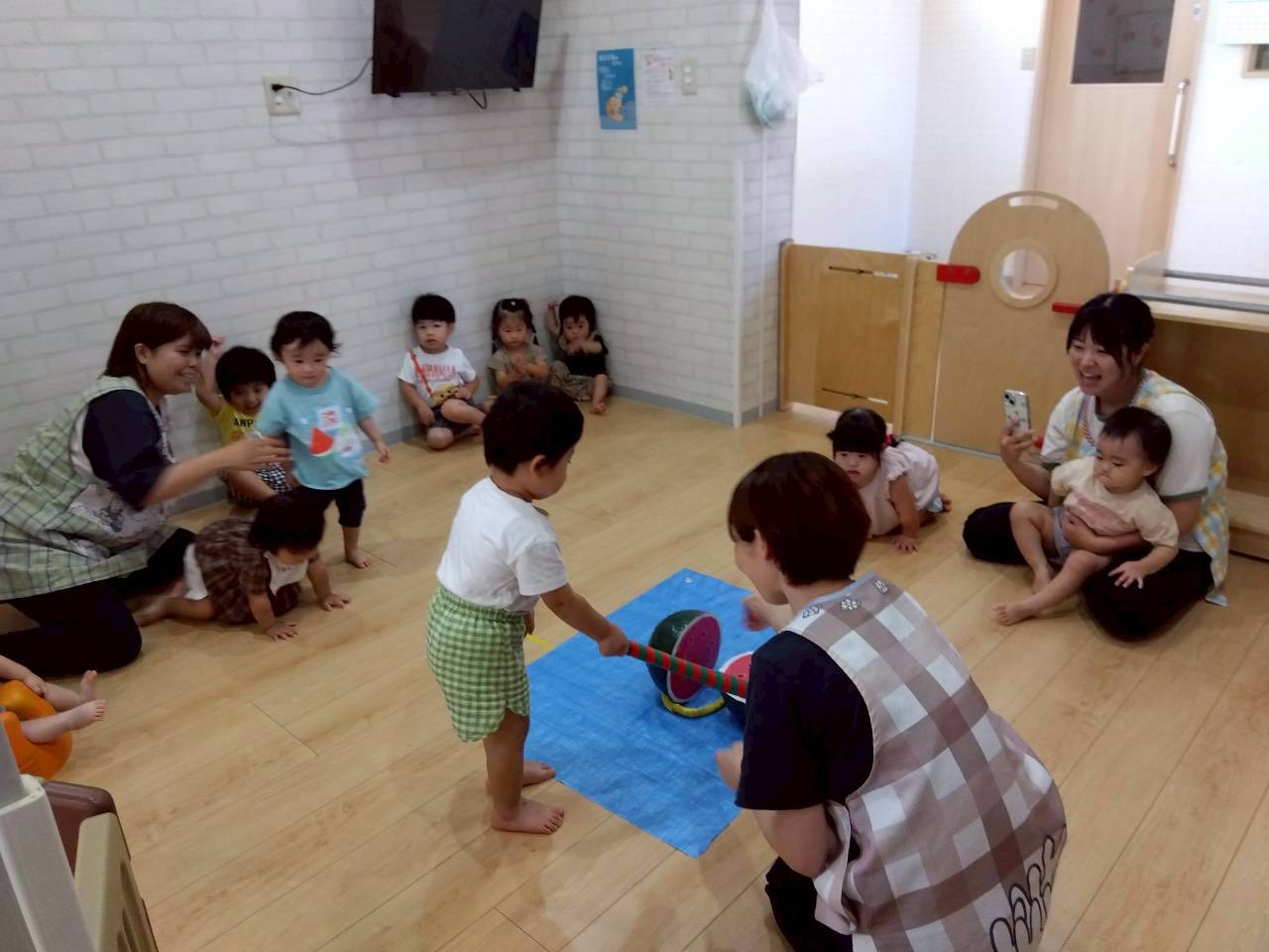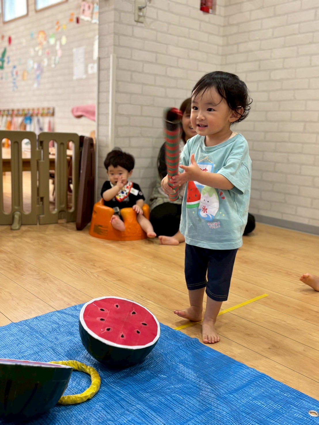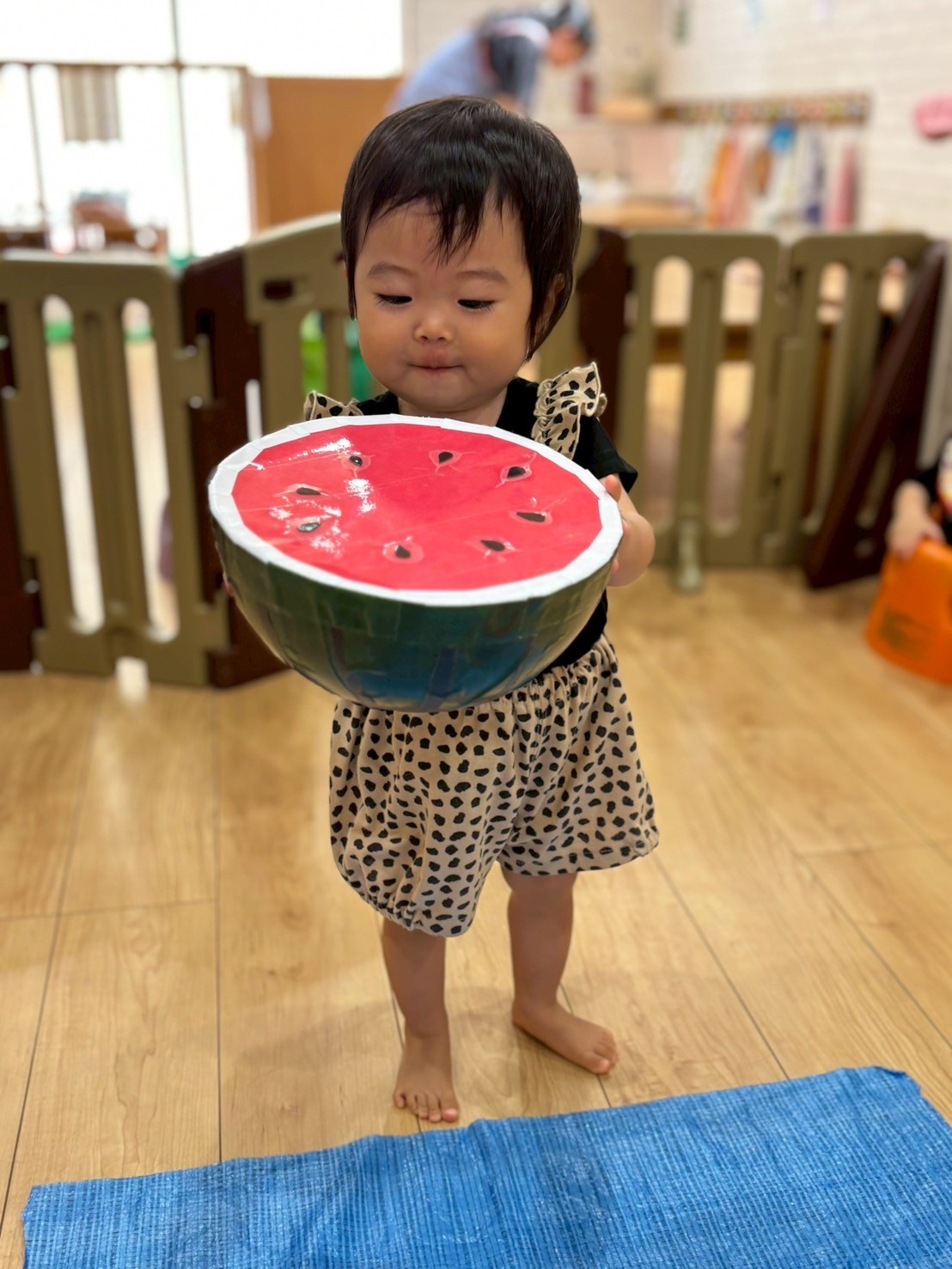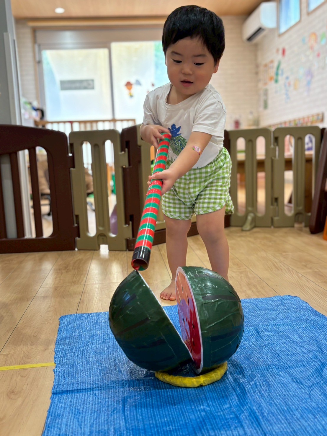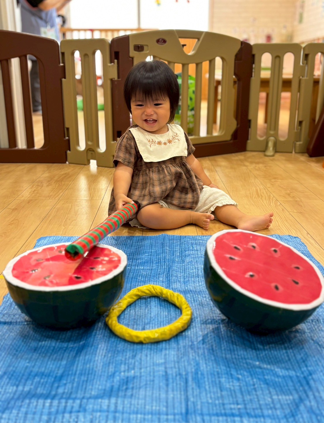今日は夏祭りごっこでスイカ割りをしました🍉みんなしっかりと順番を待って、お友だちに「がんばれ〜🙌」と応援してくれましたよ😘棒を持って、パカッとスイカが割れると嬉しそうな子ども達でした🎵最後はみんなで割った🍉をパクパク😋