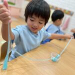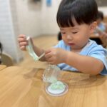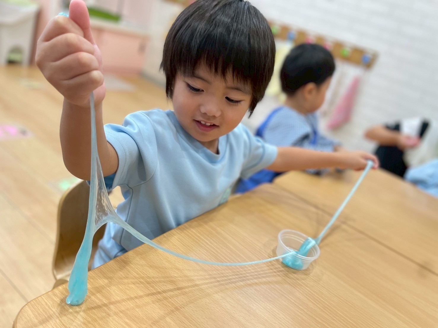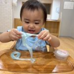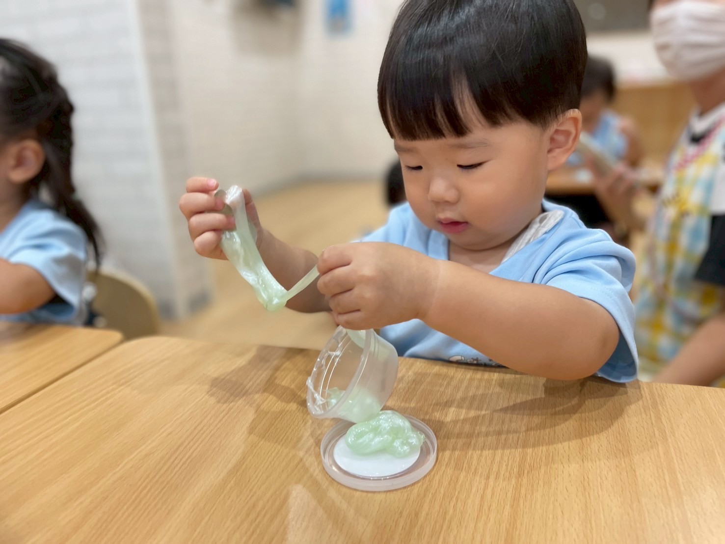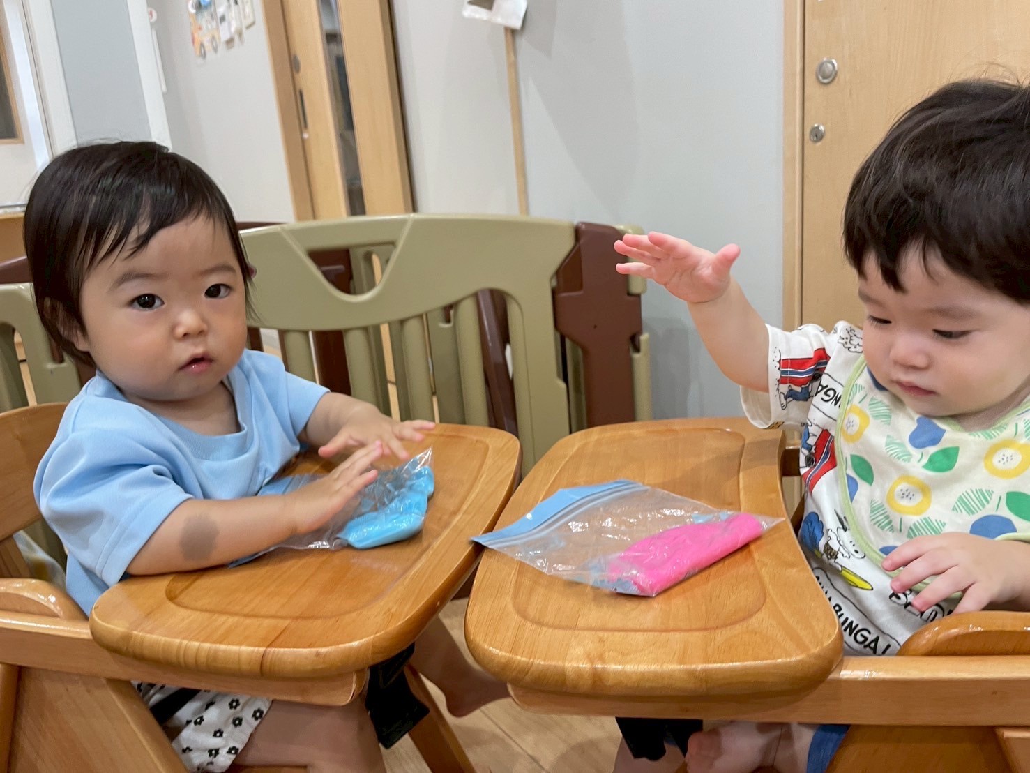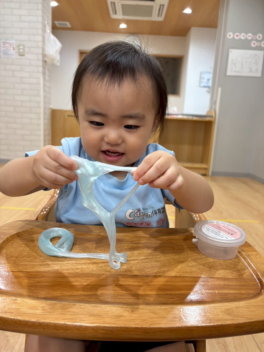好きな色を選んで、伸ばしたりちぎったり丸めたり、色を混ぜてみたりしながら、冷たさと綺麗な色に癒されて夢中で遊ぶみんなでした🥰