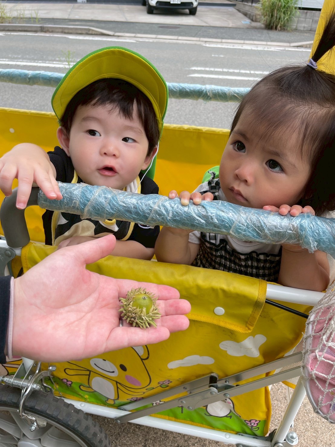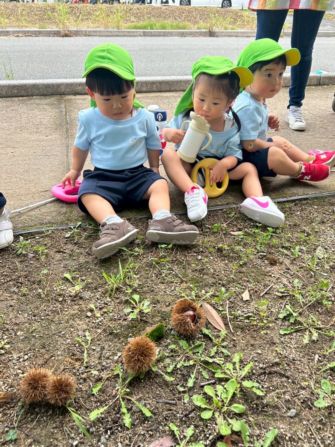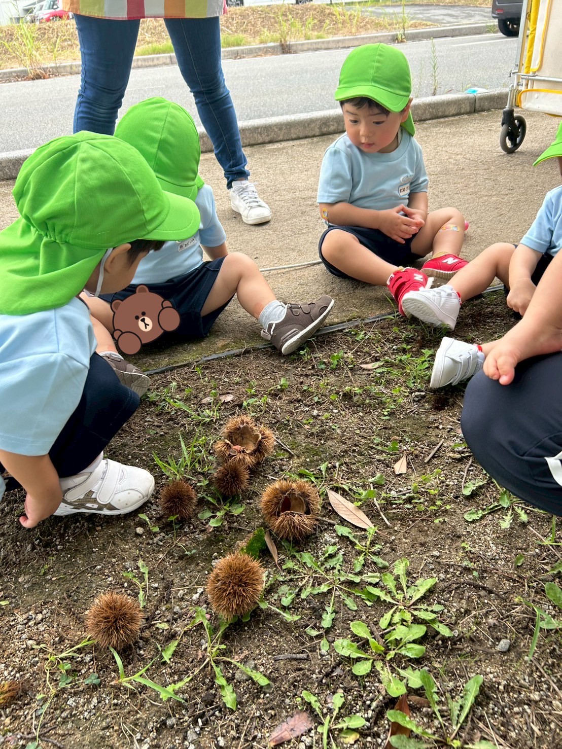 もうすっかり外は秋🍂になり、猫じゃらしや落ち葉がいっぱいありました★🌲どんぐりの木には 緑のどんぐりが見え、彼岸花、こすもすも咲いていました。また、大きな木からはイガクリ🌰も落ちていてイガにも興味津々でした✨