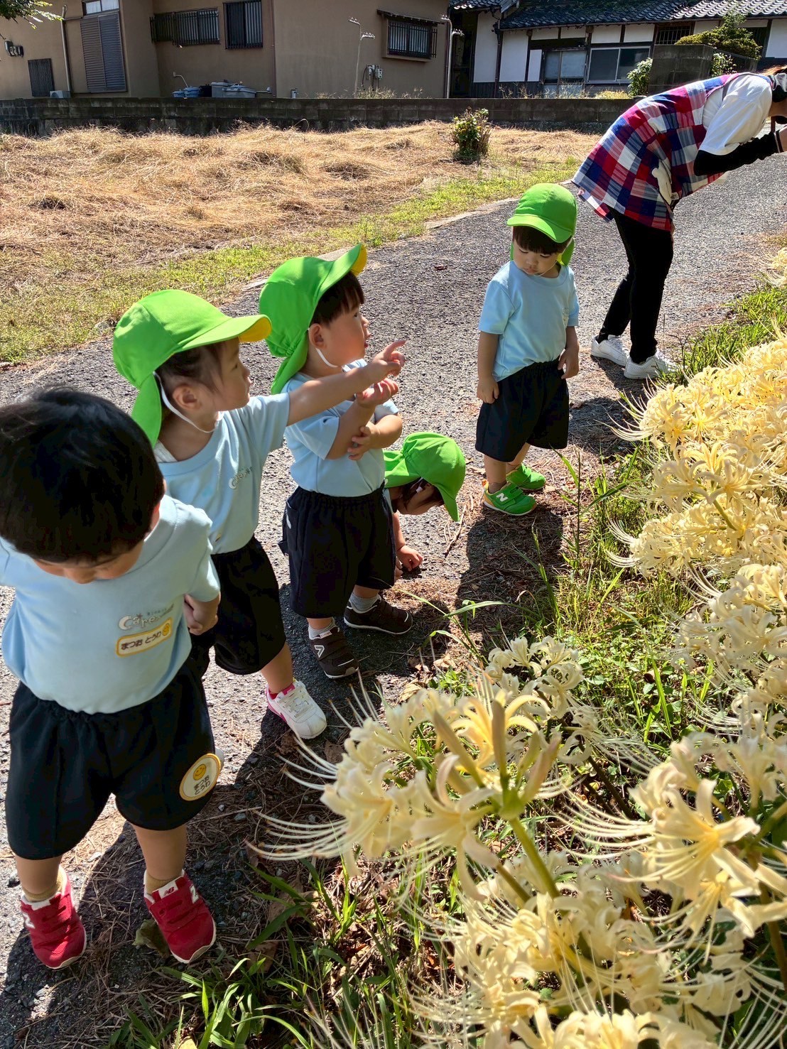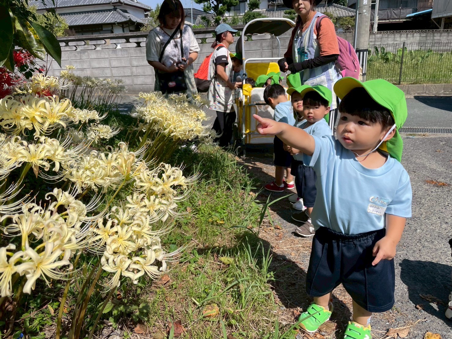 バッタ🦗を見つけて手を伸ばしたり、赤と白の彼岸花、柿を見つけて、「わぁ!」と指差したり…😊