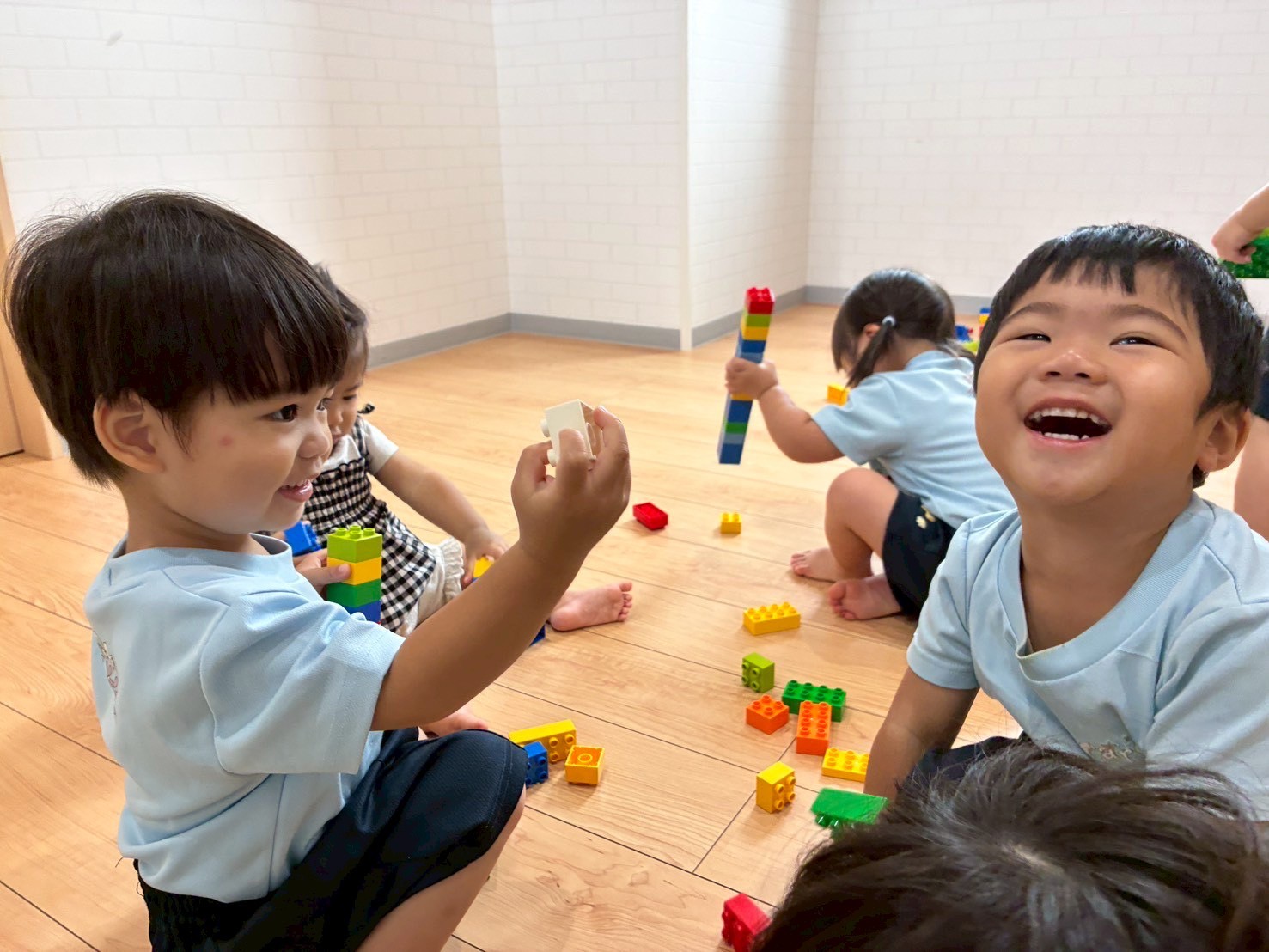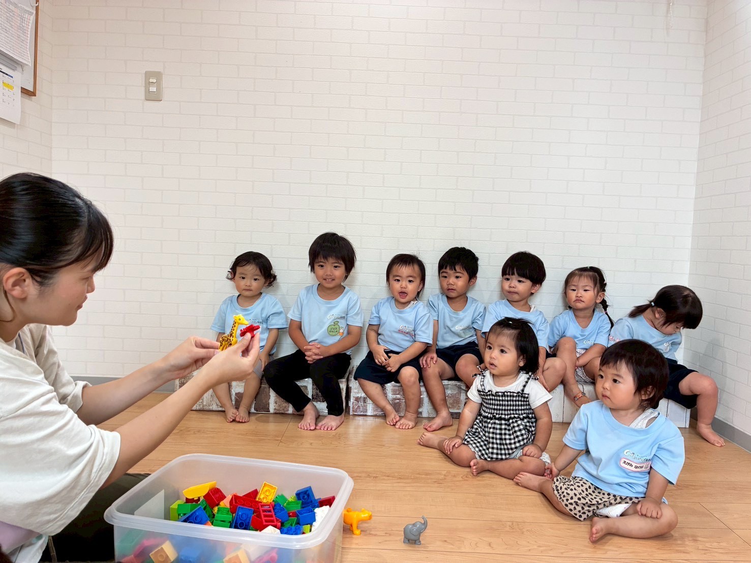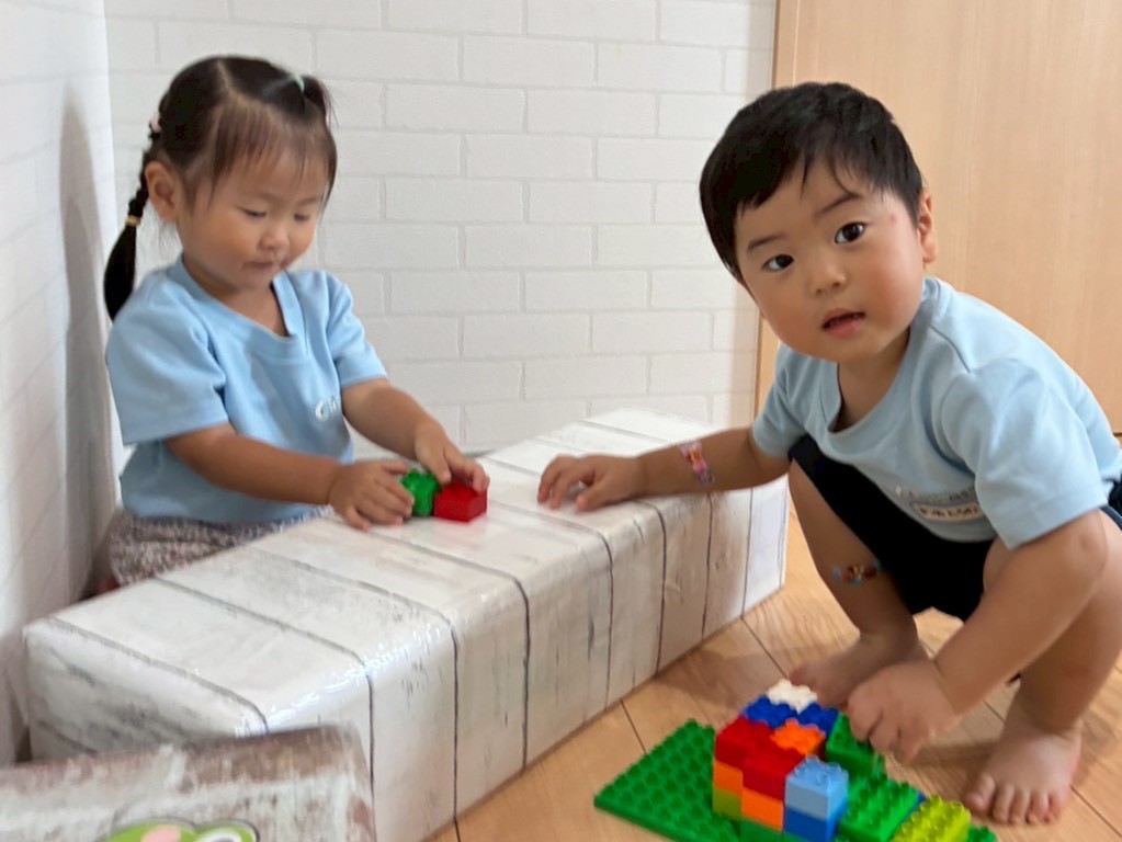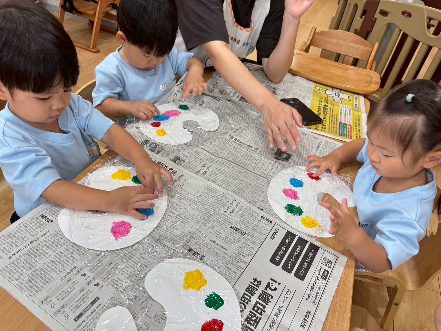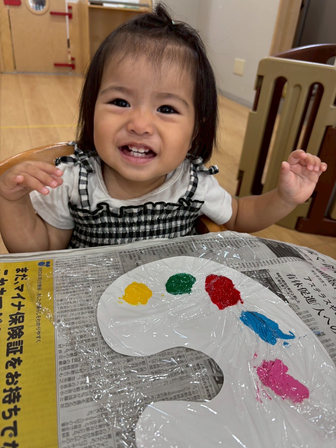 手には絵の具が付かない体験に「なんでー?😧」と不思議そうなお顔の子ども達でした🤭ブロック遊び🧱では、「かして」「どうぞ」のやり取りをしながら遊ぶ様子も💕
