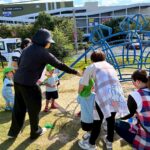 ボール遊びや砂遊びを楽しんでいると…不審者が登場😳💦お菓子を差し出されると、少し戸惑う子や思わず手を伸ばしてしまう子もいましたが、保育者の声かけや周りのお友だちの様子をみて、「知らない人からは貰わない❗️」というお約束を思い出し、しっかり拒否する事ができました💪✨