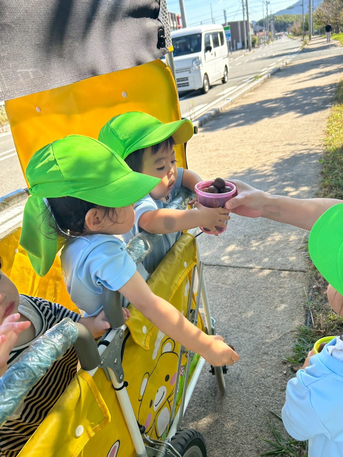 バスに手を振ったり、車の色を答えたりたくさんのおしゃべりをしながら保育園に帰りましたよ🏠