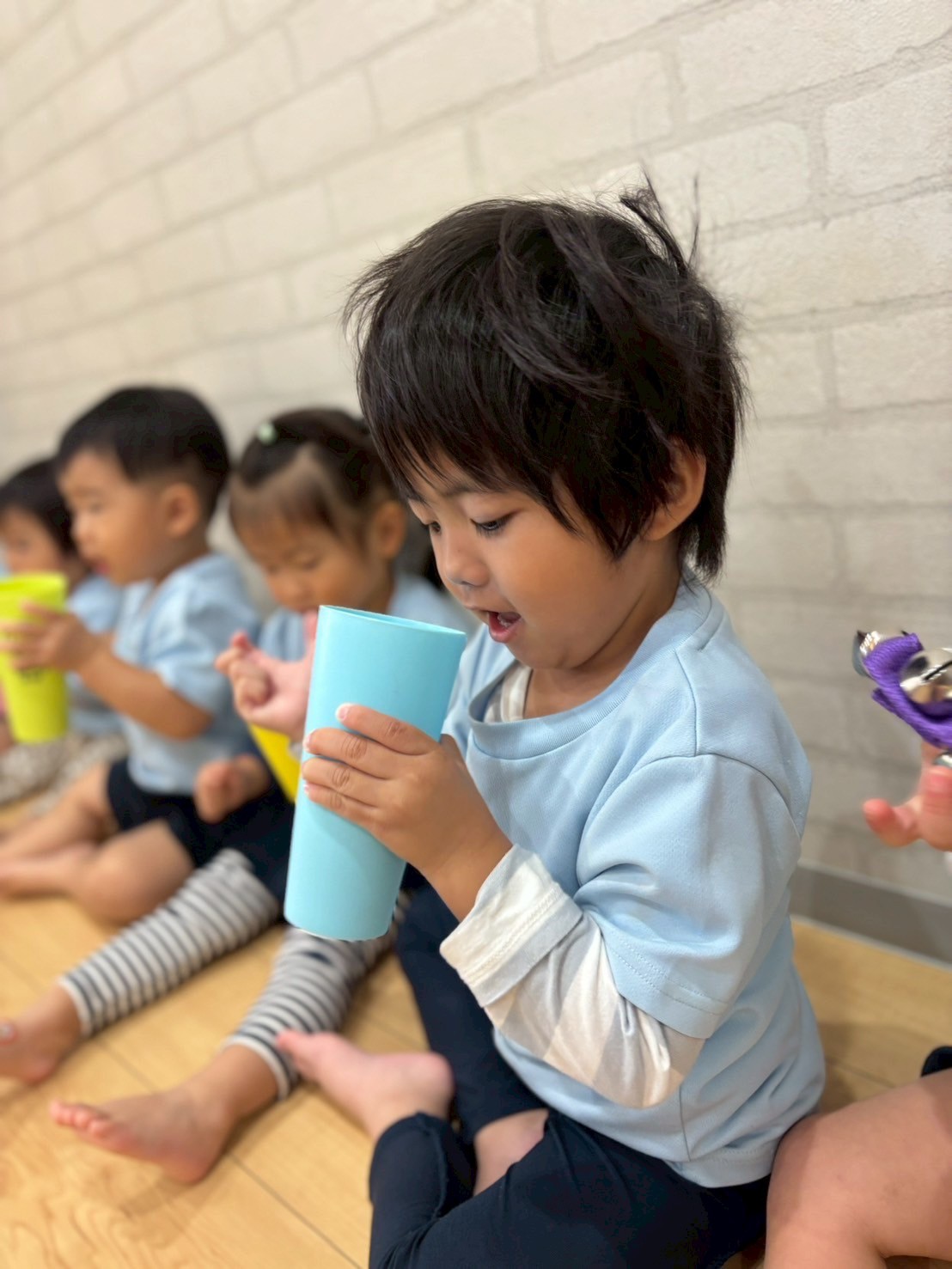 好きな色の鈴を選びシャンシャン鳴らした後はカップに入れて音の違いを学びました🎵カラーリングで大好きなバスごっこもしましたよ🚌まゆみ先生に沢山褒めてもらい嬉しそうな子ども達でした🥰