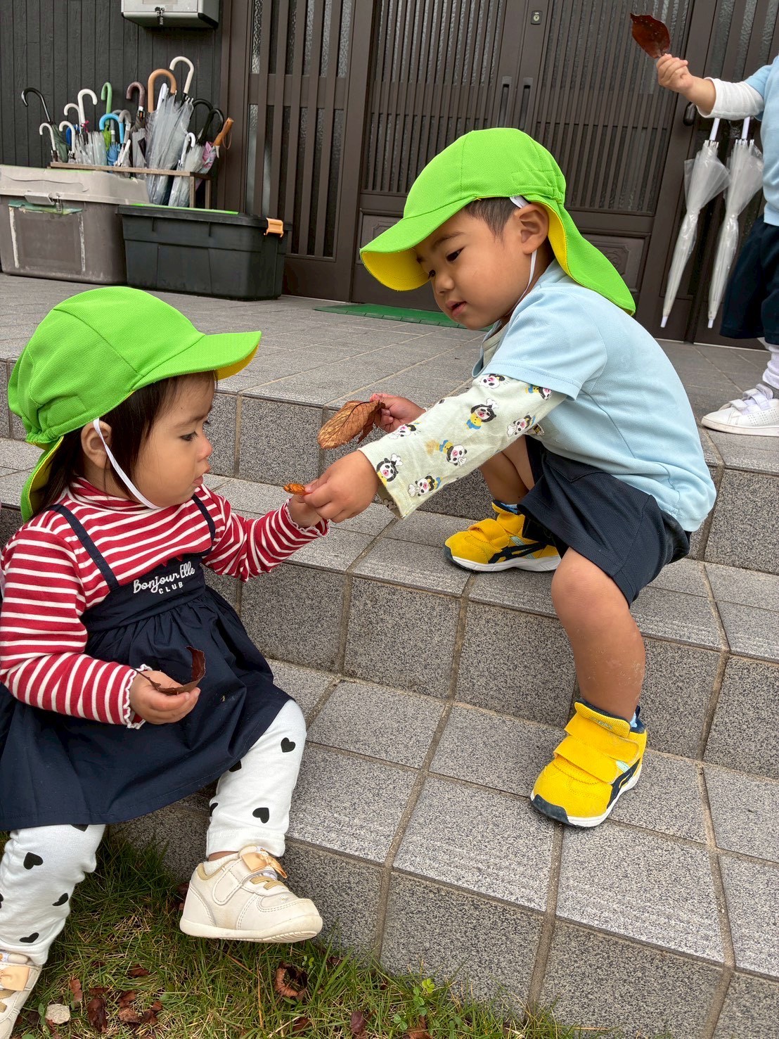 自然にたっぷり触れて過ごしました🐜✨0歳児さんも、階段に座り枯葉を千切って感触を楽しんでいました😊🍂