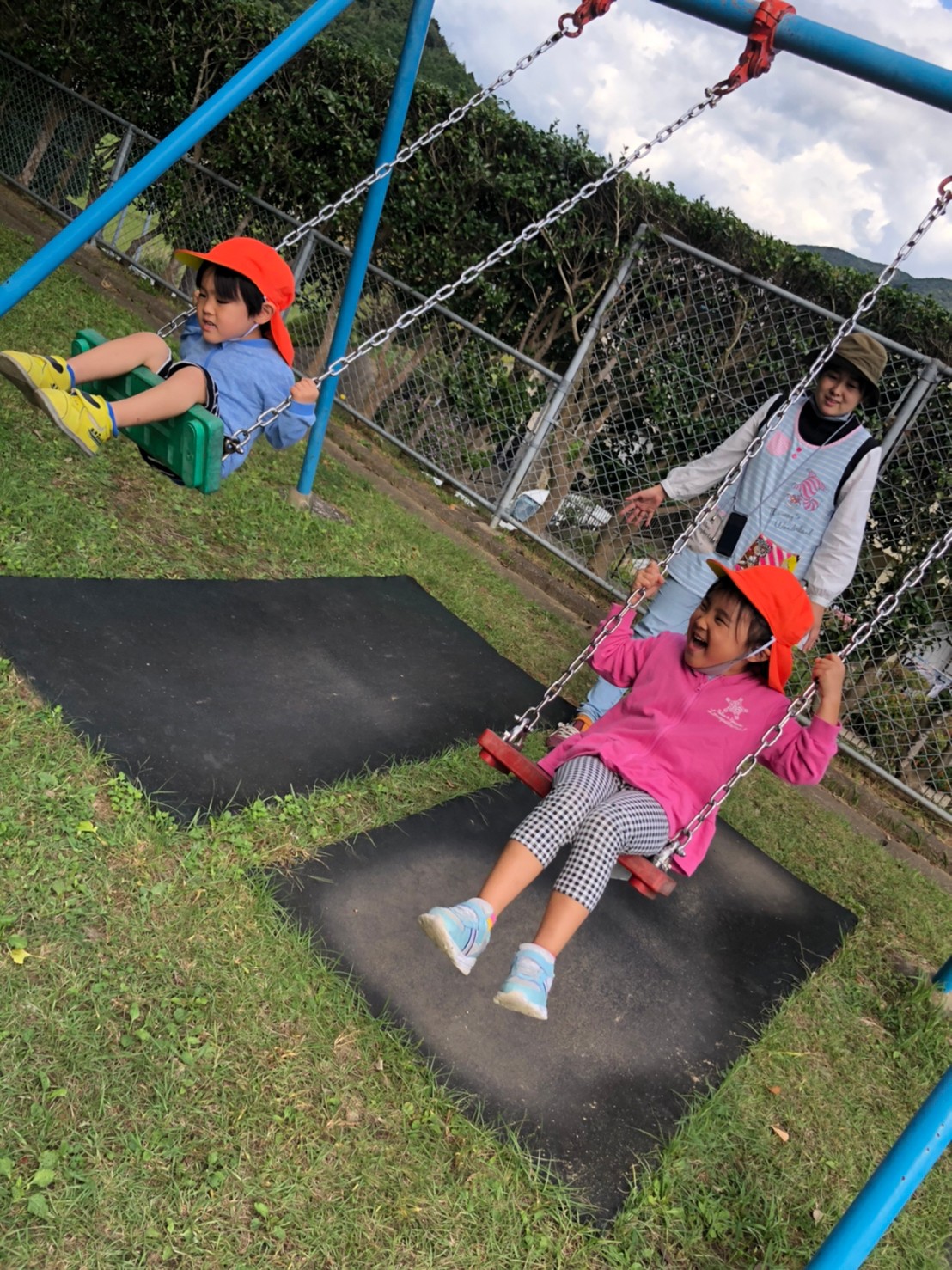 ブランコや滑り台、ターザンロープなどの遊具で遊んだり、先生と鬼ごっこをして公園遊びを目一杯楽しみました。🍓😁❤️