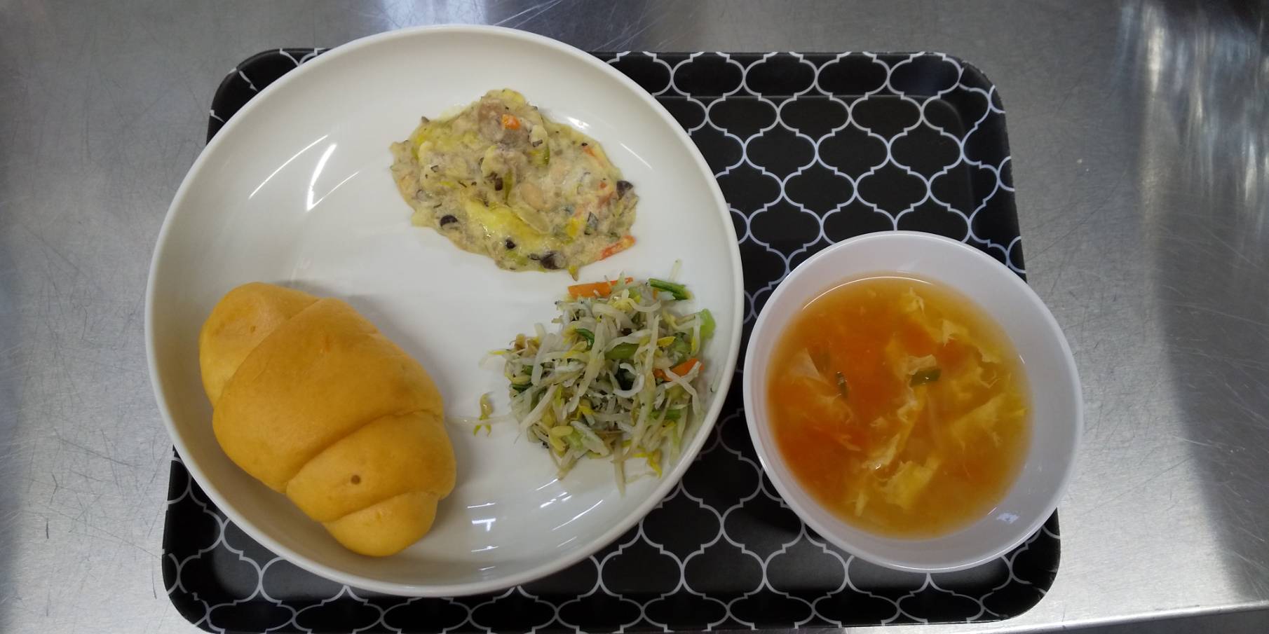 今日は、長い絵本の読み聞かせを聞きました。ストーリーの内容も理解しているようで、終わった後に感想をそれぞれ話して、共感し合う姿も見られました。その後は室内でマットや鉄棒をして過ごしました。体操教室で教わった内容を確認しながら体を動かし楽しみました。🌸【今日のくりえいと園の給食です】