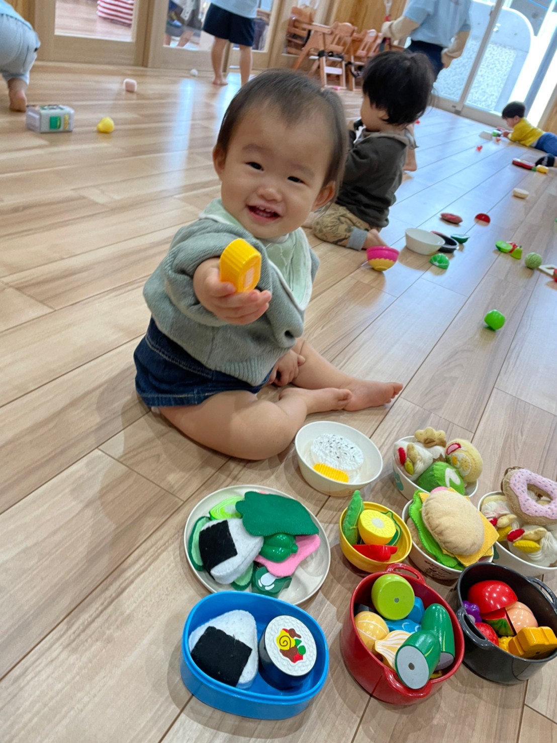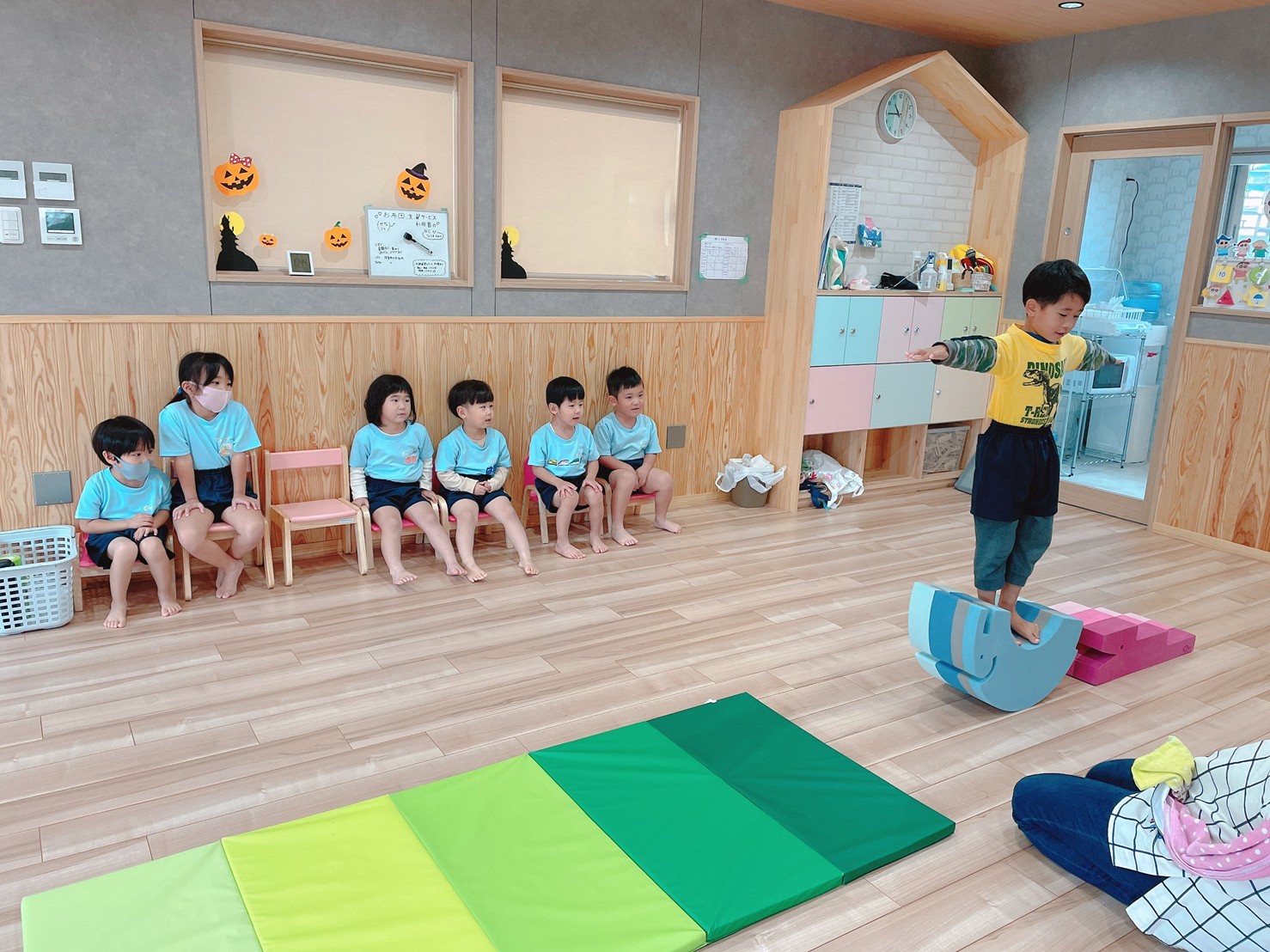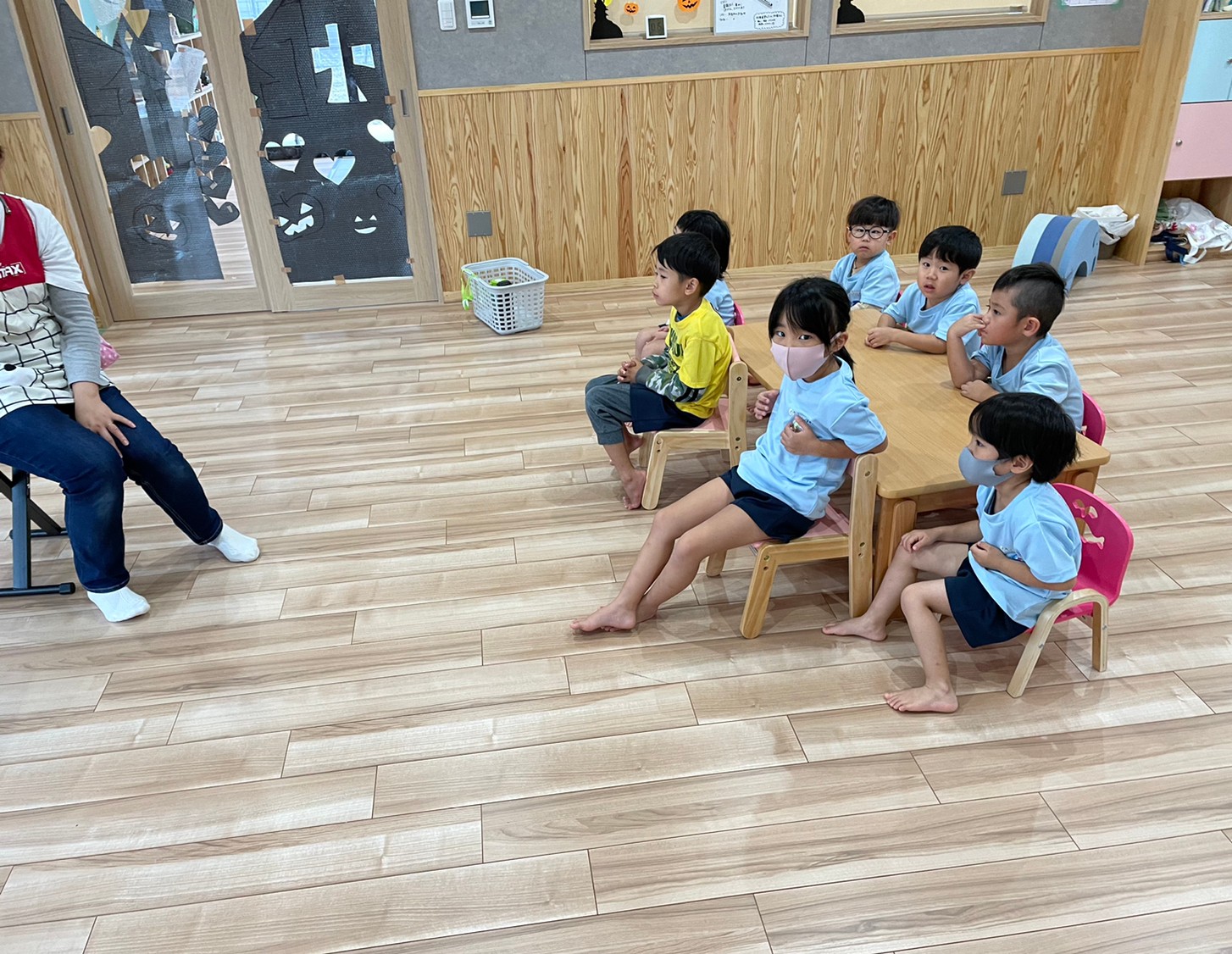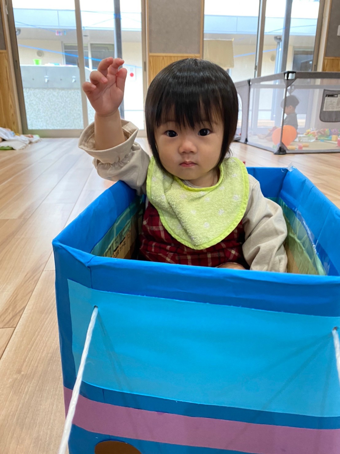 今日は室内でダンボール電車に乗って遊んだり、だるまさんの大きな絵本の読み聞かせをして、先生の真似をしながら体を揺らしてリズムに乗って聞いていました🐣(りす、ぱんだ組🐿🐼)