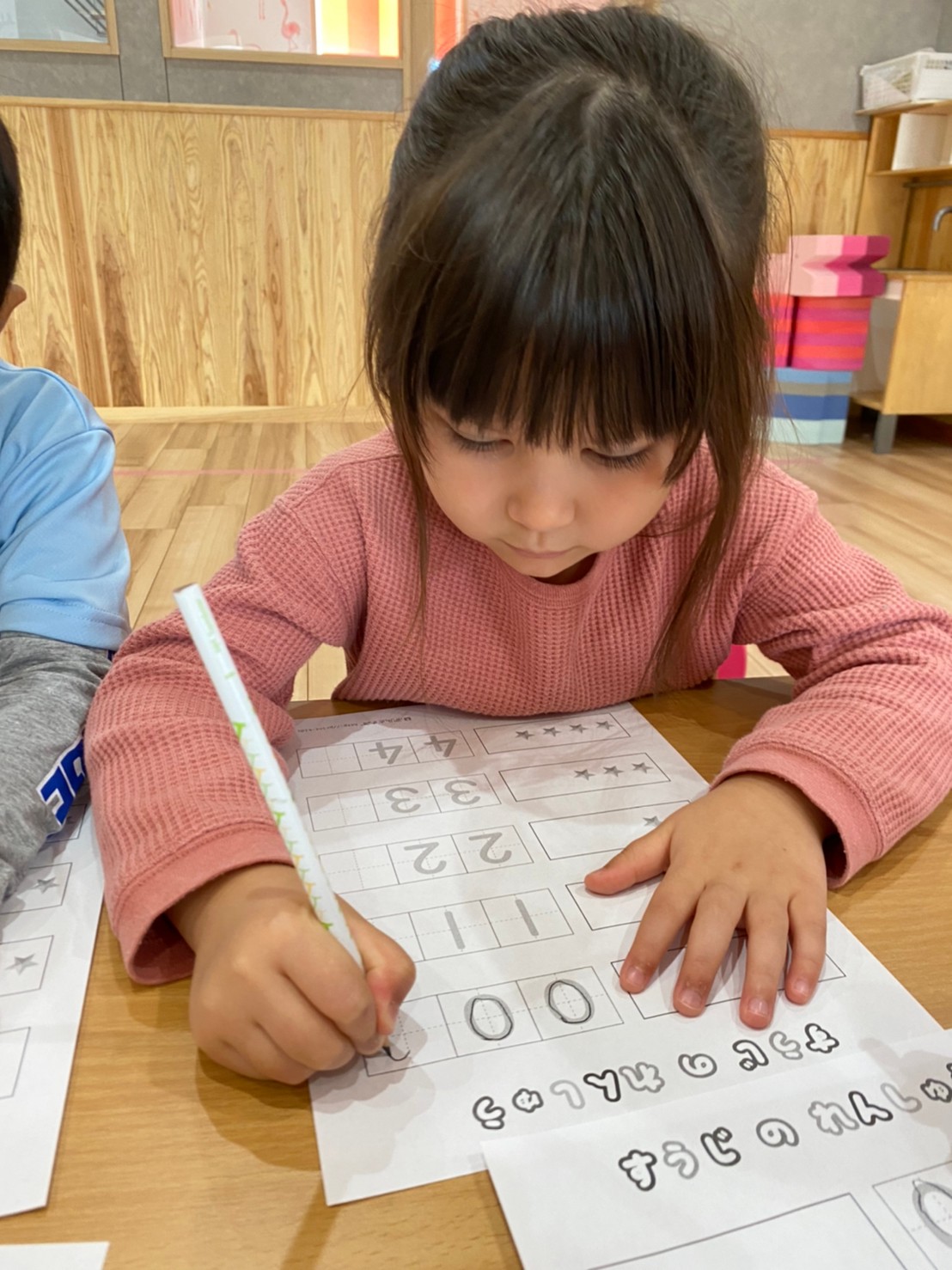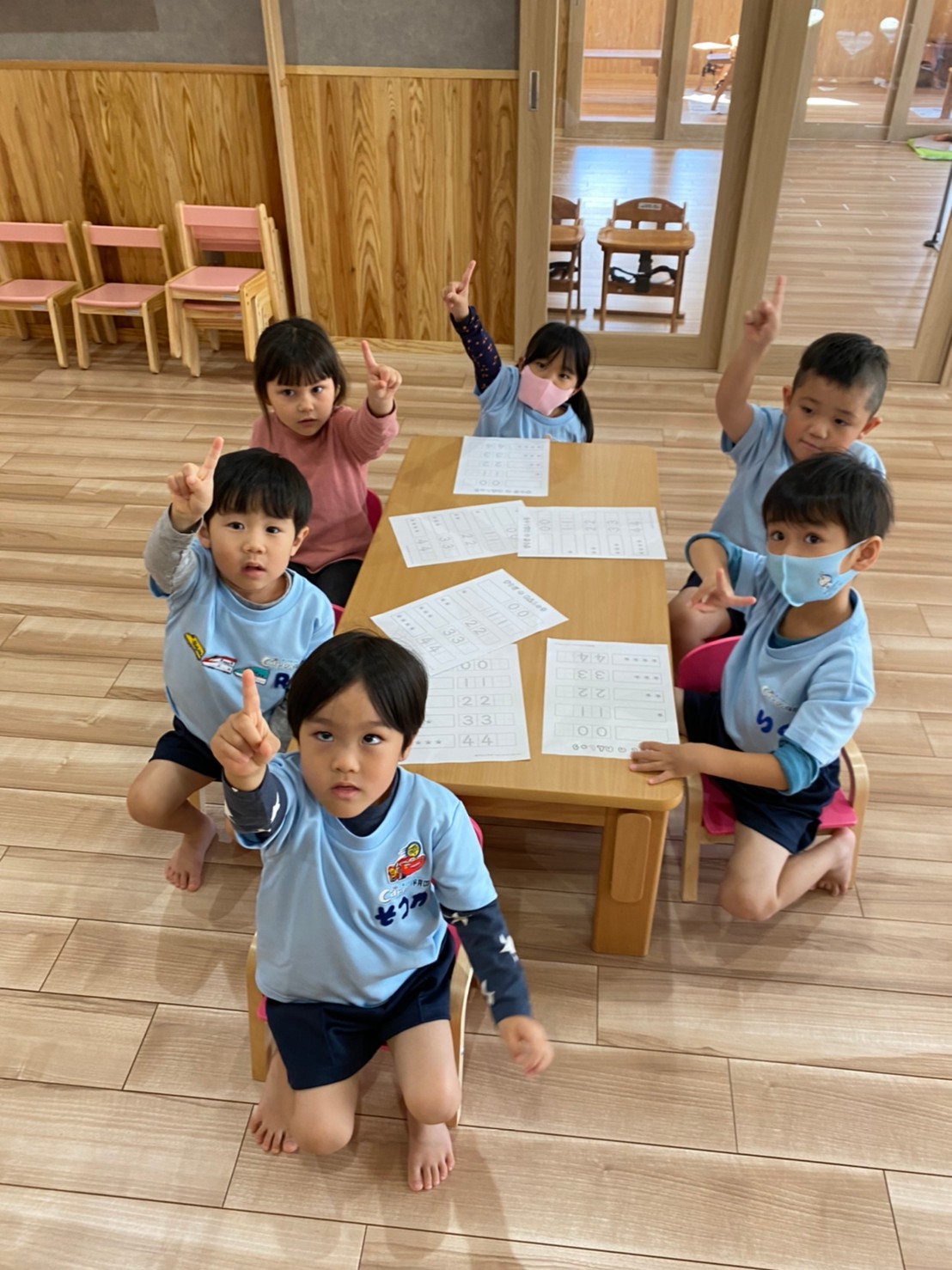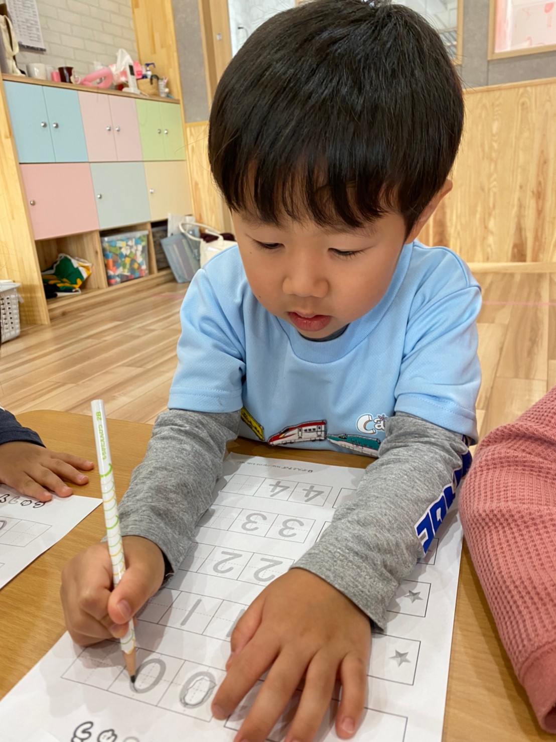 今日は数字の練習をしました。空中に書き順の練習をしてプリントをすると、正しい書き順で進めることができていました。数字を書きながら進める迷路では、楽しみながら進めることができました。その後は園庭で新しいスコップやバケツを使ってごっこ遊びを楽しみました☺️❤️