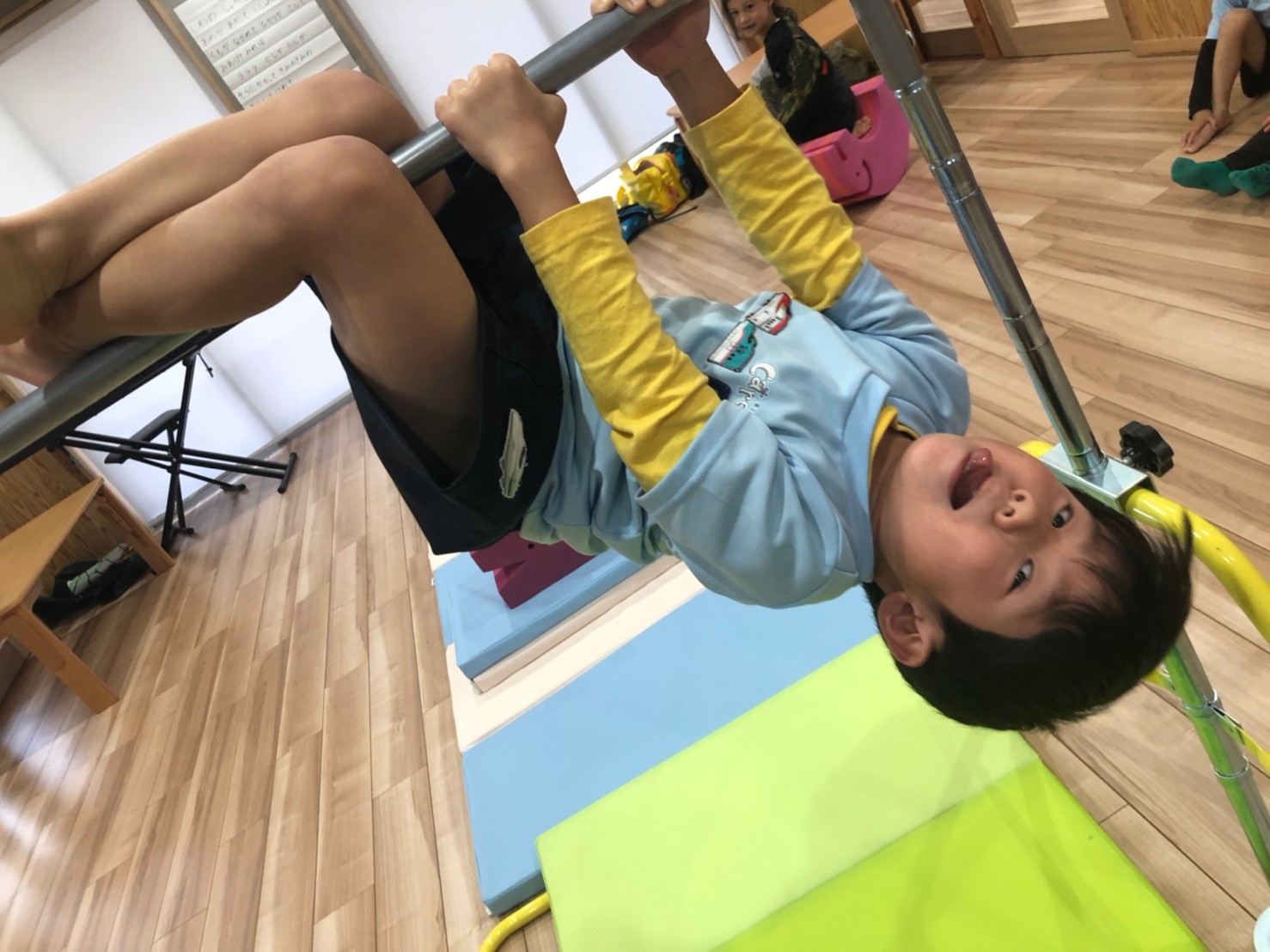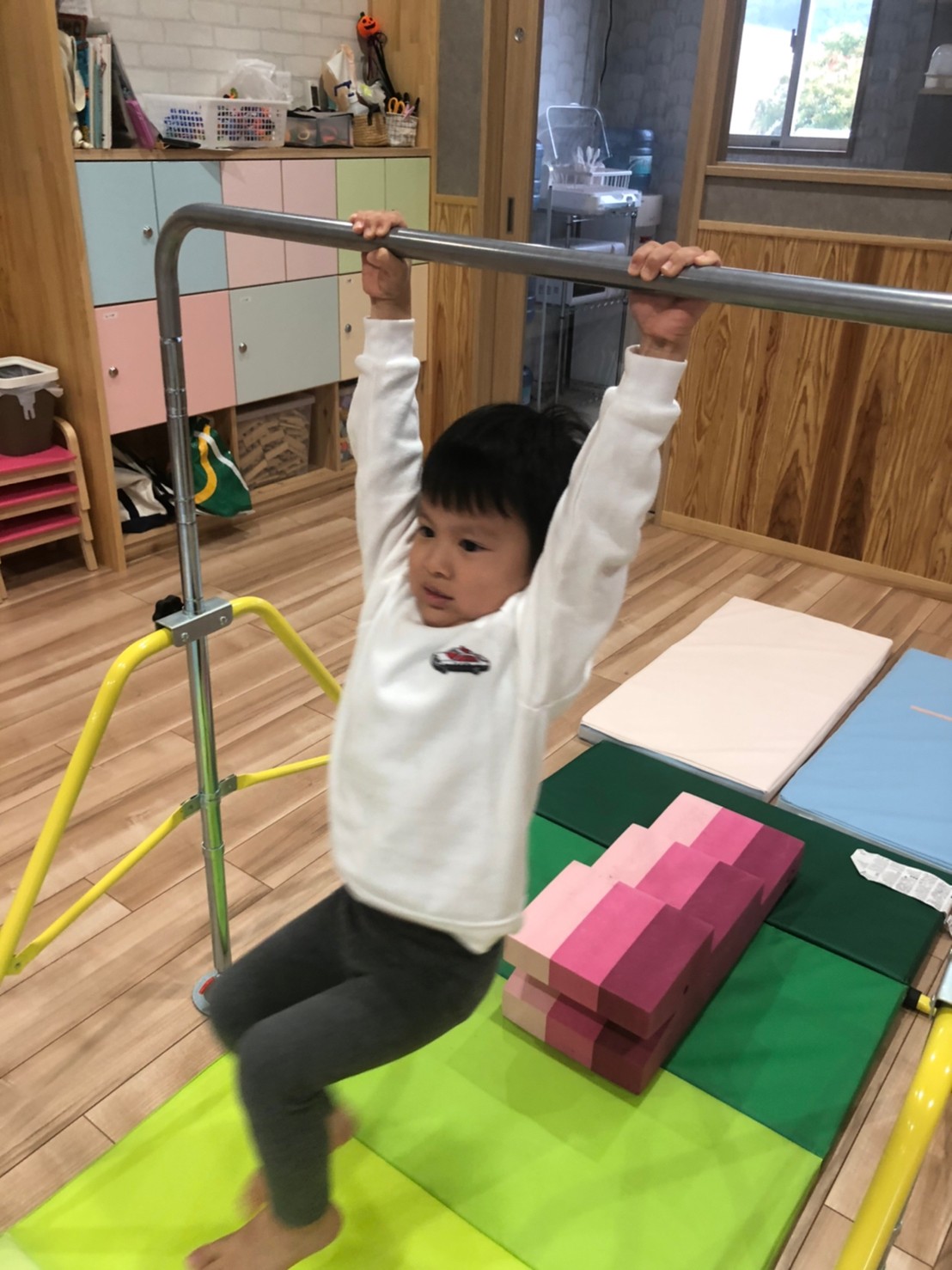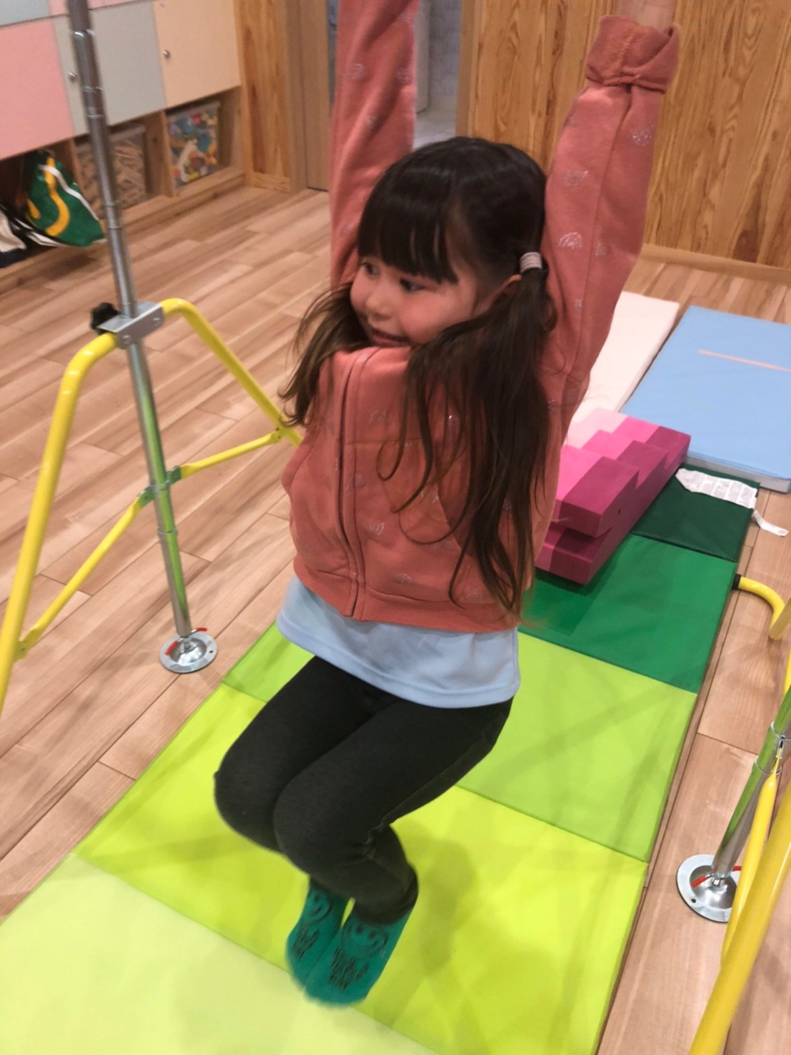 (うさぎ、こあら、きりん) 今日は運動遊びた音楽に合わせてリズム遊びをしました!♪サーキット運動で、鉄棒やマット、トランポリンをしました。みんな一生懸命鉄棒にぶら下がったり挑戦していました!リズム遊びではみんな音楽に合わせてノリノリでジャンプやけんけんをして楽しみました!👍