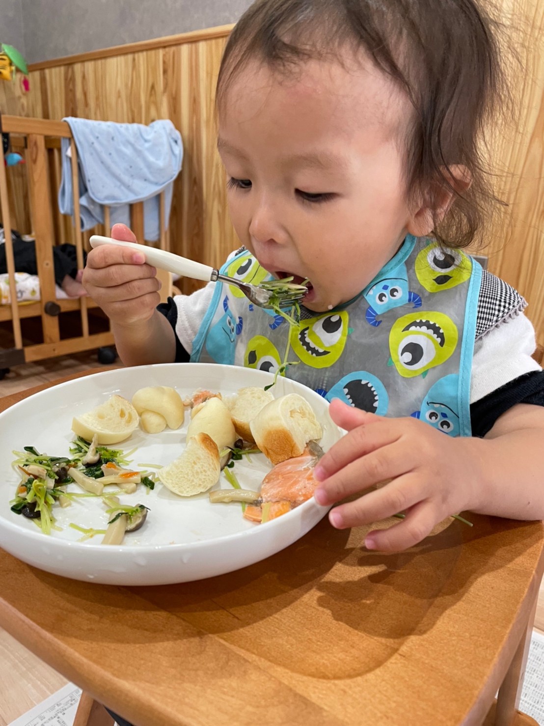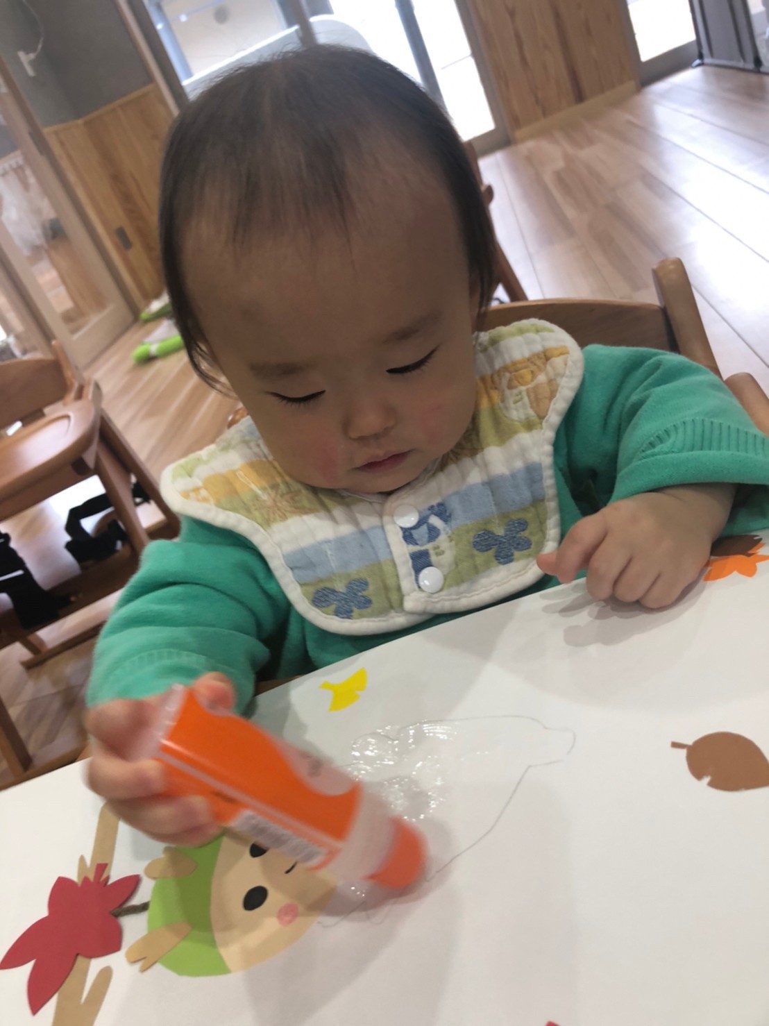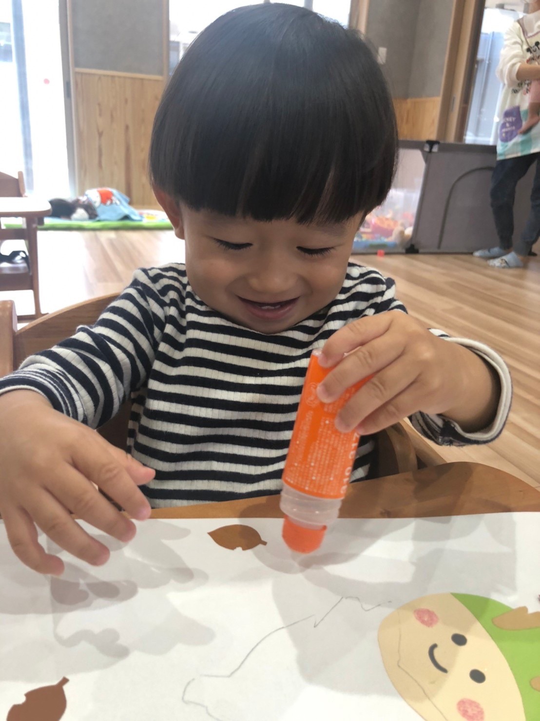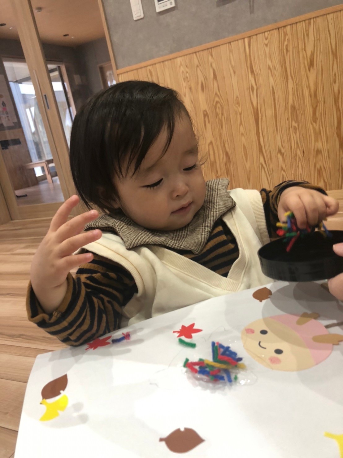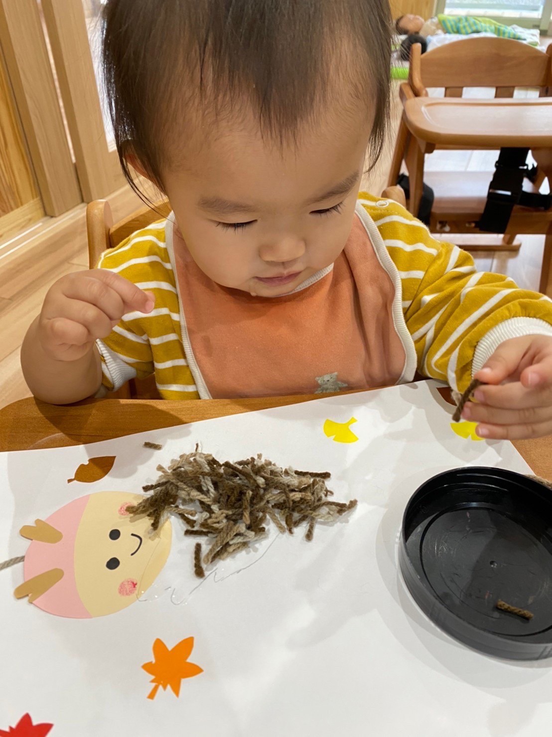 (ひよこ🐣) 今日は11月の制作をしました!💛 のりを塗って毛糸をパラパラかける作業を集中して取り組むことができていました。そのあとはおもちゃで遊んだり、おままごとをして楽しく過ごしました💖