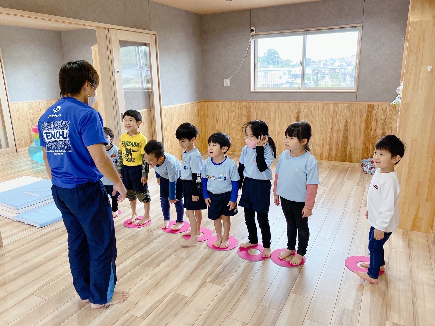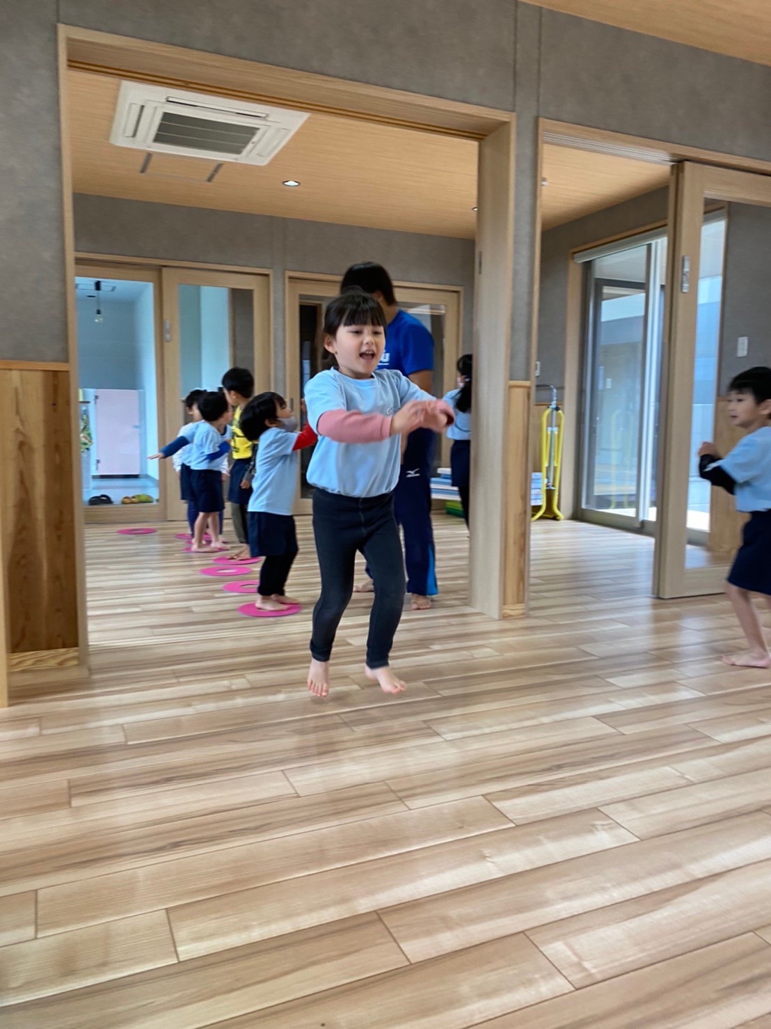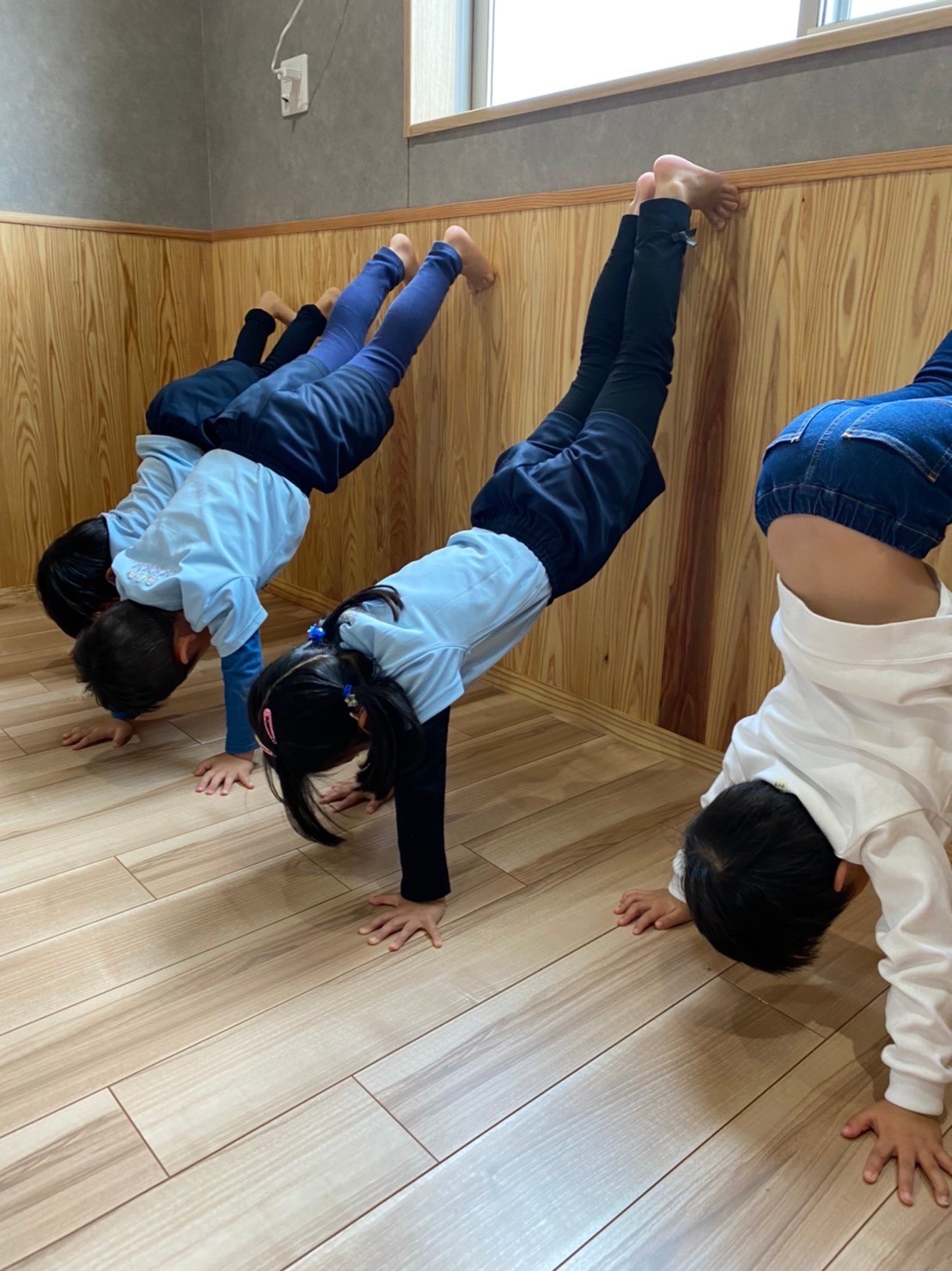 (うさぎ、こあら、きりん組)今日は体操教室に参加しました。大好きな動物歩きを楽しんだ後、壁倒立や、マット、鉄棒をしました。講師の話をよく聞き、楽しみながら参加することができていました☺その後は外遊びをしたり、園の前の道路工事を見学して楽しみました。初めて見る工事車両を調べると、何度も名前を確認して、覚えている子もいました。(^^♪
