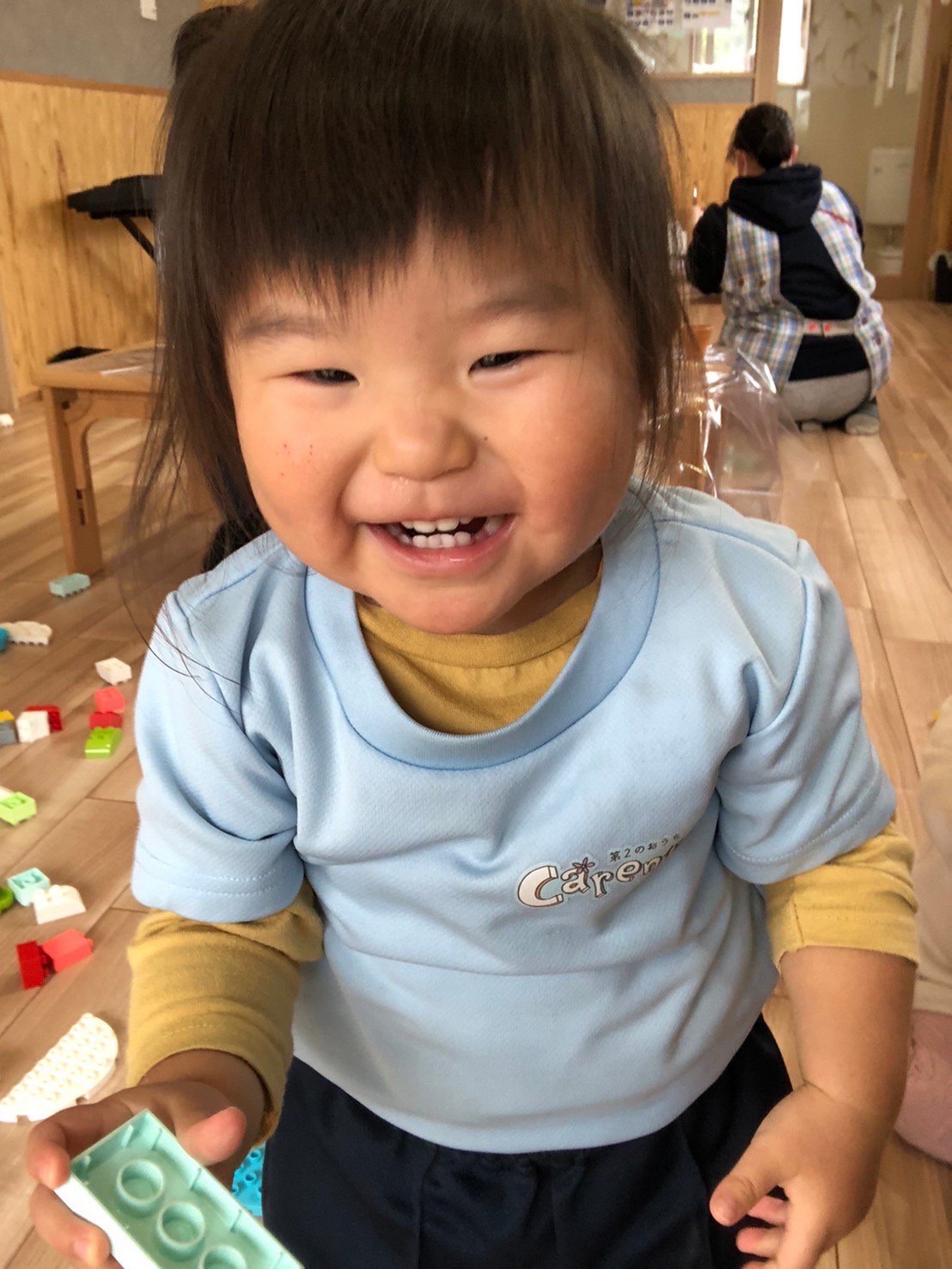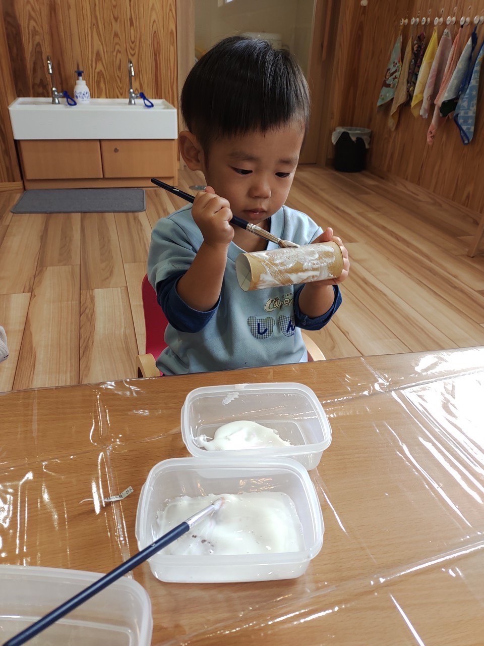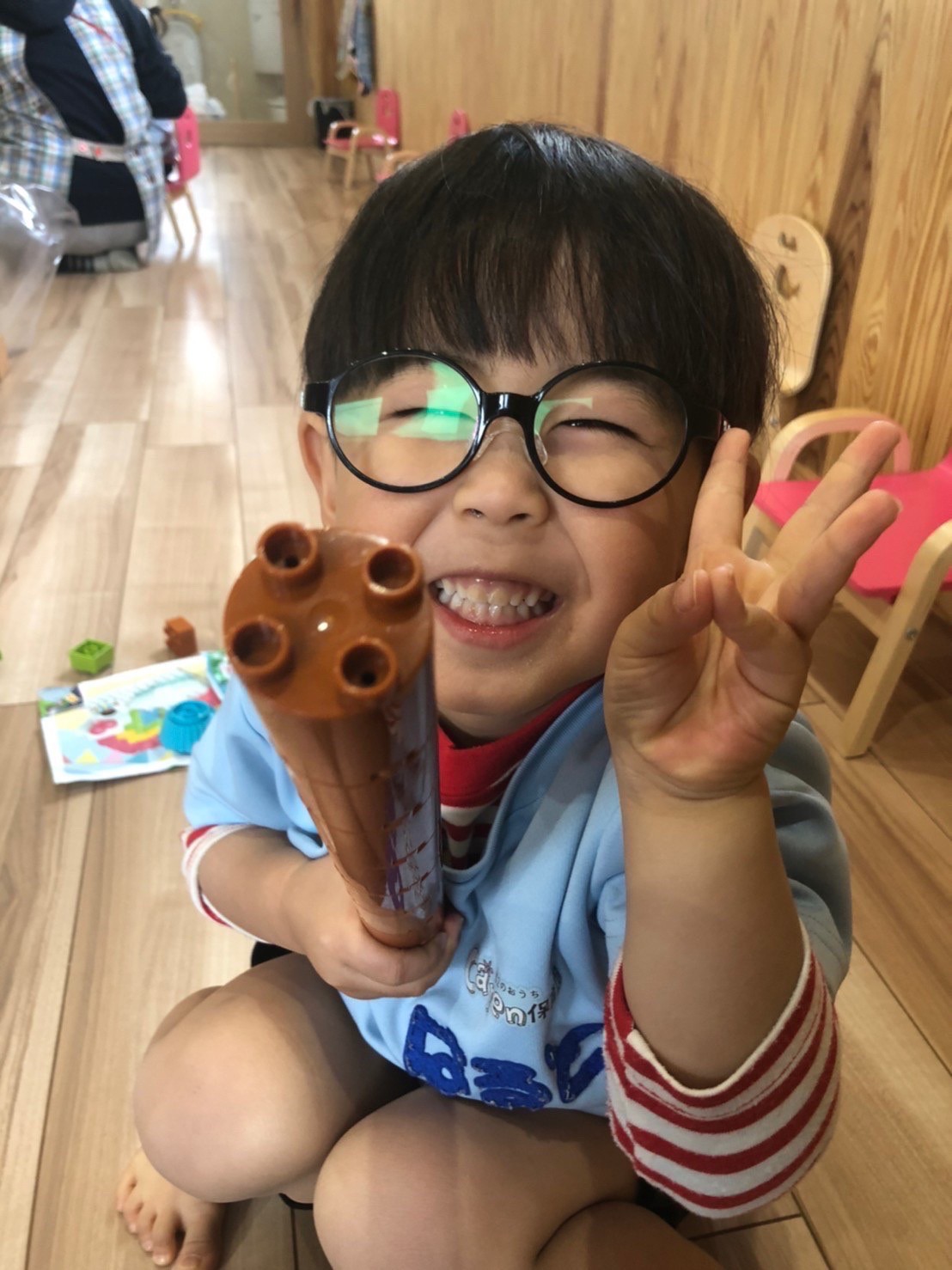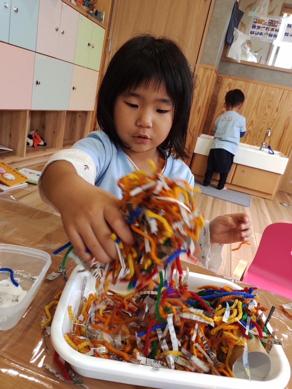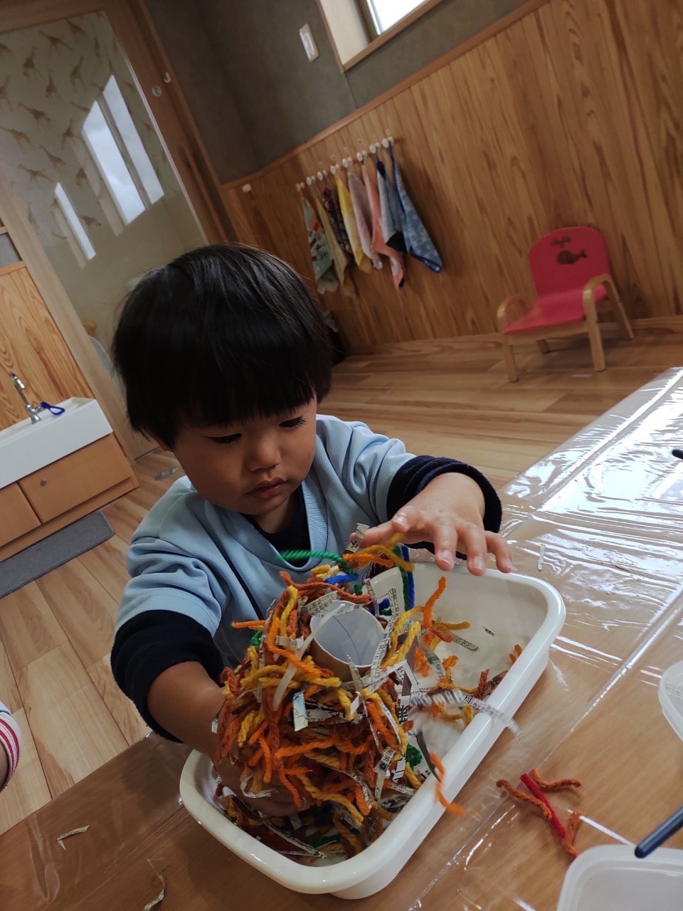 りす組は、保育士と一緒にボンドを塗ったり毛糸や新聞紙を一緒にパラパラして作りました。製作後はレゴブロックをして遊びました💖