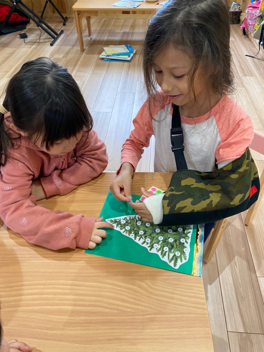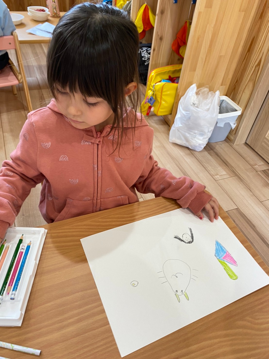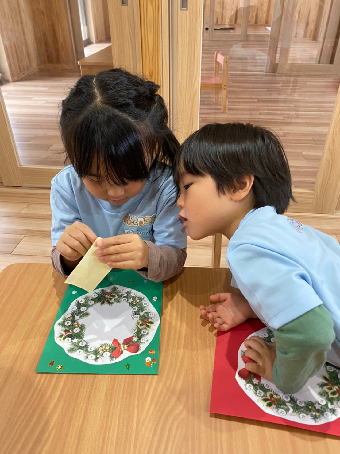 (うさぎ、こあら、きりん組)今日は昨日作ったアドベントカレンダーにシールを貼りました🥰クリスマス🎄まで後何日か数えながら心待ちにしている様子の子どもたちでした。その後は大きな画用紙に自由画を描きました。一人一人の好きなものや、興味のあるものなどを自由に絵に描き、楽しみました🥰