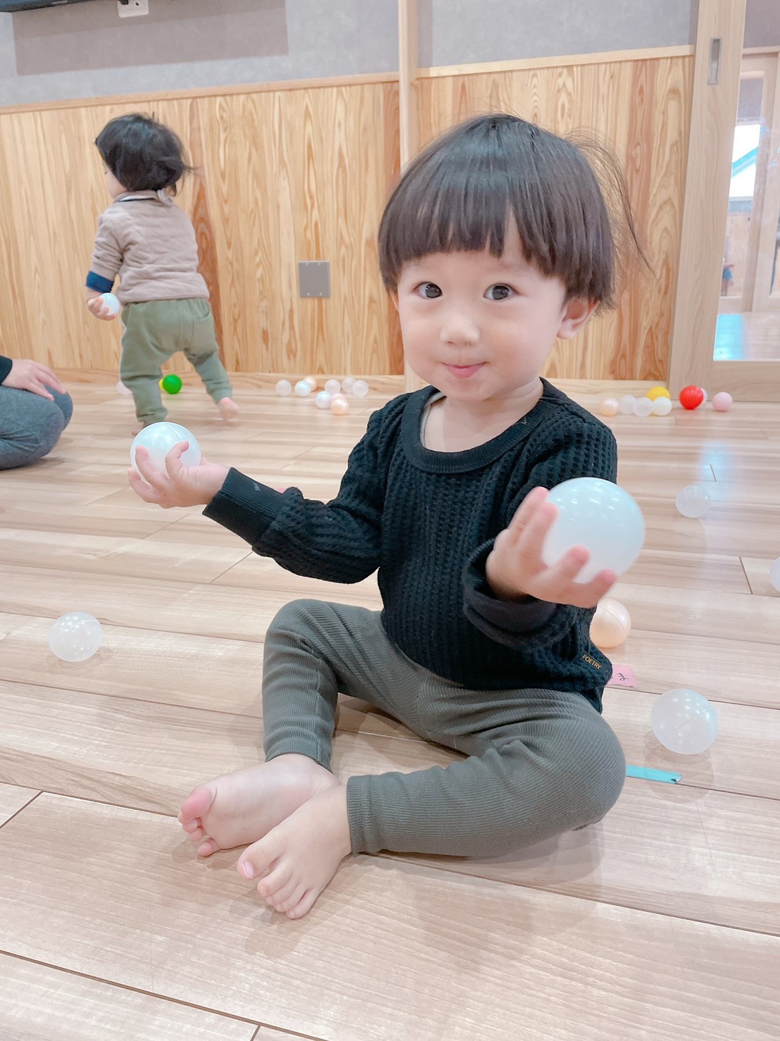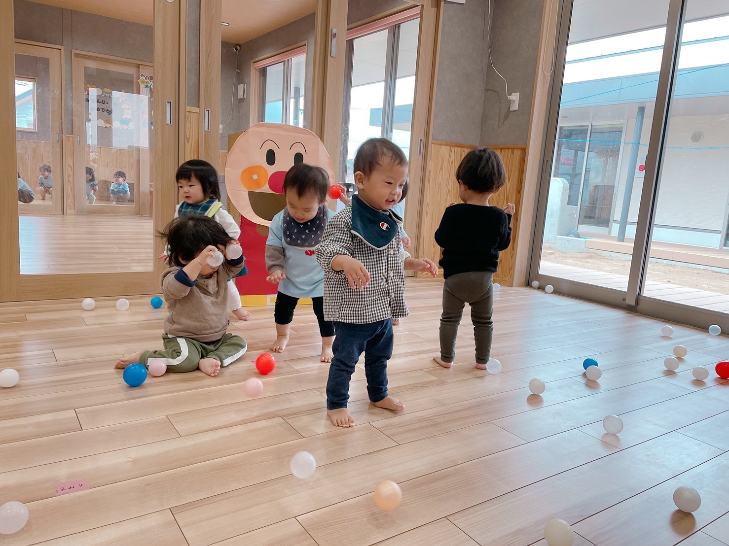 (ひよこ組) 今日はお部屋を移動してアンパンマン体操を踊って体を沢山動かした後に、ボール遊びをしました✨♡ アンパンマンダンボールの口にぽいぽいとボールを入れたり、投げたりして遊びました🥎✨🥰