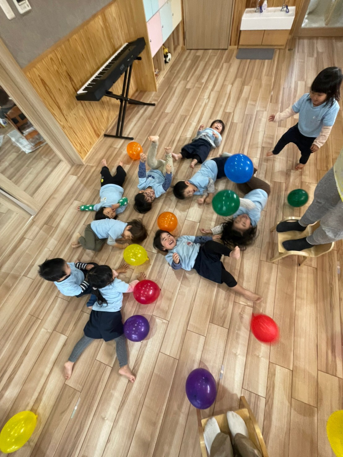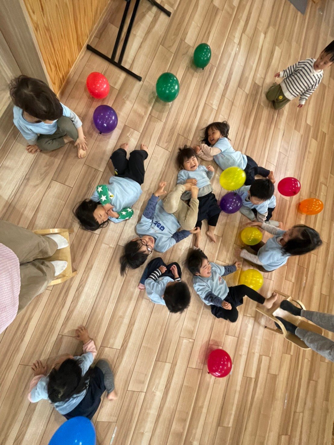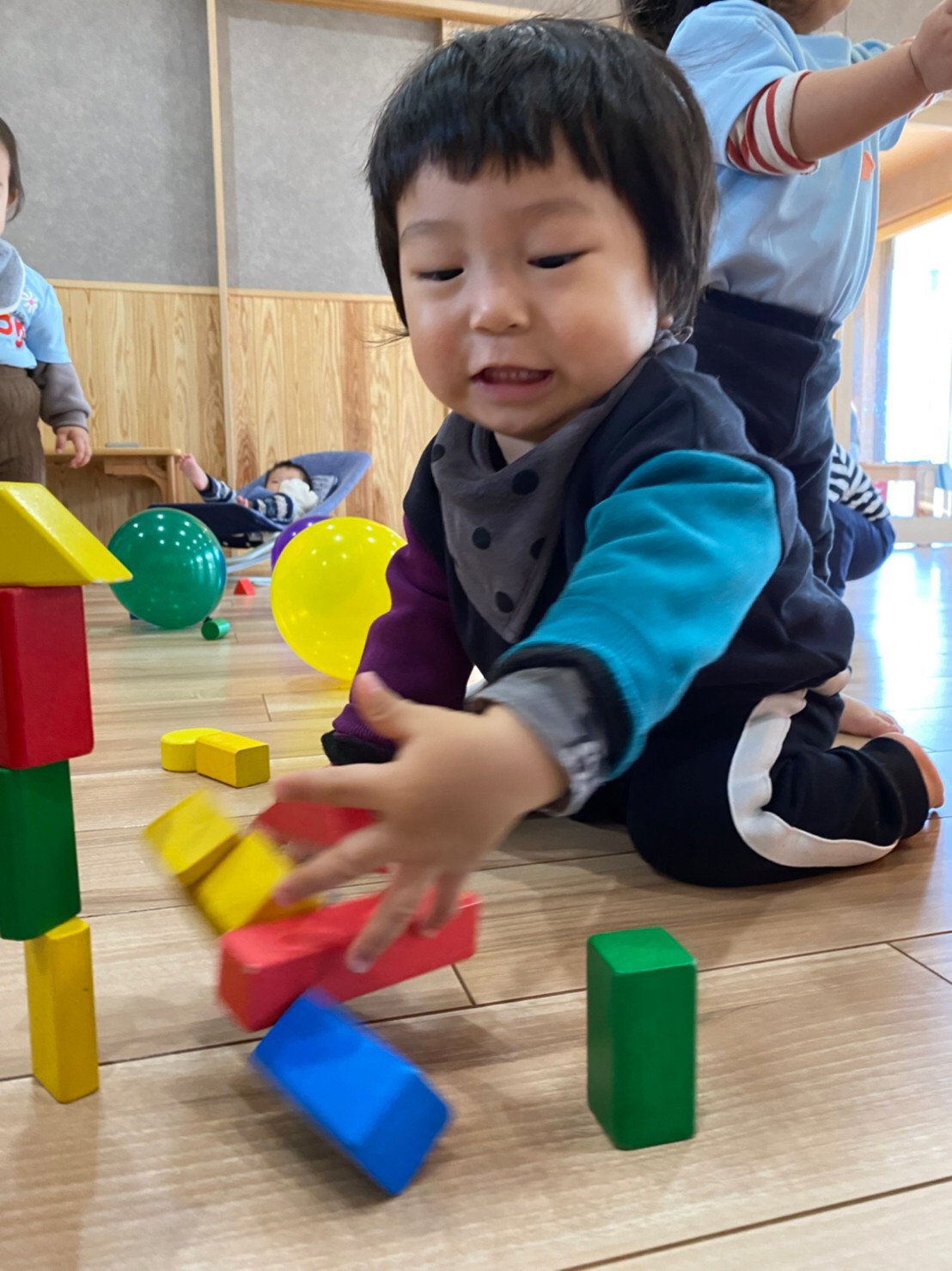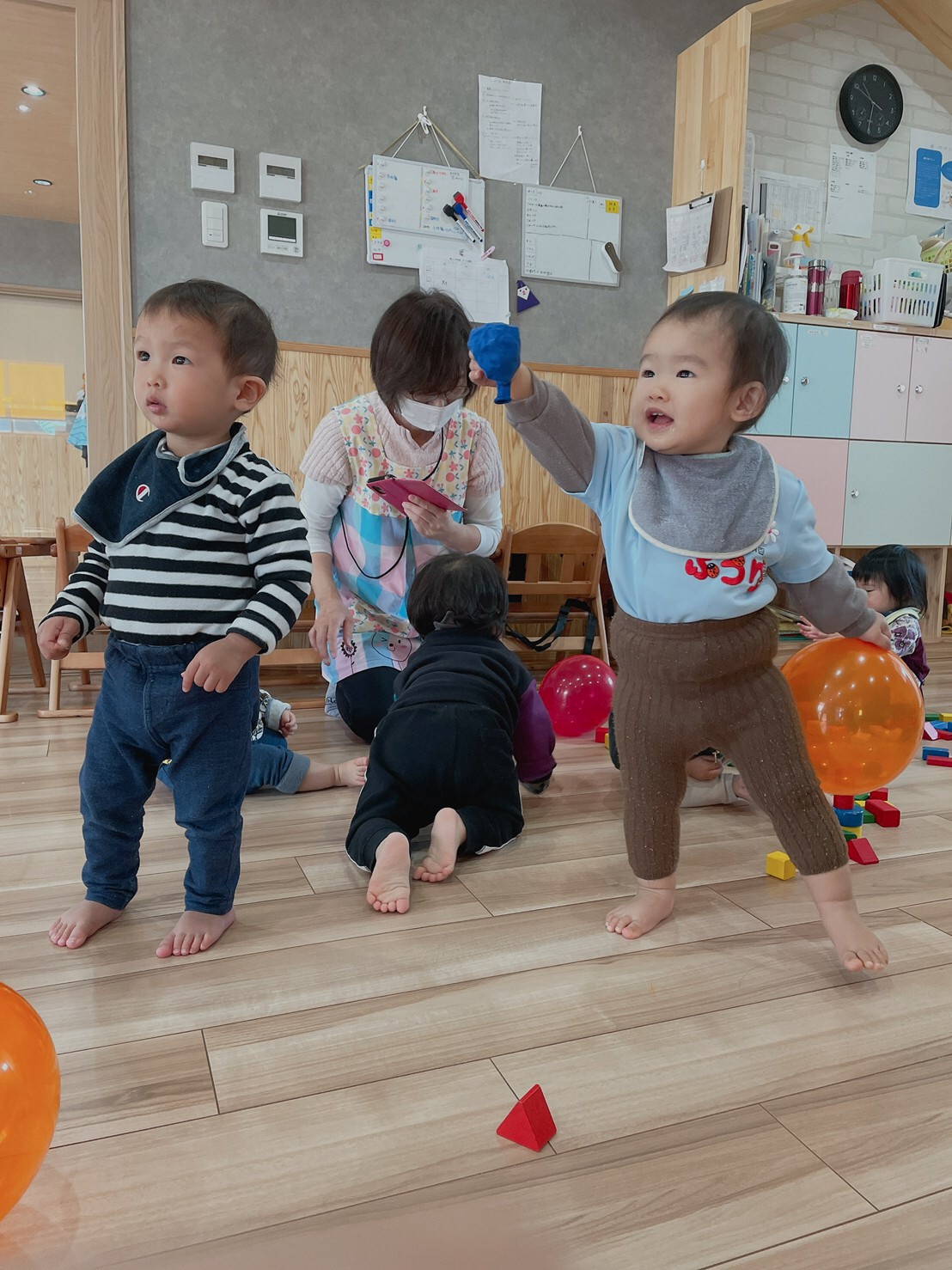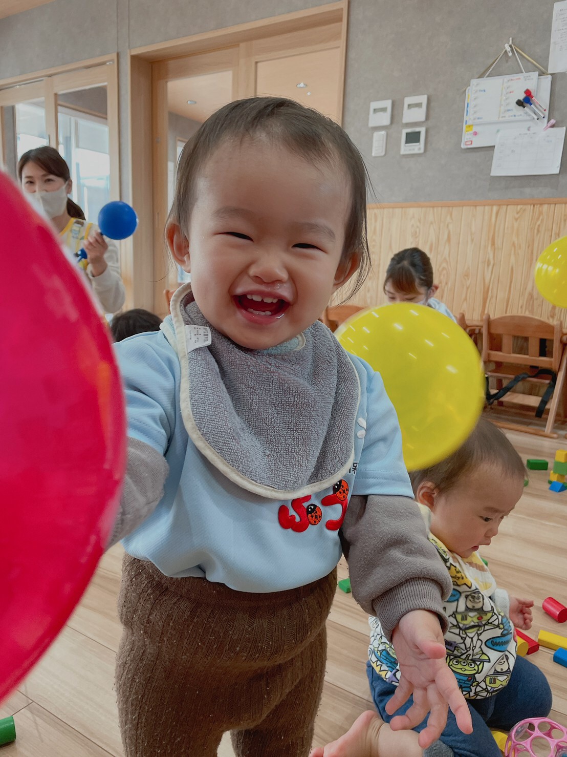 今日はお部屋で積み木や絵本、風船などそれぞれ好きな遊びを楽しみました🥰上手に積み木を重ねて喜ぶ子やそれを倒して笑顔になる子など様々でした✨風船遊びでは、空気を入れた結び目のない風船を飛ばし不規則に動いていくのを眺めて驚いたり、その動きに興味を示していました。