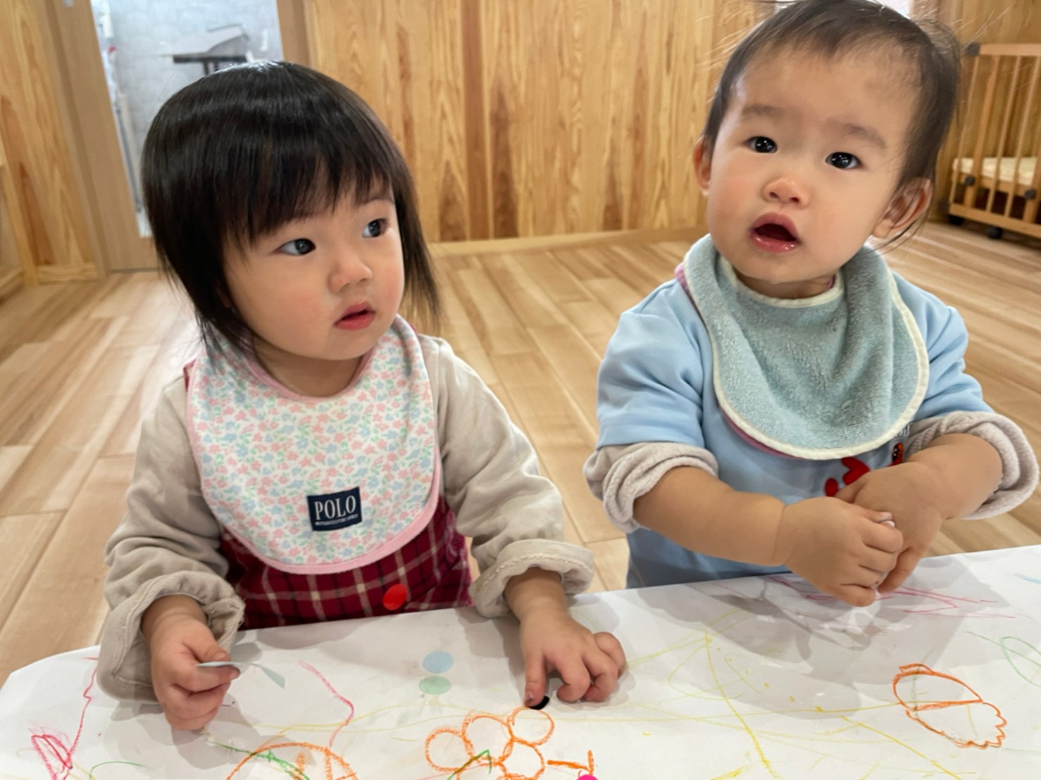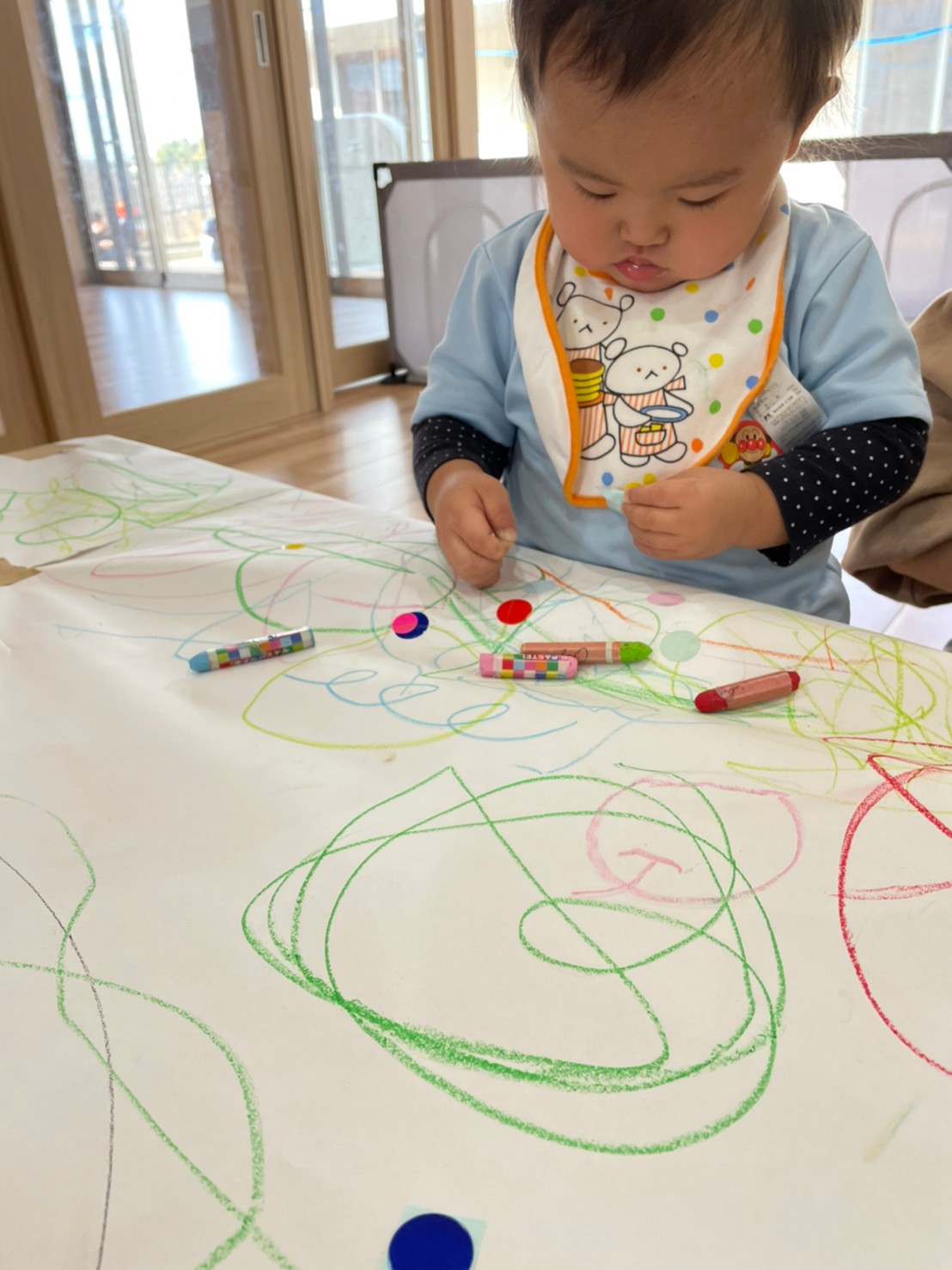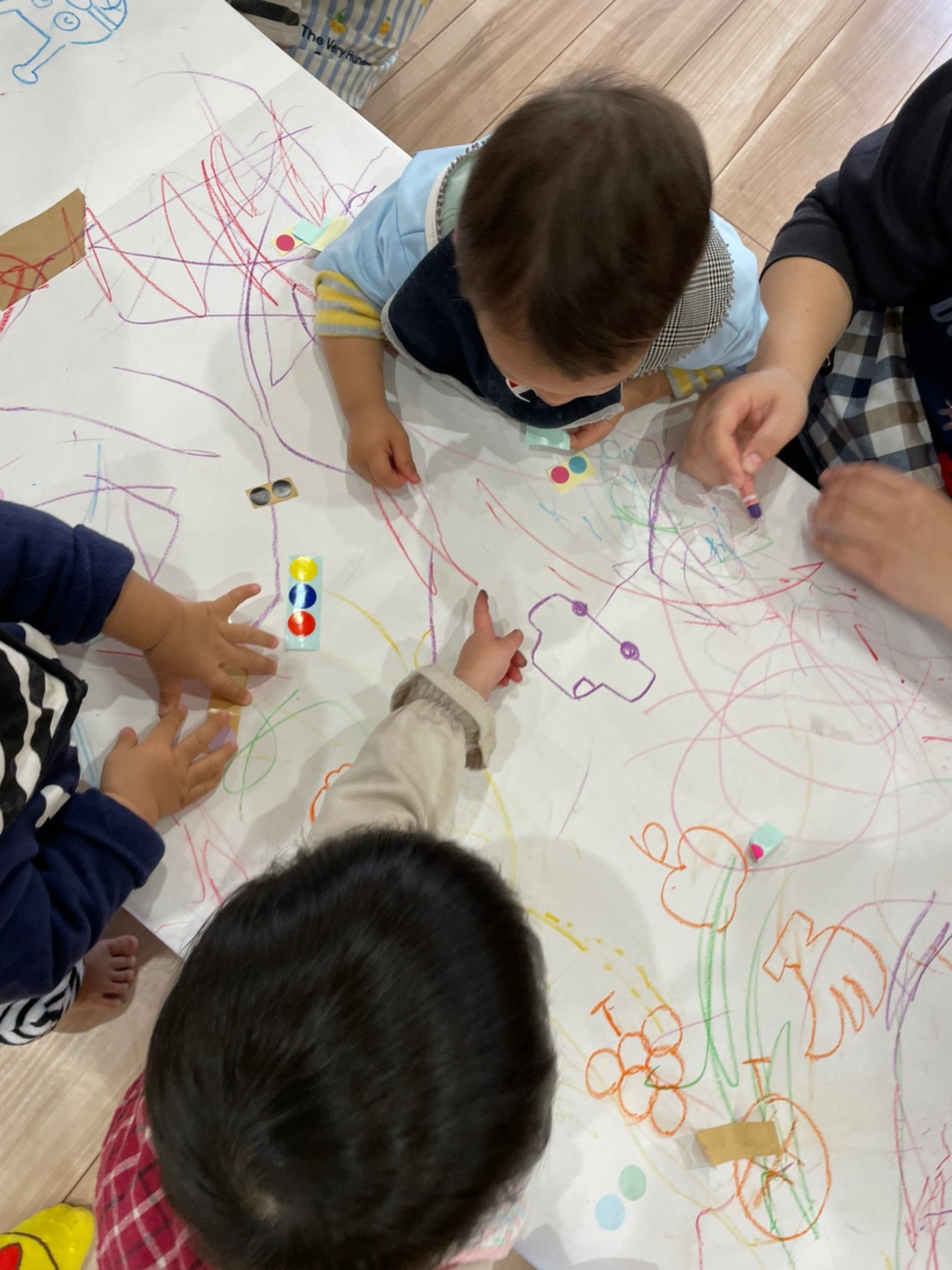 今日は大きな模造紙をだしてみんなで自由にお絵描きしたり、シール貼りをして遊びました🖍✨その後は広いお部屋でダンスをしたり風船などを使い体をたくさん動かして元気いっぱい!ご機嫌なこども達でした😌💕