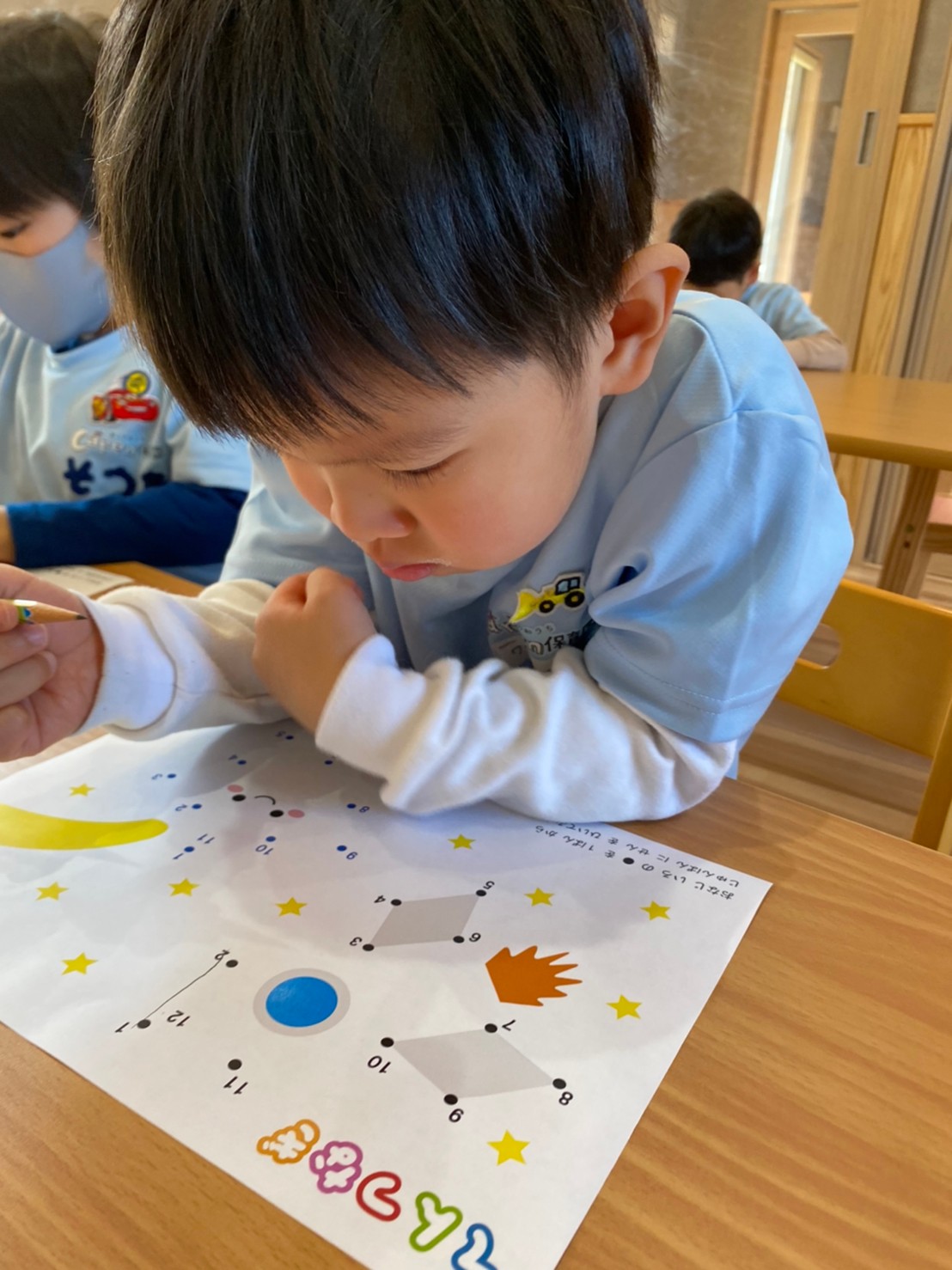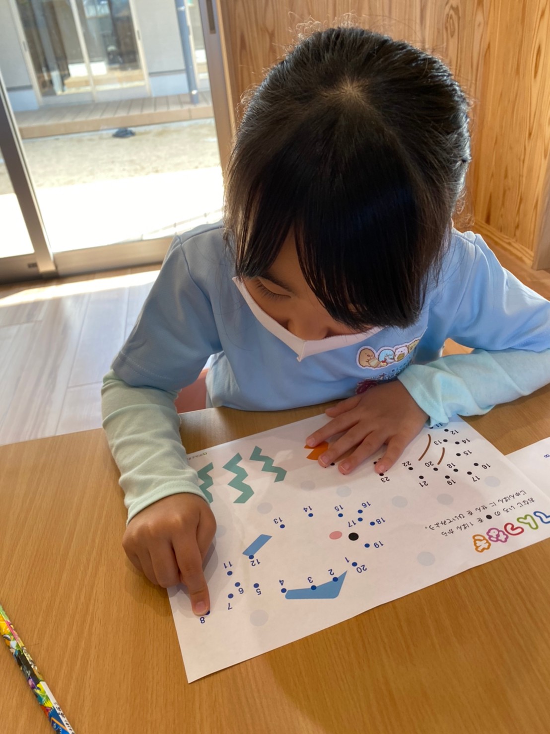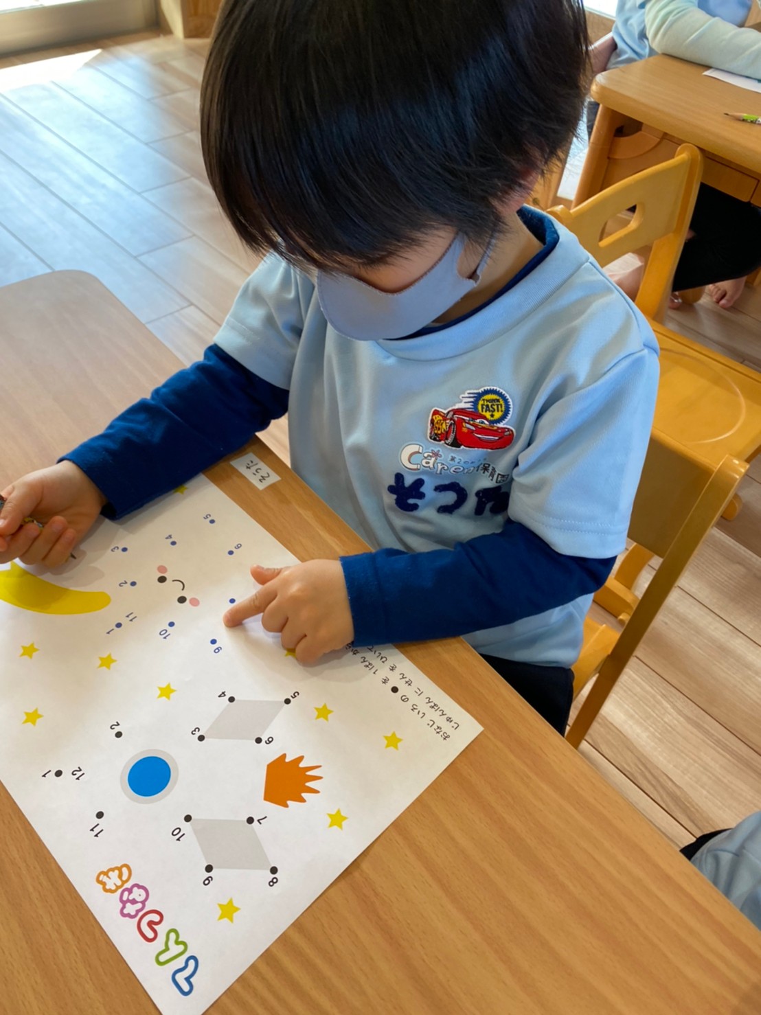 点繋ぎのプリントではルールをすぐに理解し、1〜12までの子も、1〜23のプリントをしたいと言い、積極的に難しい方にも挑戦する姿が見られました🥺✨✨