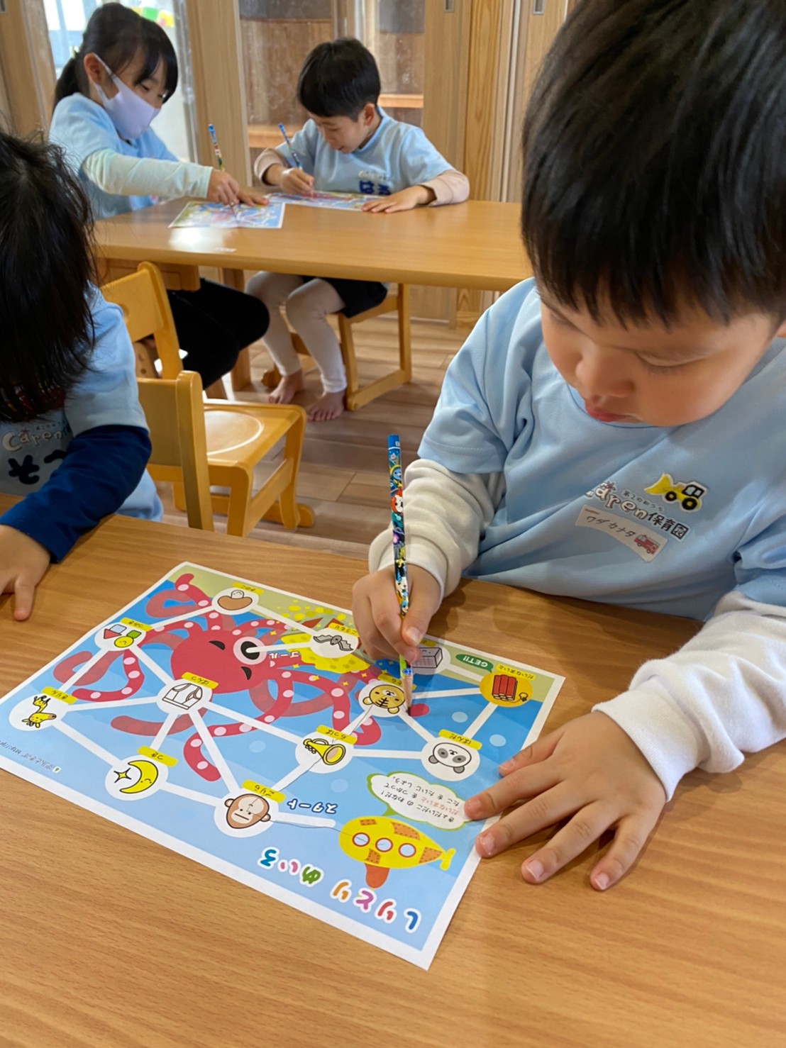 しりとり迷路では、しりとりを理解してスラスラと進めている子もいれば、まだ理解できず戸惑う子もいたので、保育士と一緒に説明をしながら進めていきました🥰💕