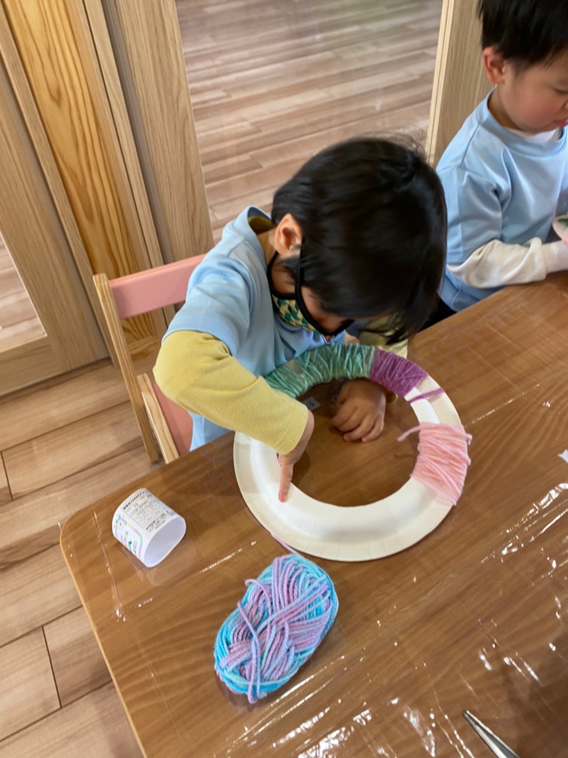 紙皿に毛糸を巻く時に、苦戦する子も多く、保育士と一緒に巻くと、コツを掴んだようで、好きな色の毛糸を選びながら製作を楽しむことができました🥰🧶