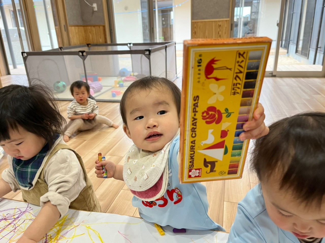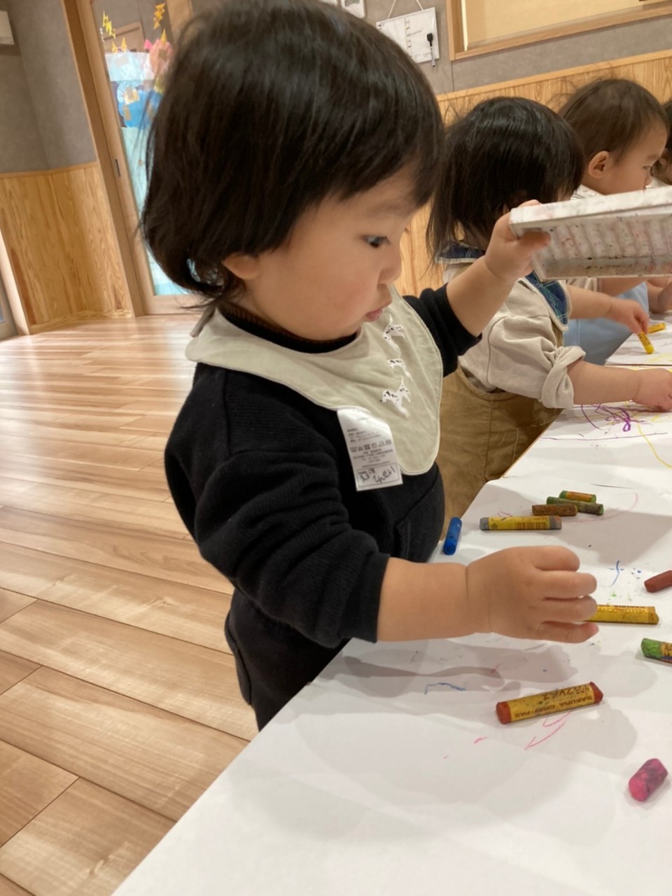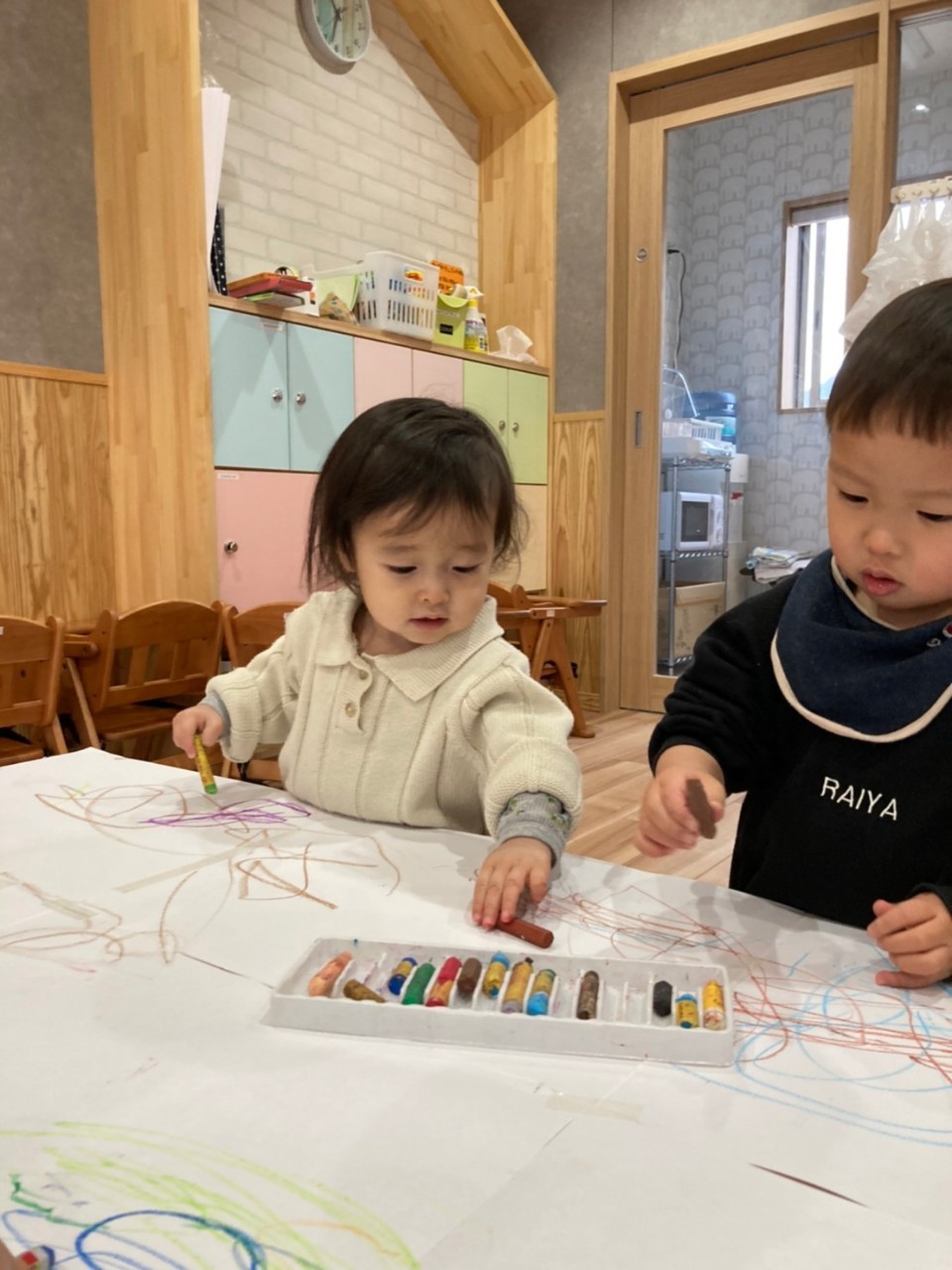 保育者に介助されて歯科検診を受けました🥰その後はテーブルいっぱいの広い用紙にクレヨンでなぐり描きを思い思いに楽しんでいました🥰☺️りす、ぱんだ組☺️