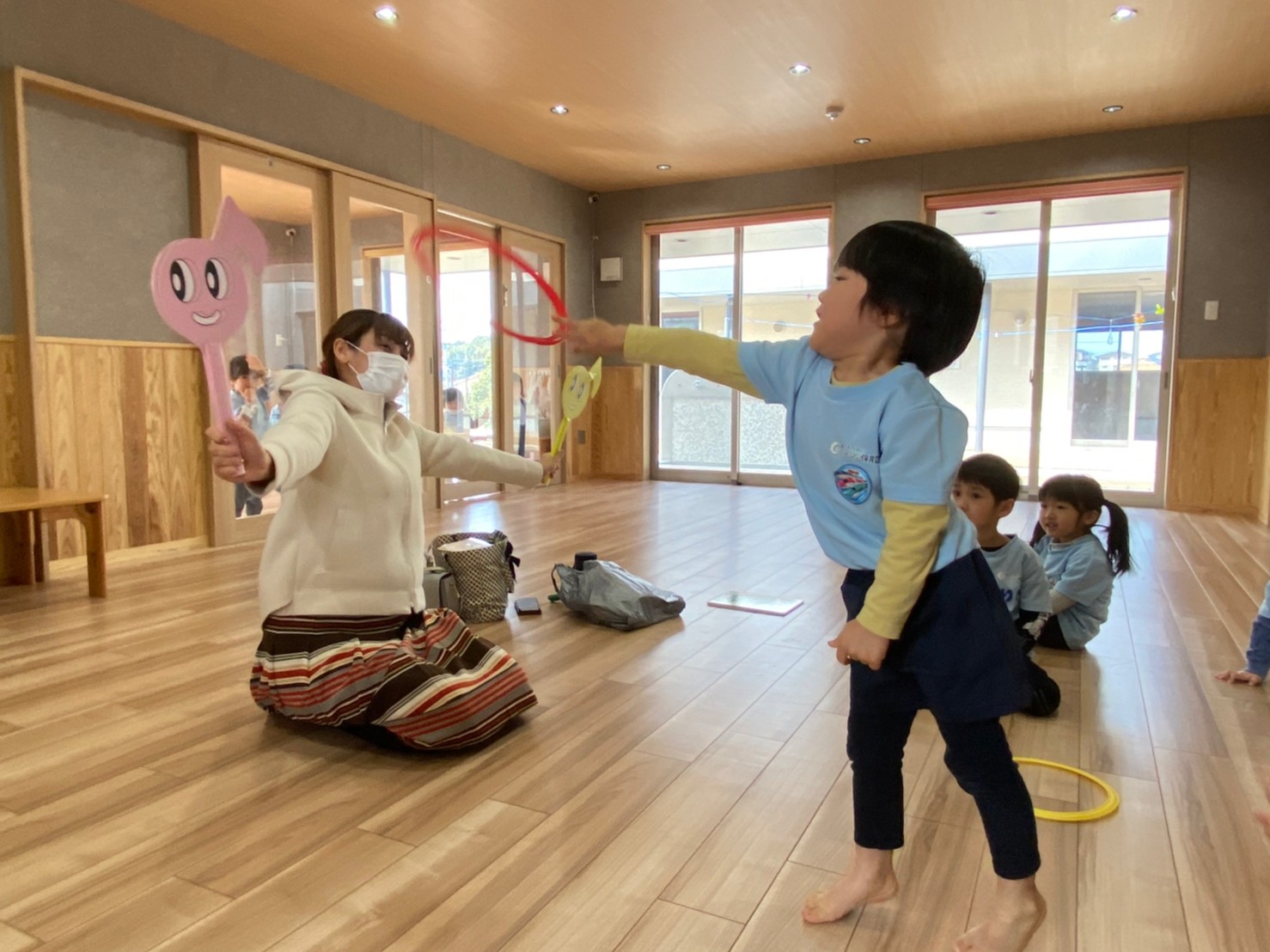 可愛い音符ちゃんに、輪っかを投げて遊び、ドレミの音階遊びを楽しみました♪