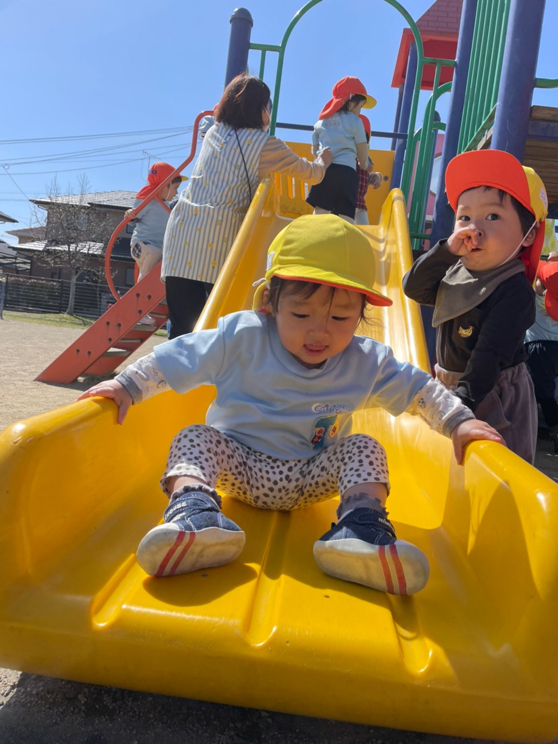 今日は合同でふれあい公園に行きました☺️誘導ロープをしっかりと持って春の景色を楽しみながら歩いて向かい、公園に着くとトンネルくぐりや鉄棒や滑り台で楽しく遊ぶ様子でした😘