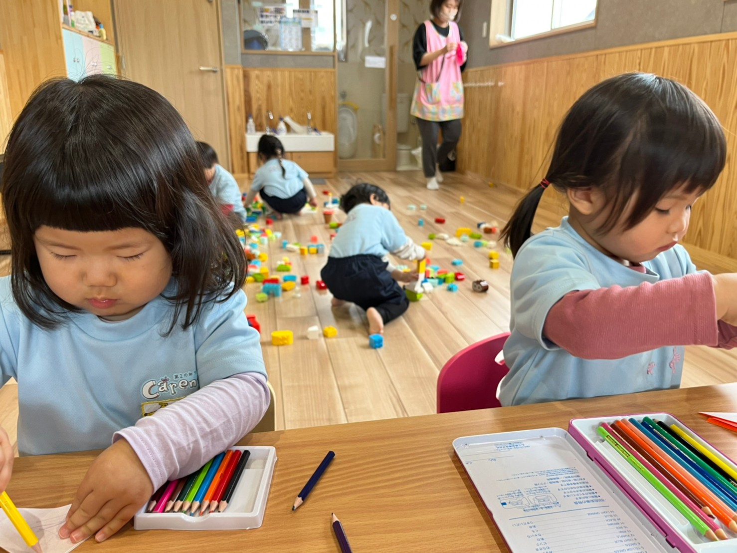 今日は積み木やぬいぐるみ、車などいろいろな玩具で遊びました!自分の好きな玩具で夢中で遊んでいました😊友だちと同じ物が欲しかったり〜それぞれの思いが重なったりする姿もみられました😆