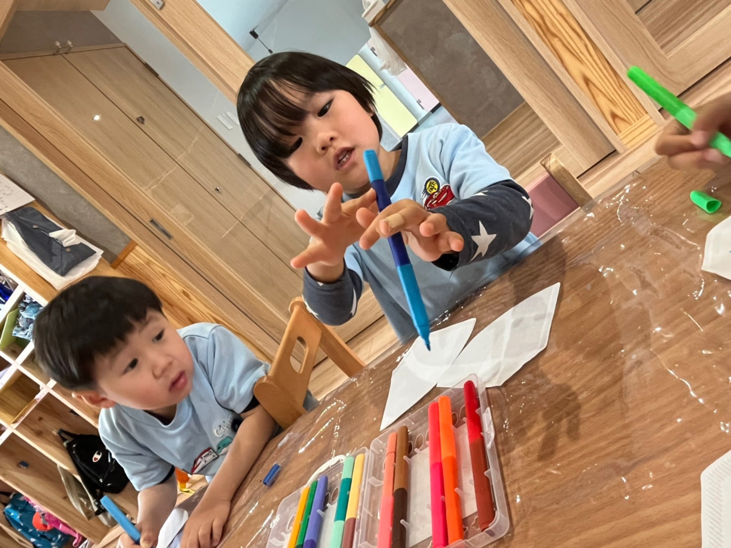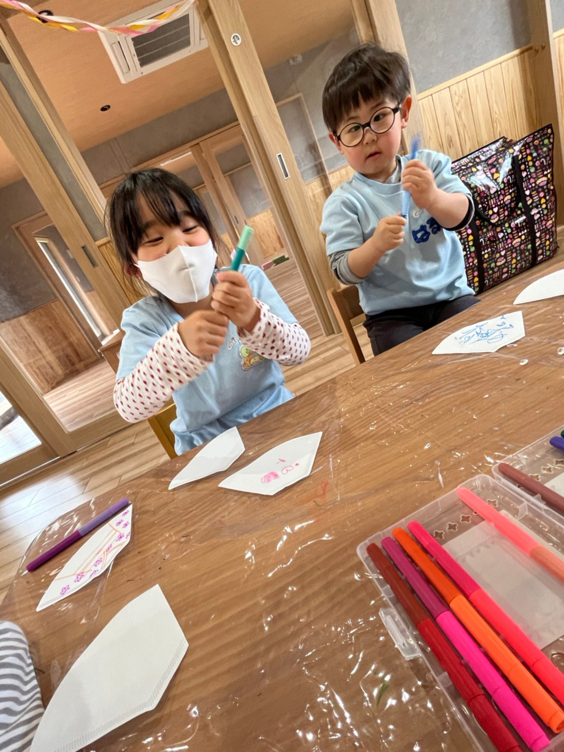 今日は製作の続きをし、コーヒーフィルターに水性ペンで好きな模様を描き、霧吹きで滲ませて作る、滲み絵をしました!