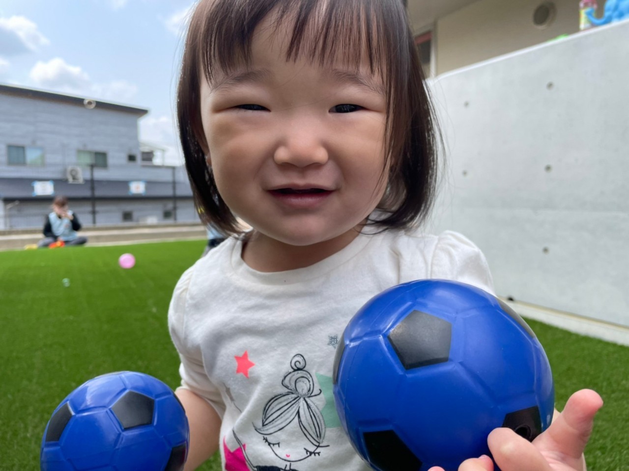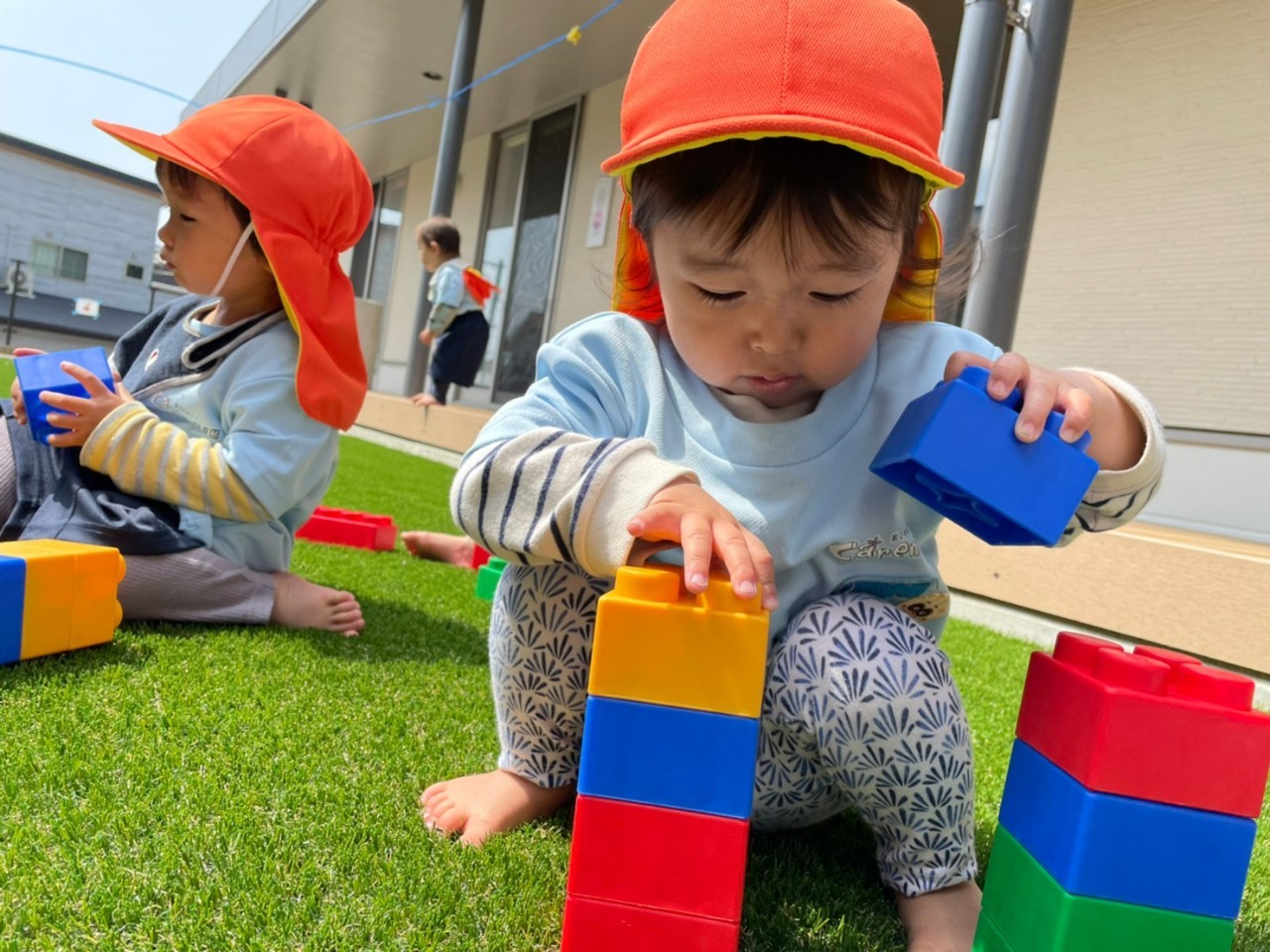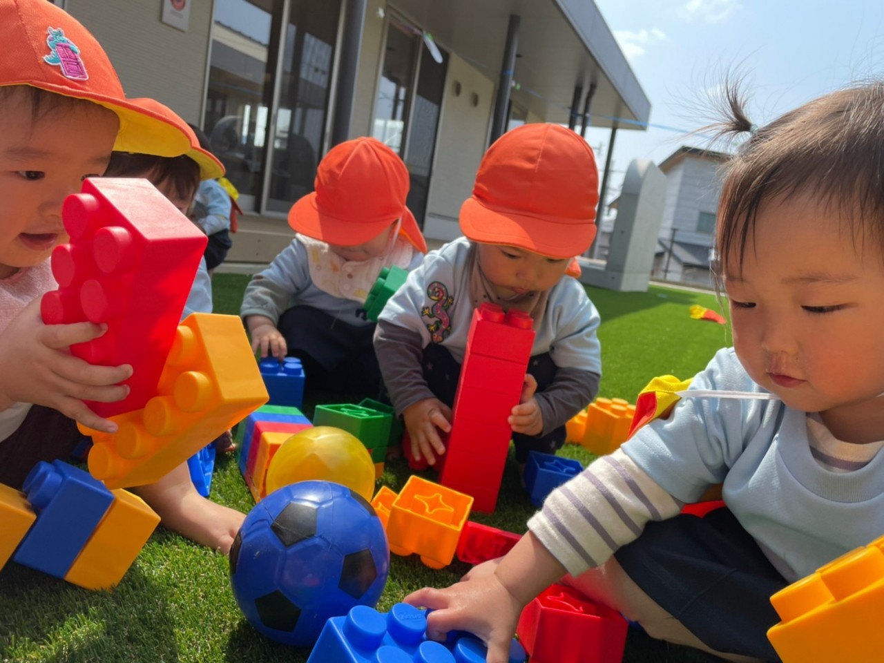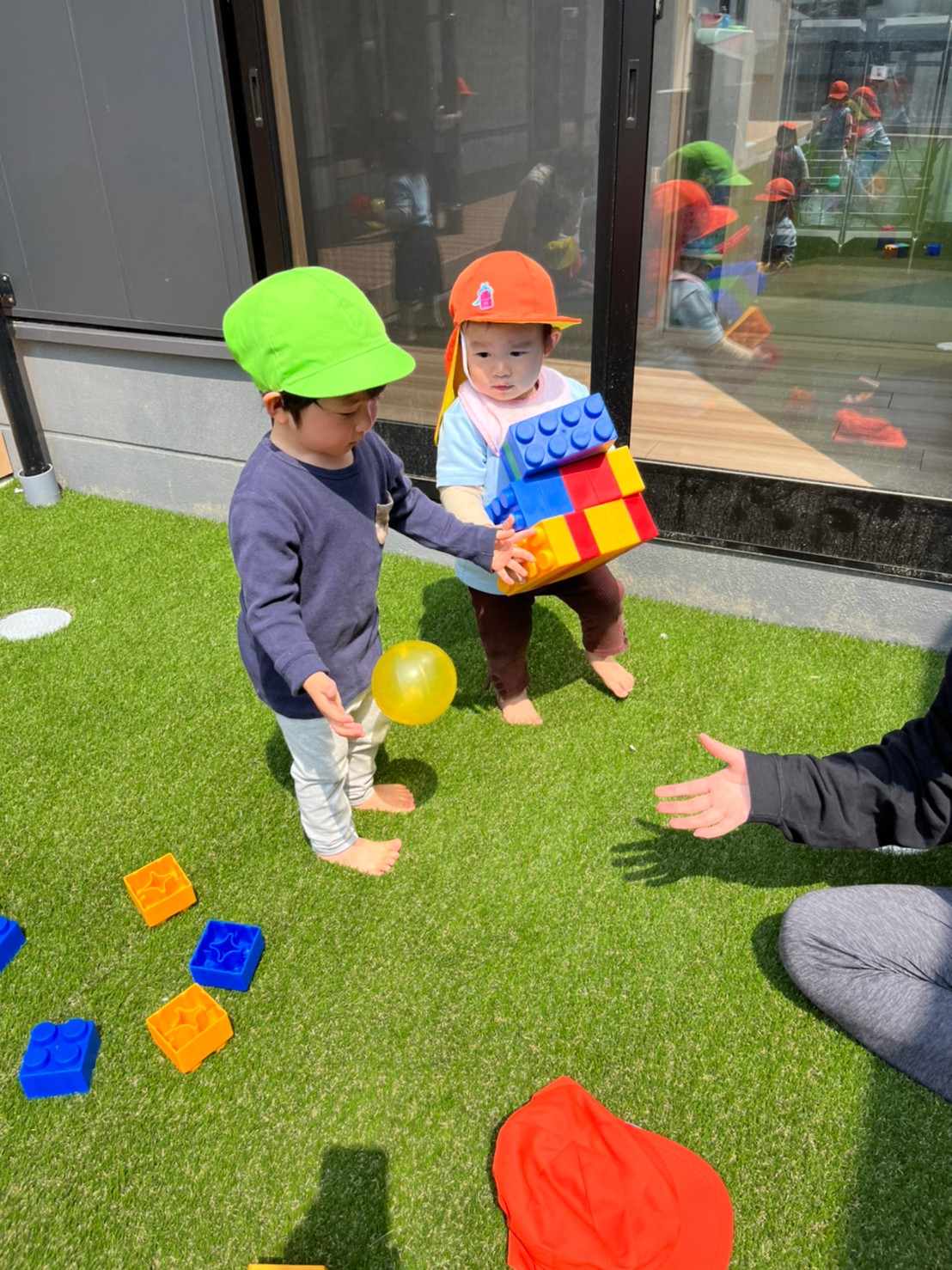 今日は季節の製作をしました✨手形を取ると、筆や絵の具の感触を不思議そうな顔で見るお友だちもいました🖌🎨園庭では、ボールを転がしたり大型ブロックを積み上げたりと、思い思いに楽しんで遊んでいましたよ🎶