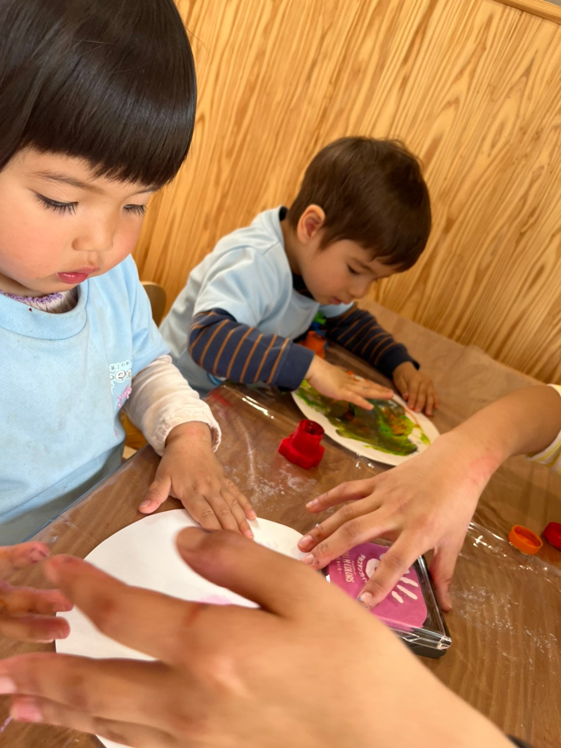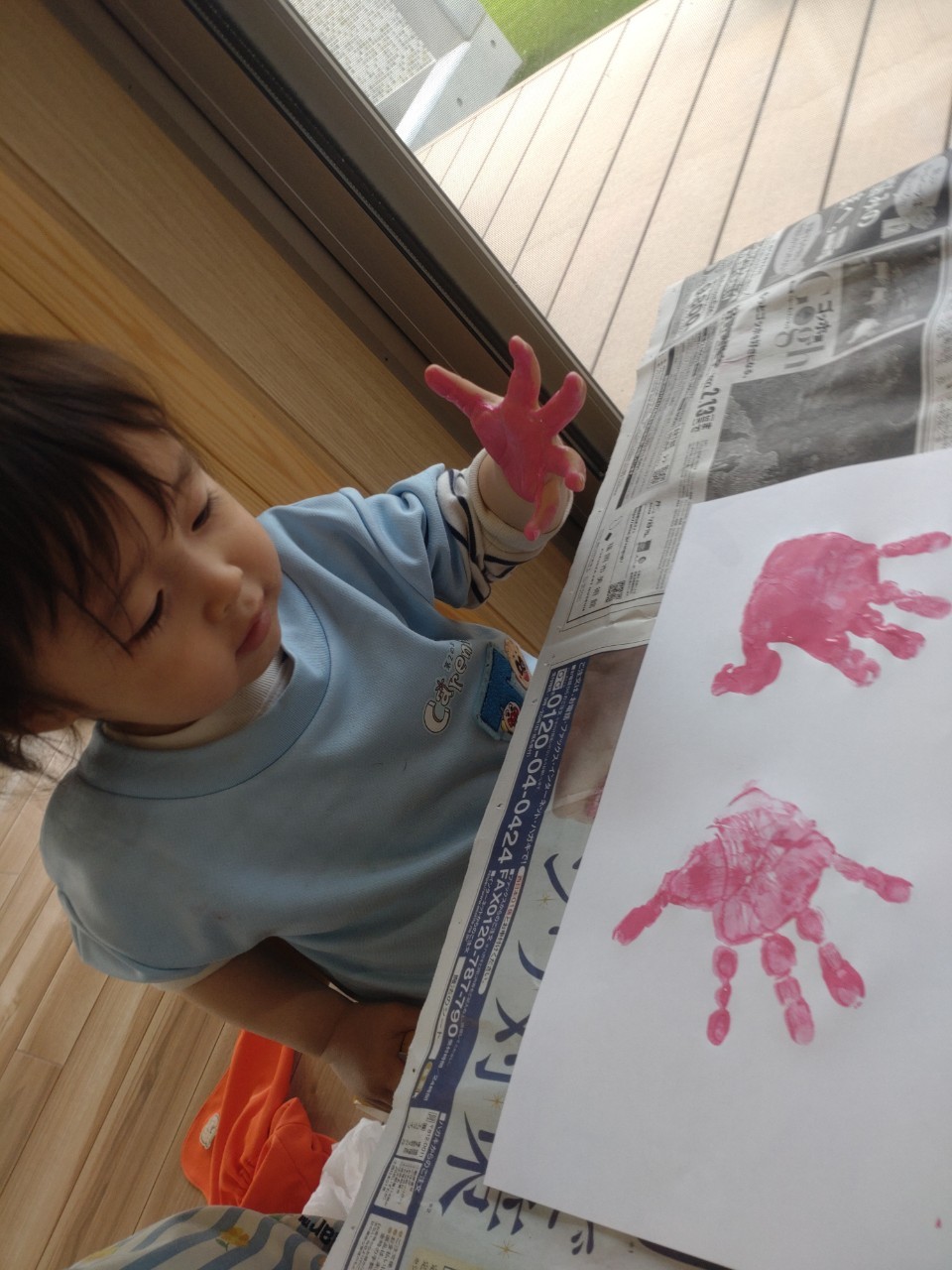 保育者と一緒に上手に手形を取り、フィンガーペイントも好きな色を選びペタペタと綺麗に色を付けて活動していました😇🧡