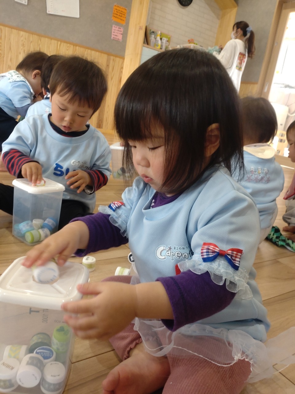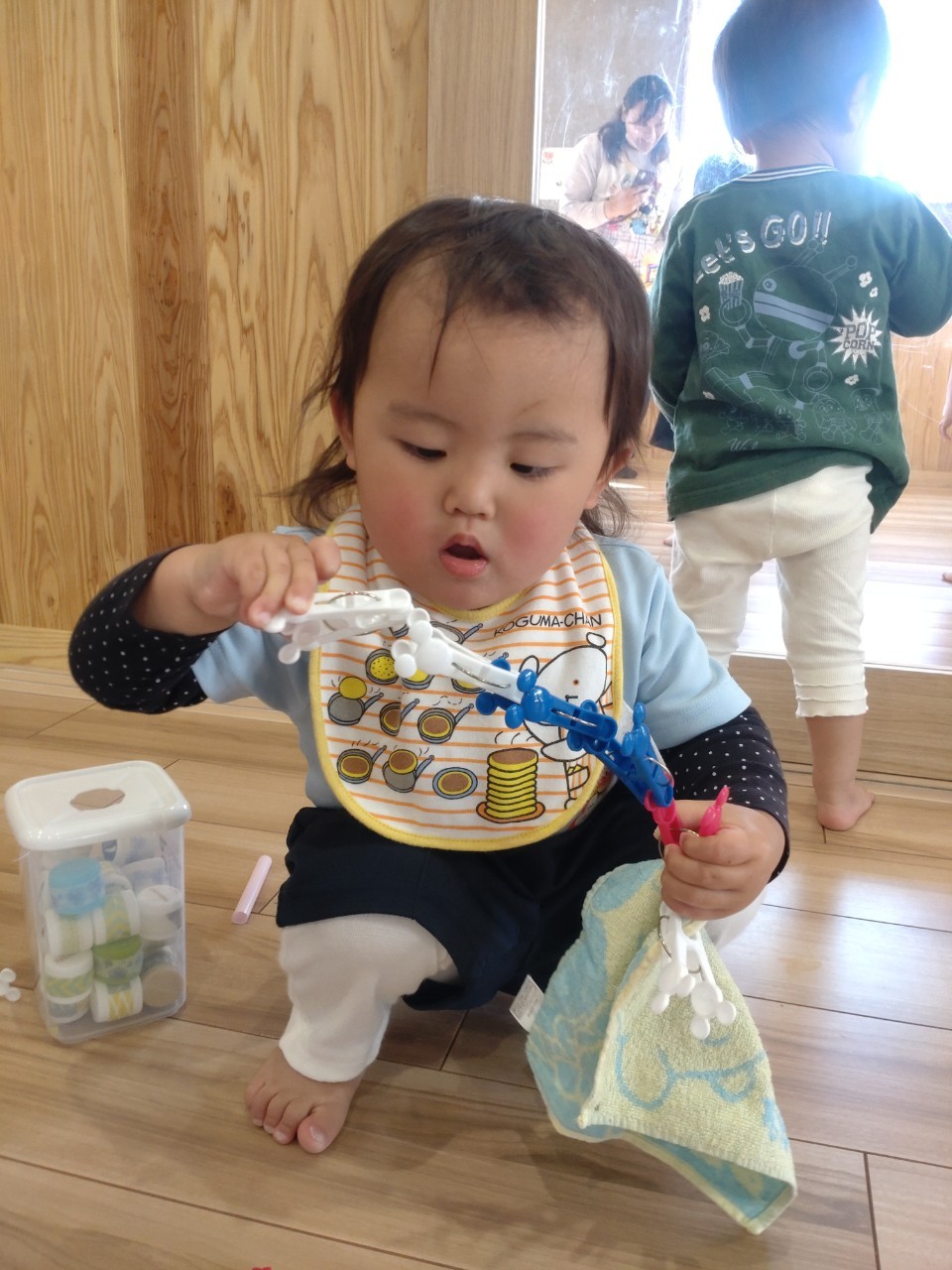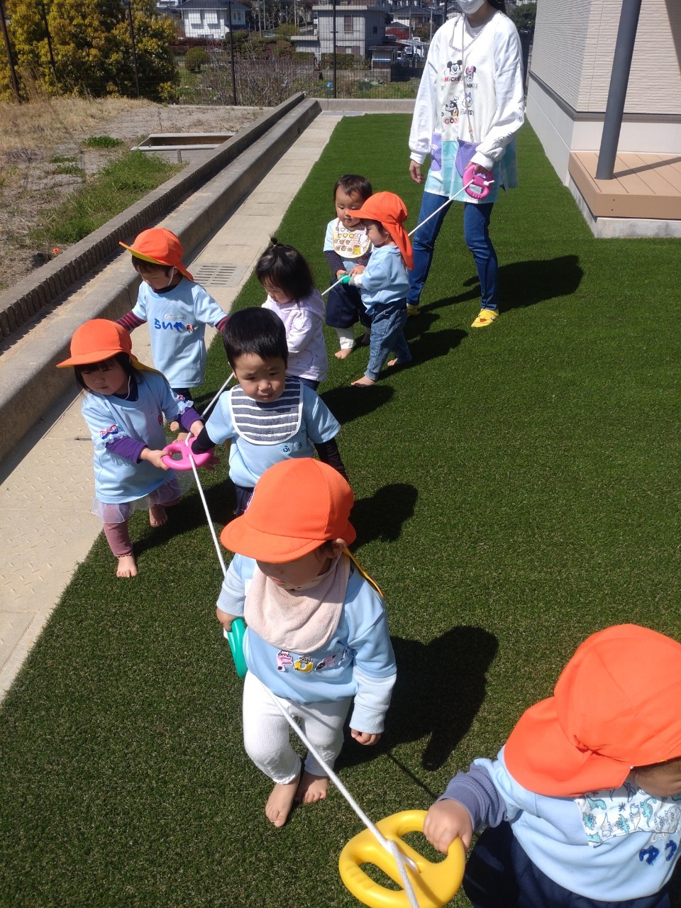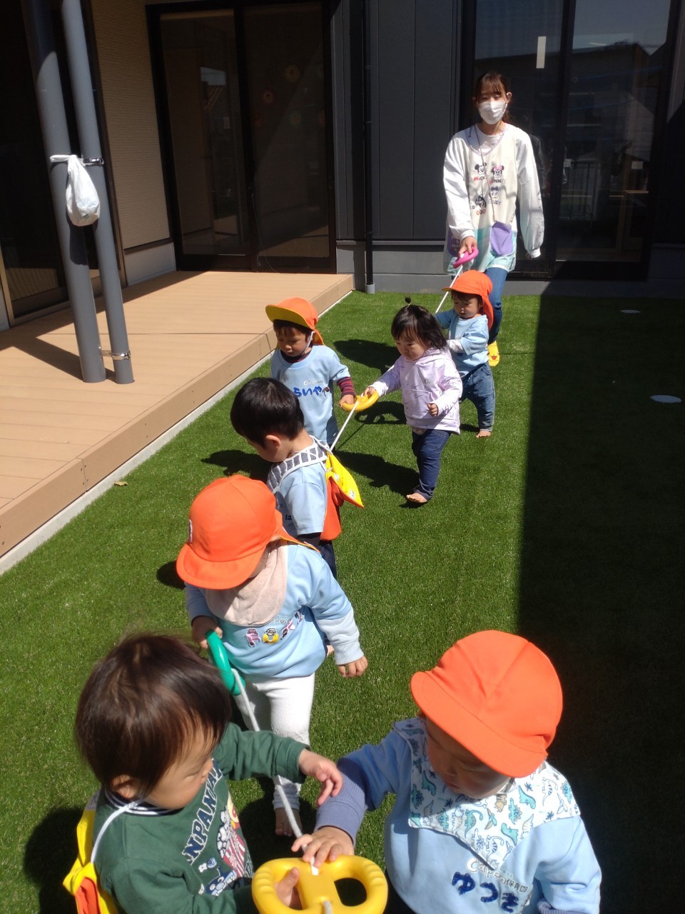 今日は12名勢揃いのりす組で賑やかに過ごしました🥰お部屋では、キャップやストロー落としをしたり、ハンカチを洗濯バサミで挟んだりして、指先を使って集中して遊びました🎶お庭では誘導ロープを上手に持って、嬉しそうにお散歩の練習に参加する子ども達でした✌️