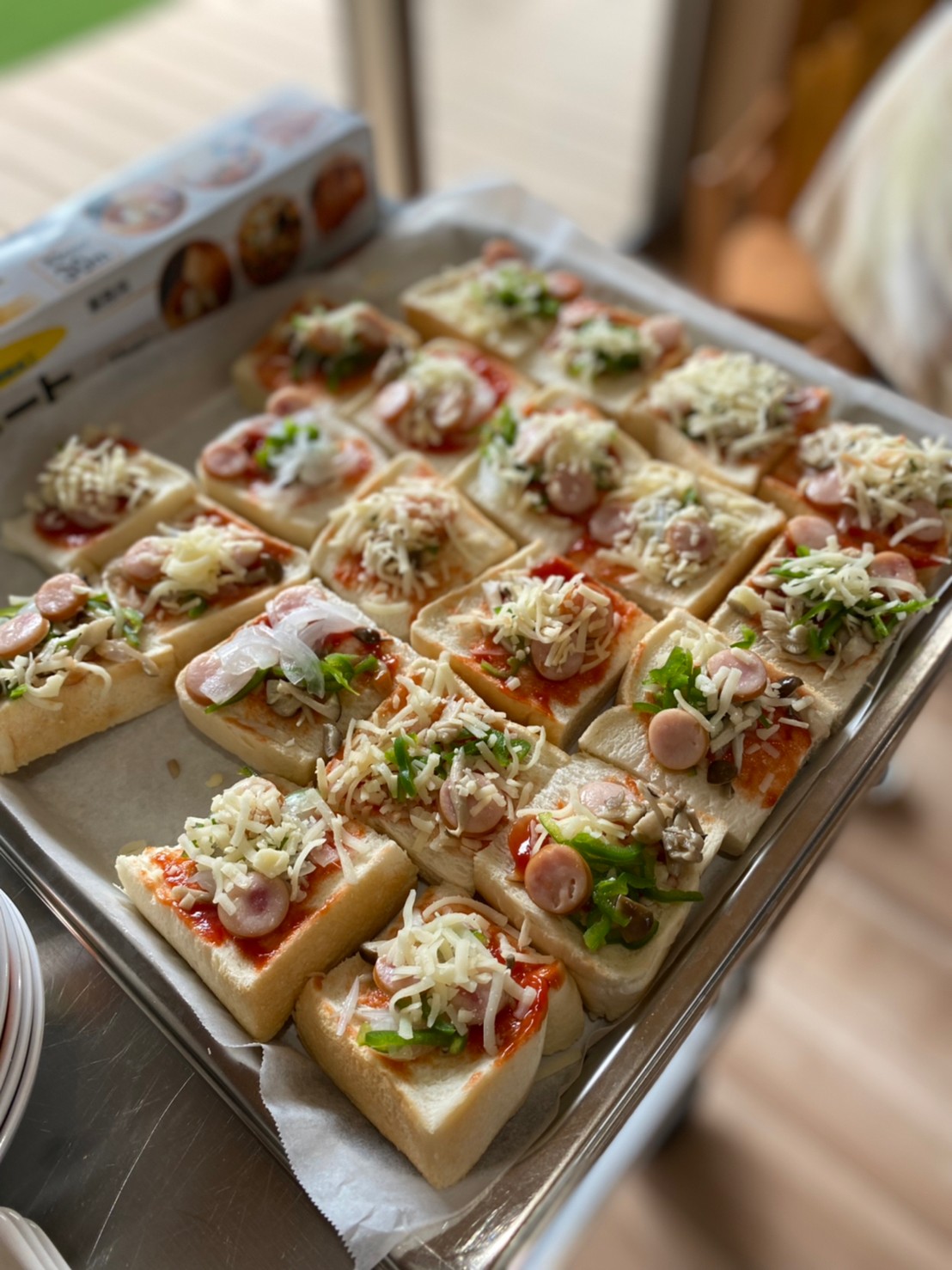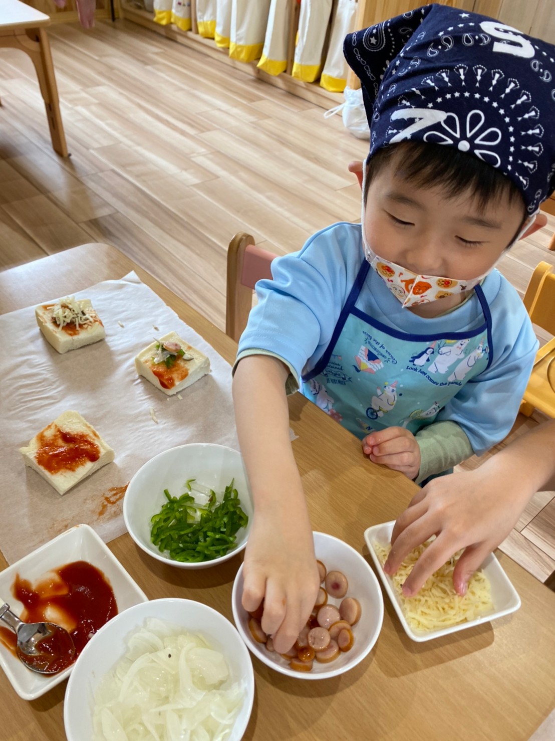パンにケチャップを付け、野菜をトッピングして、最後はチーズをたっぷり🧀✨