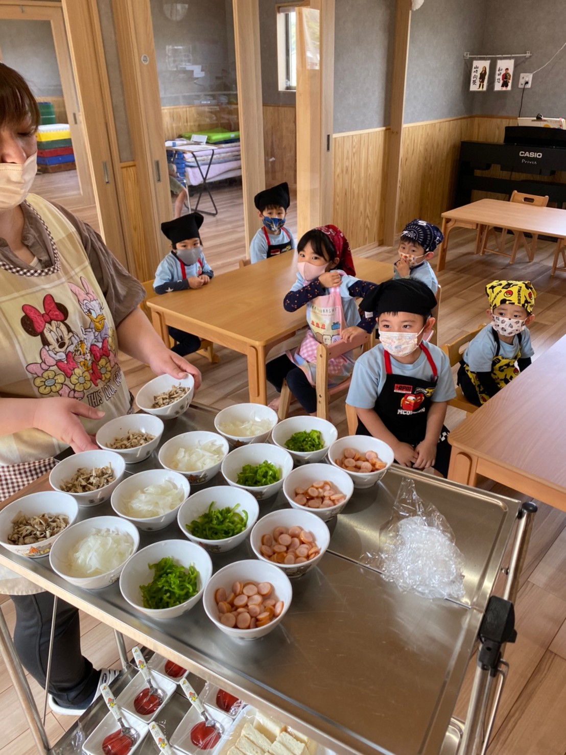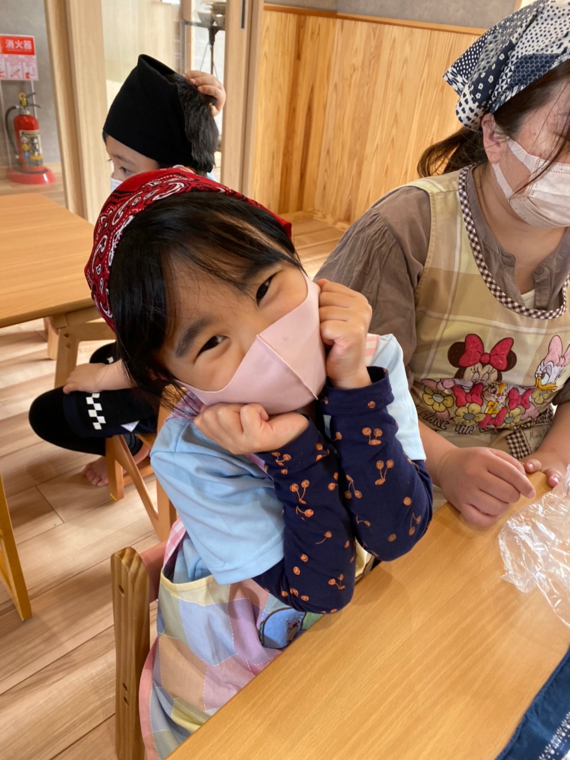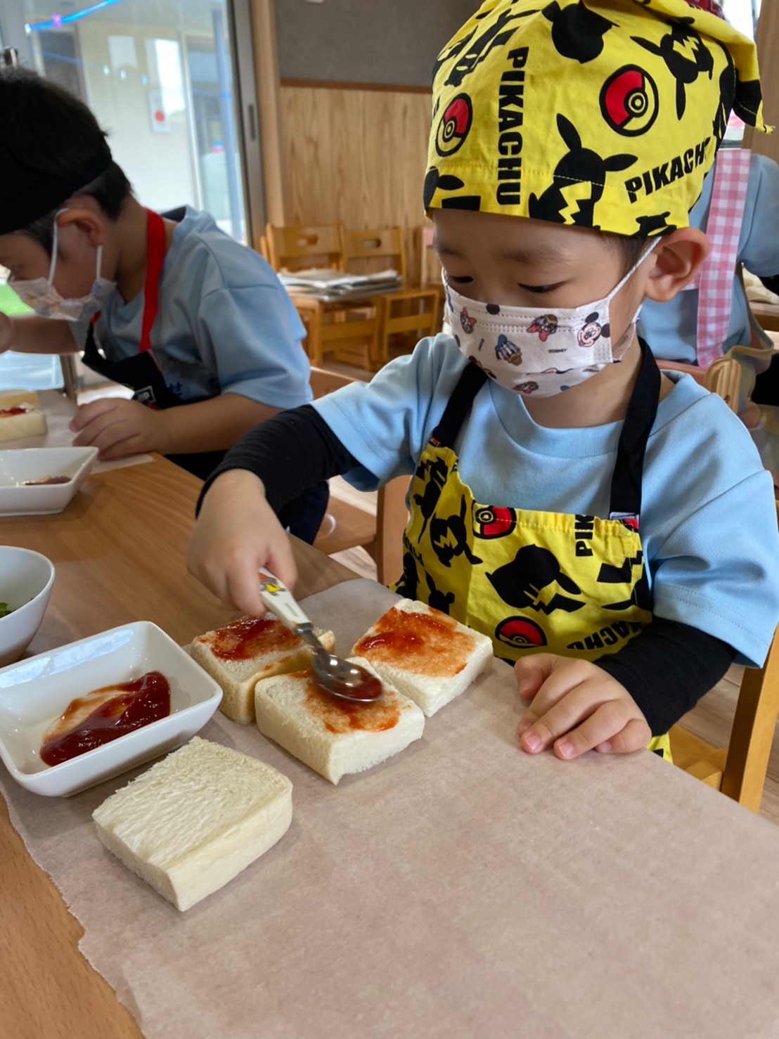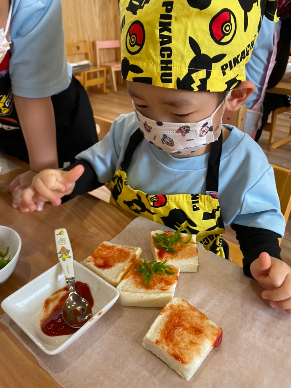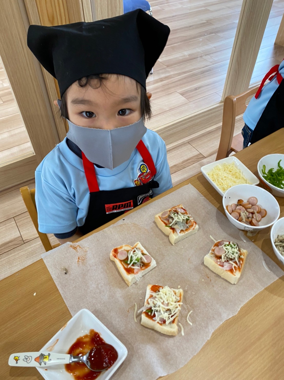 エプロンに着替えて、みんなでピザを作りました😊💕