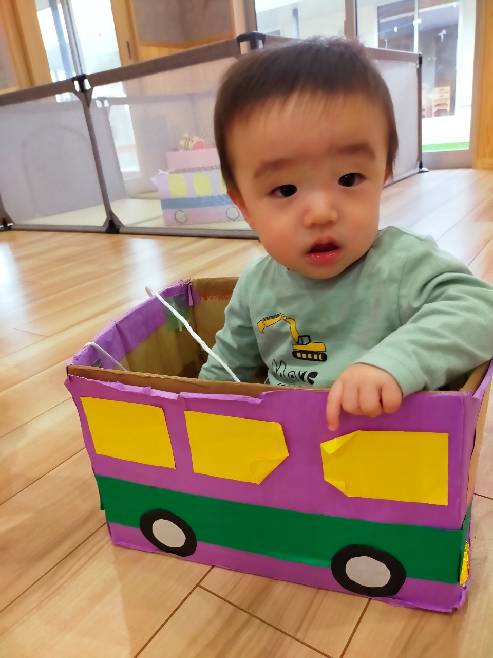今日はダンボール車とウレタンフープで遊びました!車に乗車して保育者運転手に沢山声をかけてもらって室内ドライブを楽しんでいました😆