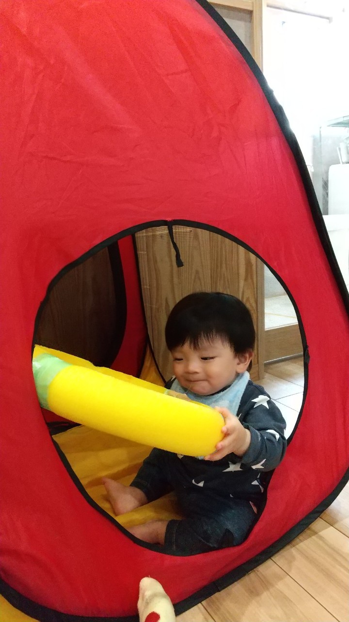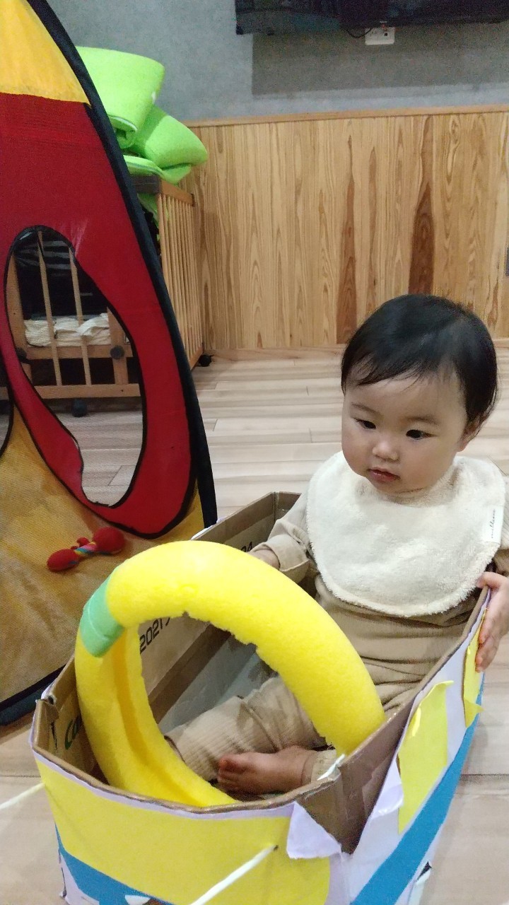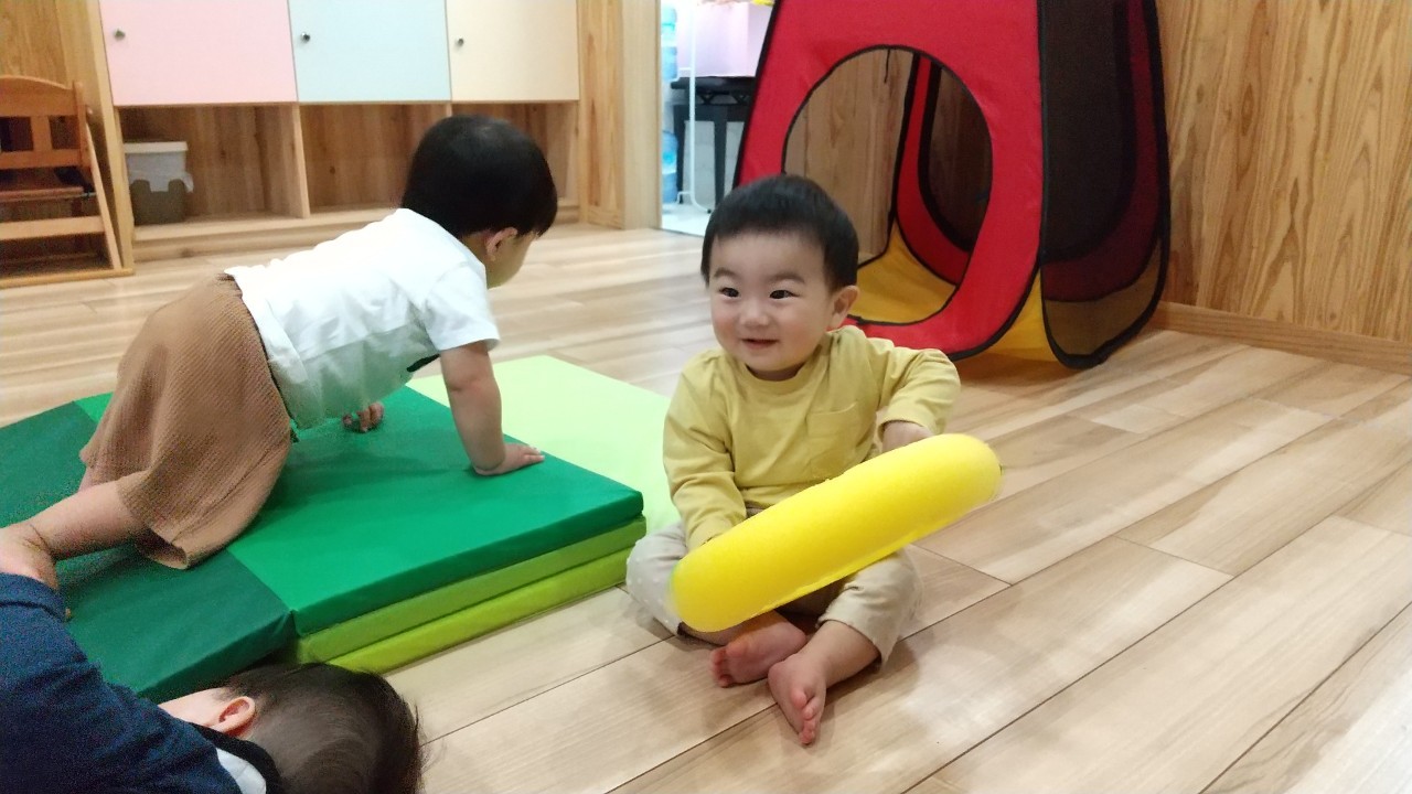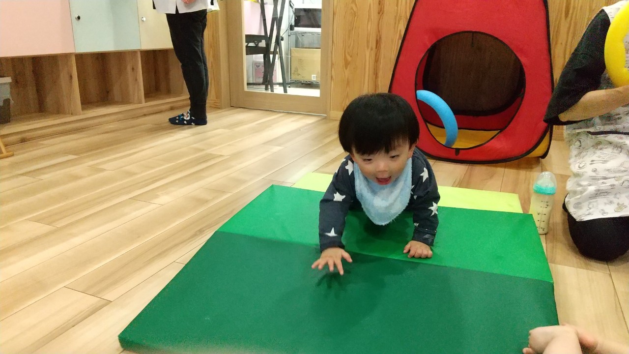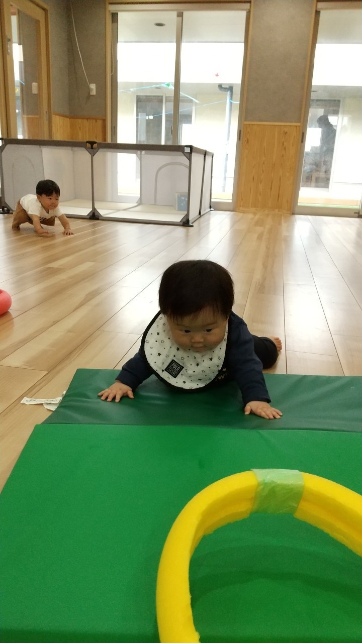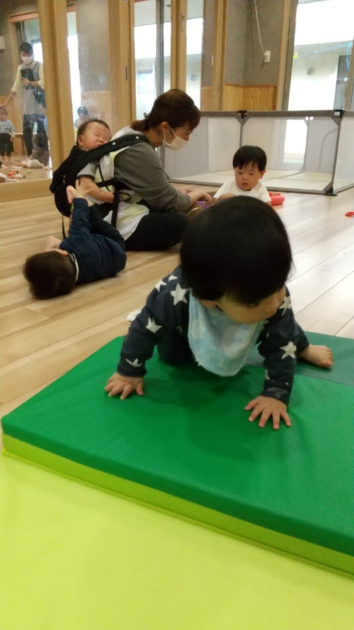 今日は室内でマット坂やボールハウス、フープなど沢山体を動かして遊びました!寝返りやハイハイ、伝い歩きなどマイブームの動きをそれぞれで楽しんでいました😆
