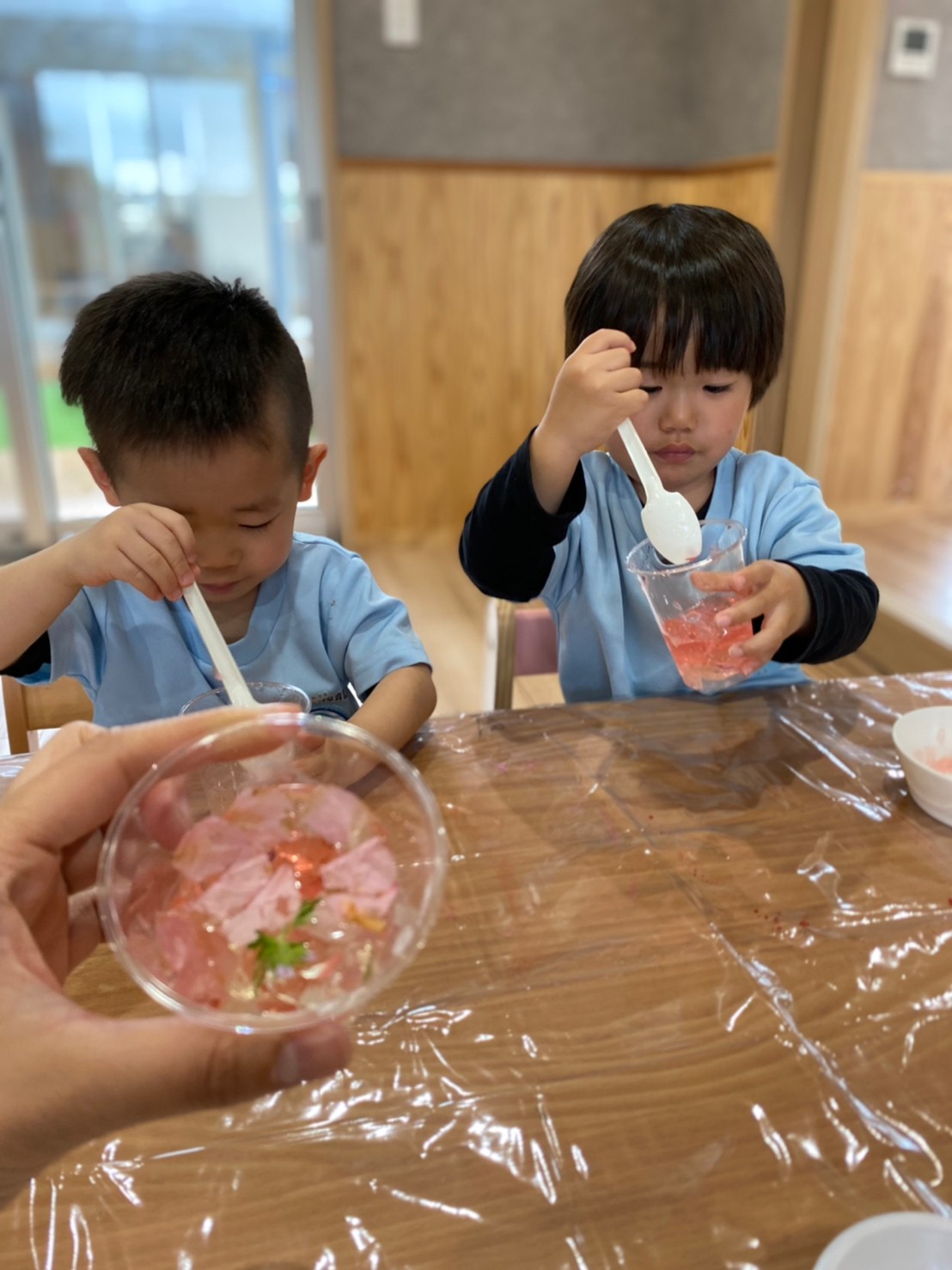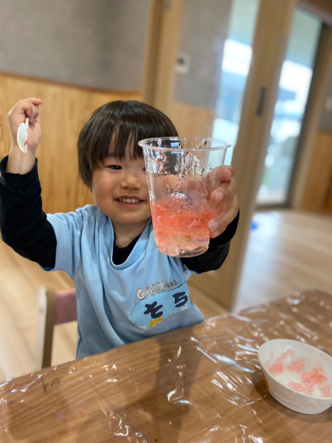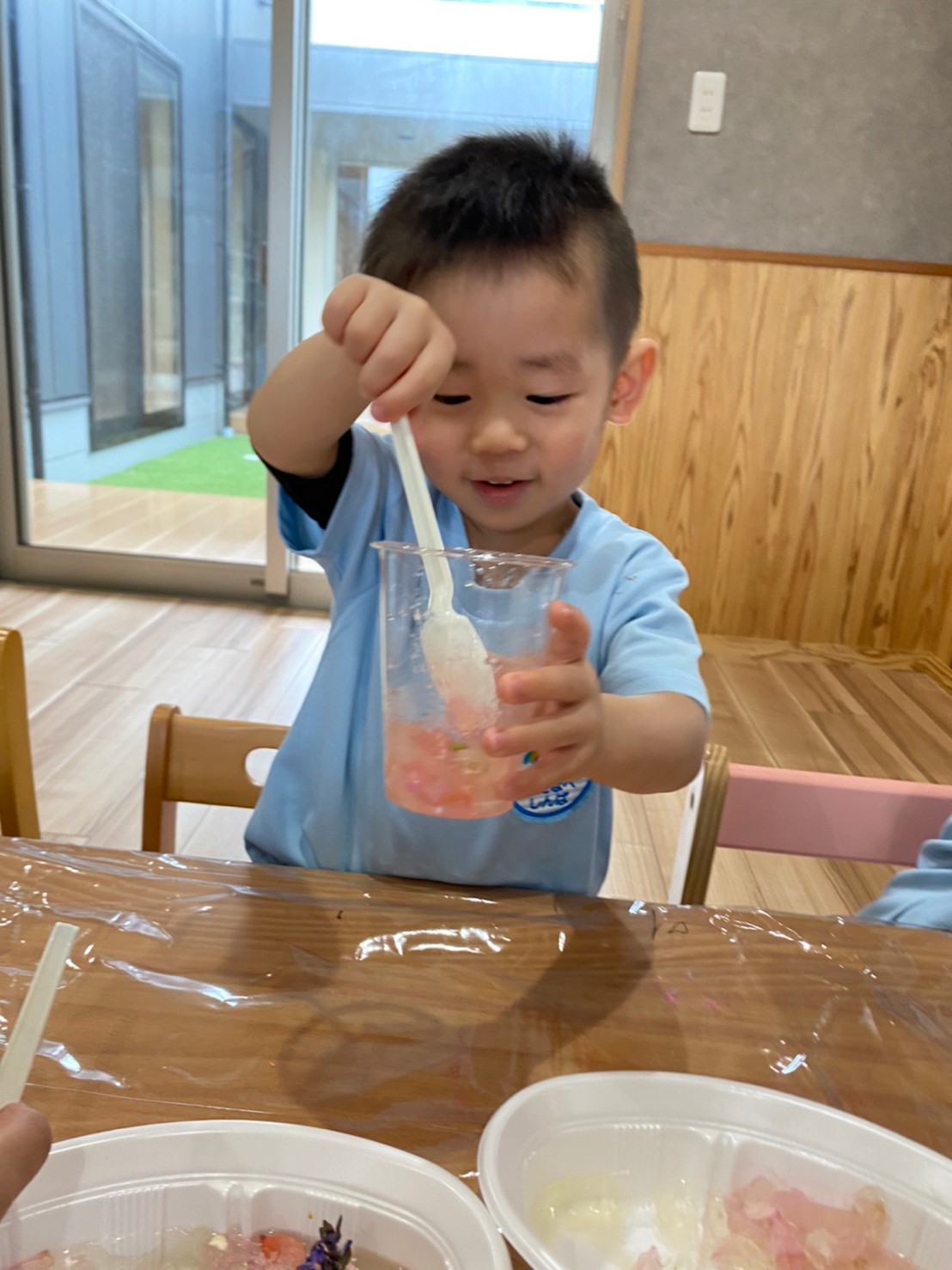 透明のプラスチックカップに入れて遊んだり、スプーンでつぎ分けたりと楽しんでいましたよ😊💕
