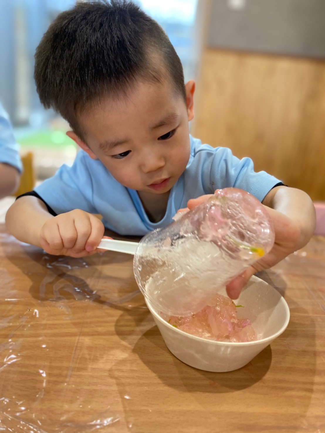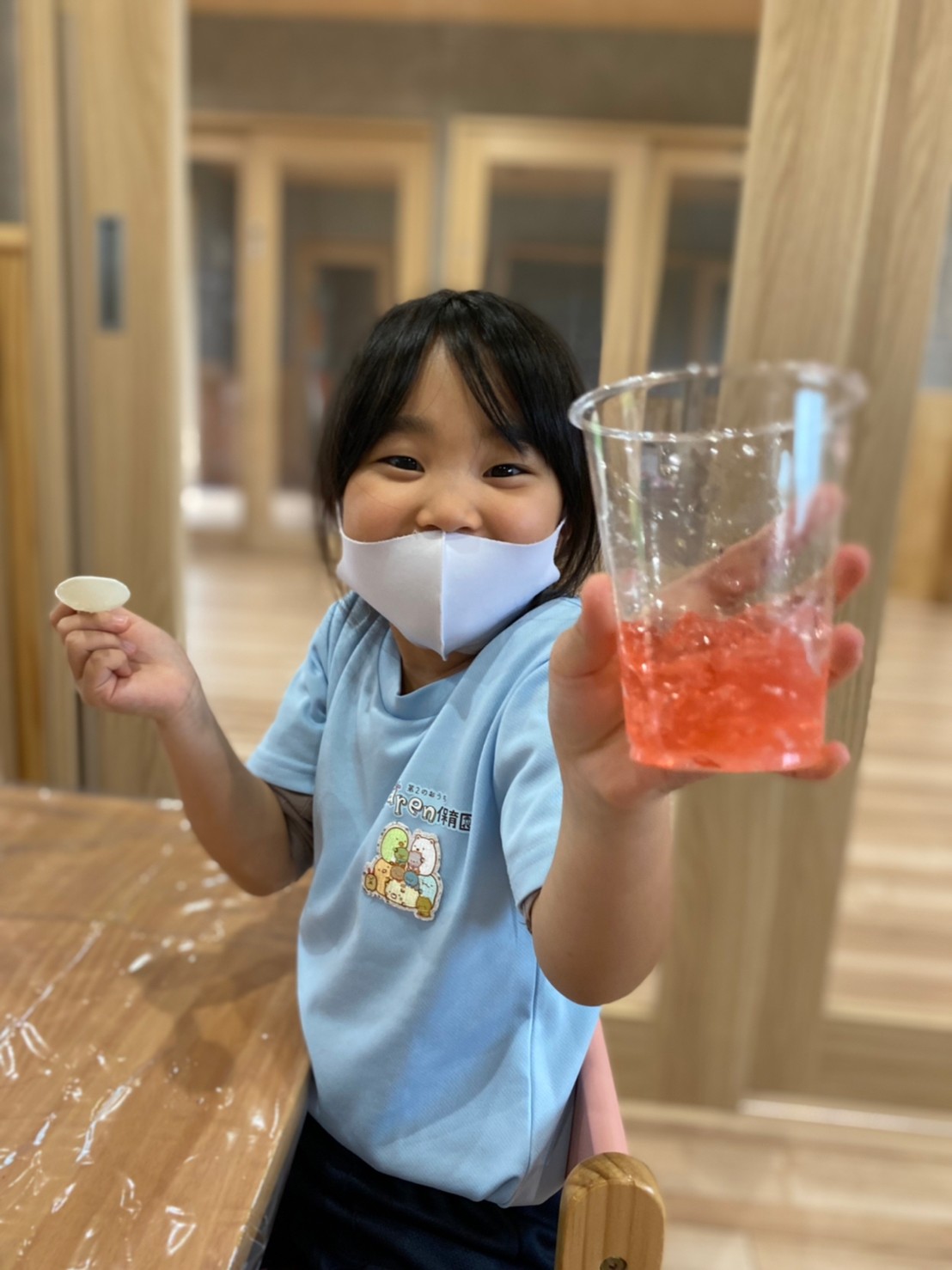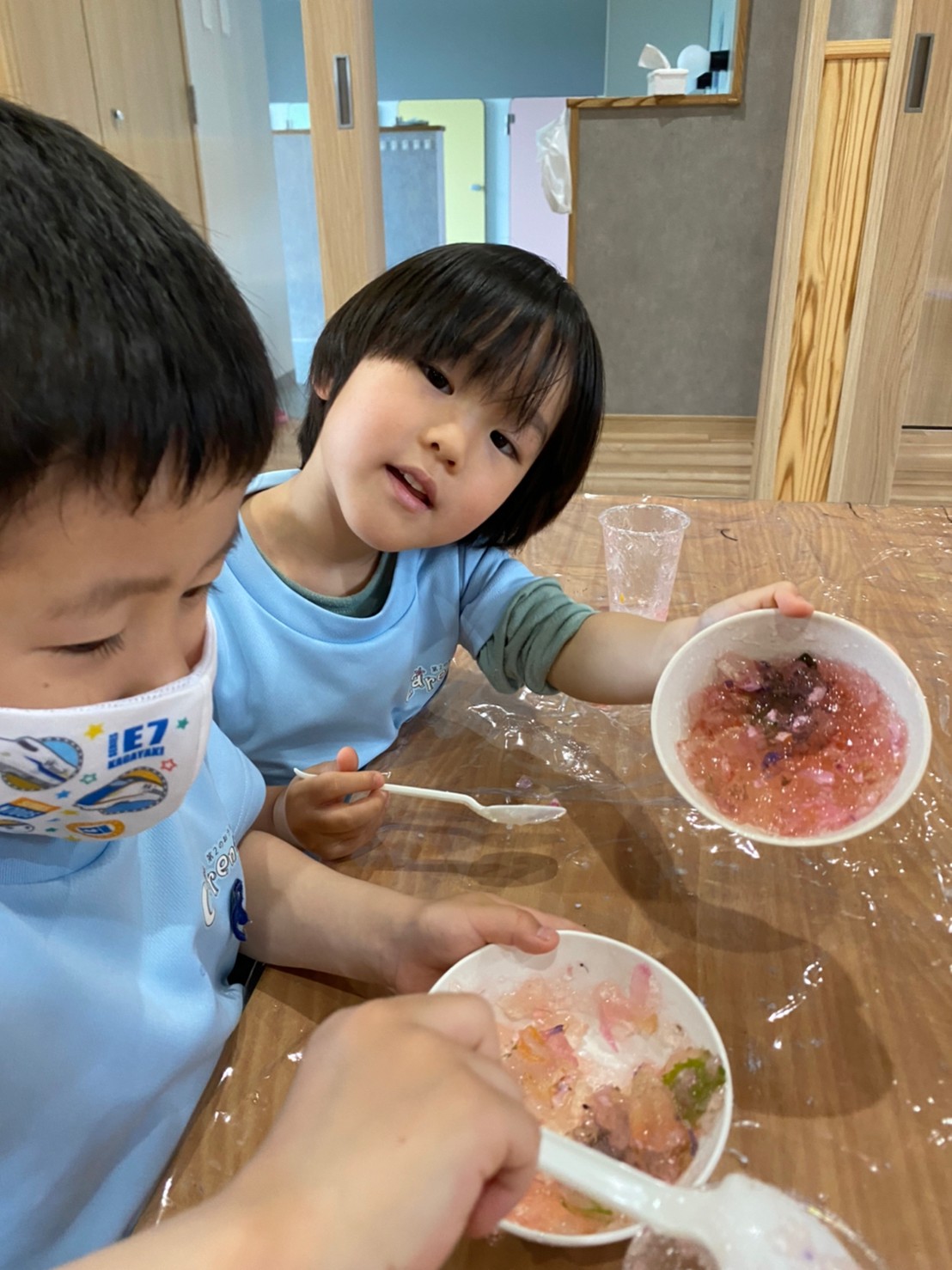 透明のプラスチックカップに入れて遊んだり、スプーンでつぎ分けたりと楽しんでいましたよ😊💕