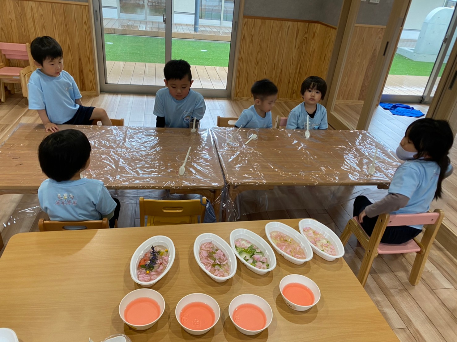 今日はポピーを進めた後に、先日拾ってきた花びらや草を寒天にして遊びました⭐️