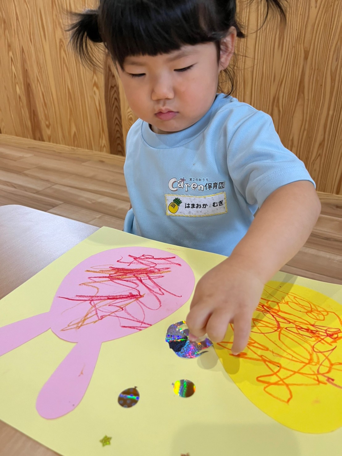 製作のシール貼りを行い、自分の好きなシールを選んで大きい形や小さい形を上手に貼っていました🤩