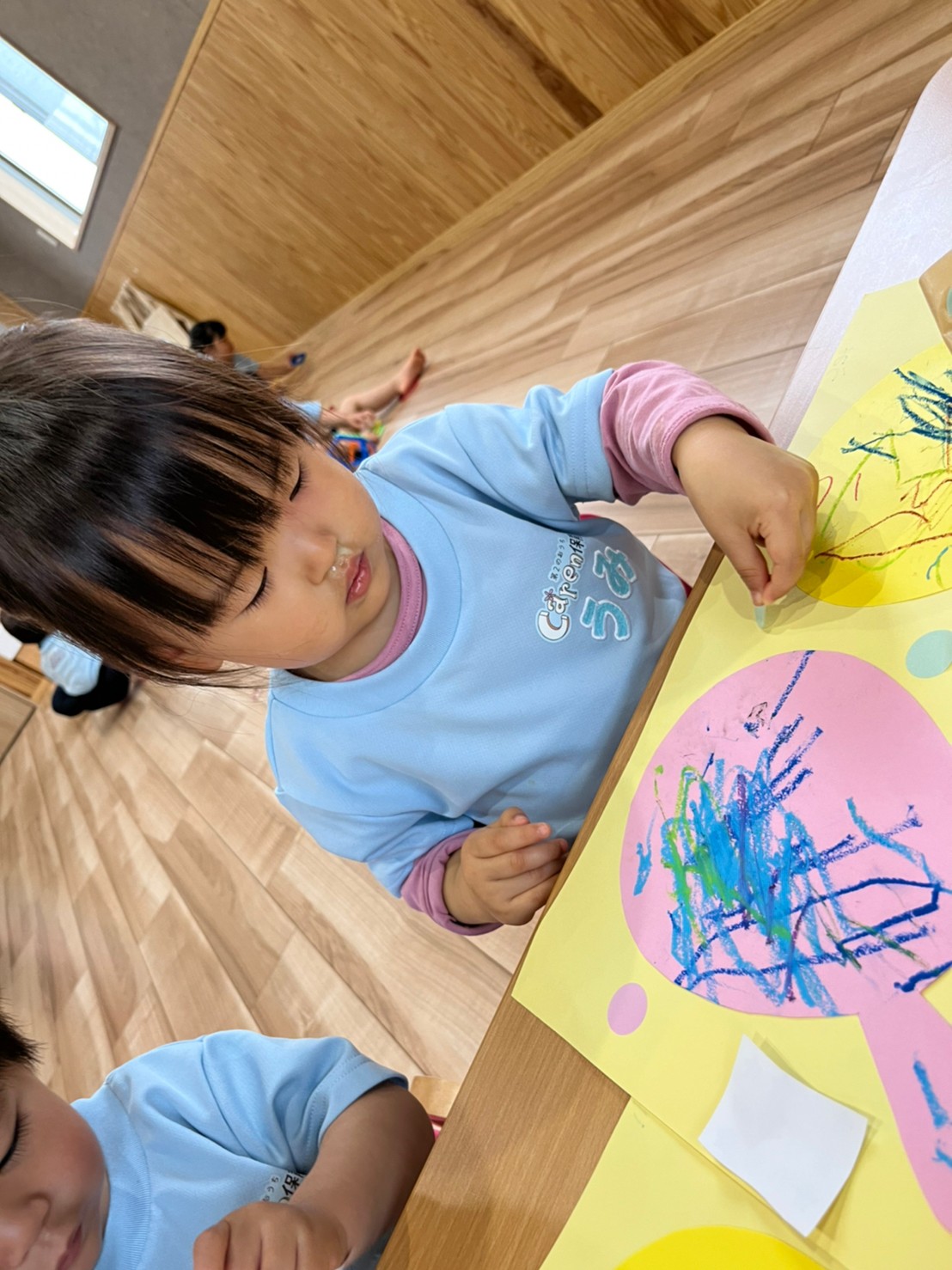 りすぐみ)5月制作をしました😍好きな色のクレヨンを使い鯉のぼりに模様を描きました🖍制作後はポットン落としやままごとといろんな玩具を使い室内でゆったり過ごした😊
