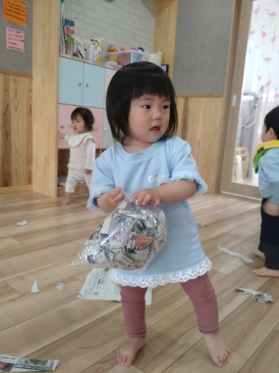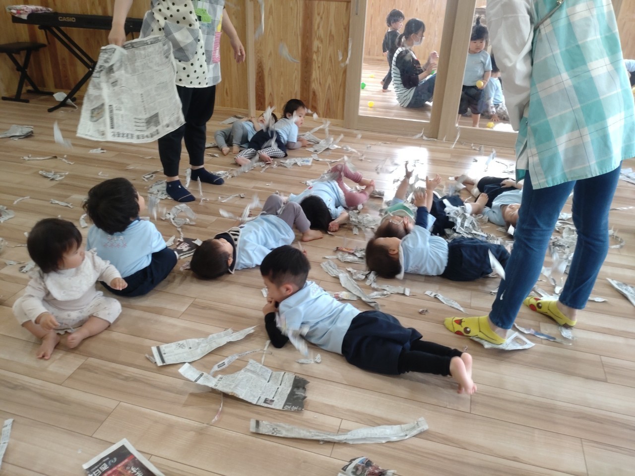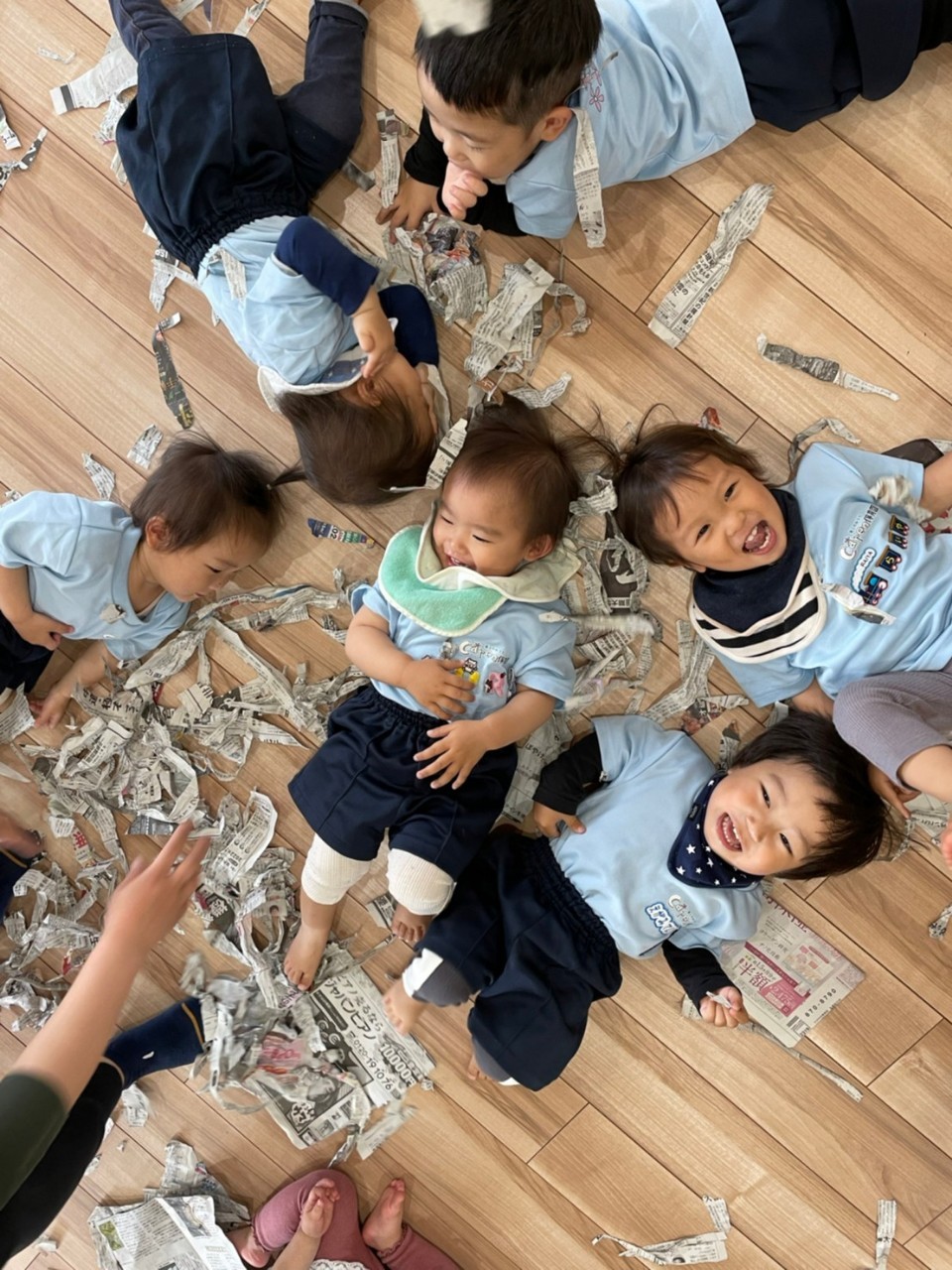 今日はお部屋で新聞紙遊びをしました✨もうすぐ子どもの日なので、兜をかぶって記念撮影をしました🎏新聞紙をちぎった後は、寝転んで上から散らすと大笑いして喜ぶ子ども達😆最後はビニール袋に入れてボールを作って遊びました⚾️ぱんだ組🥹