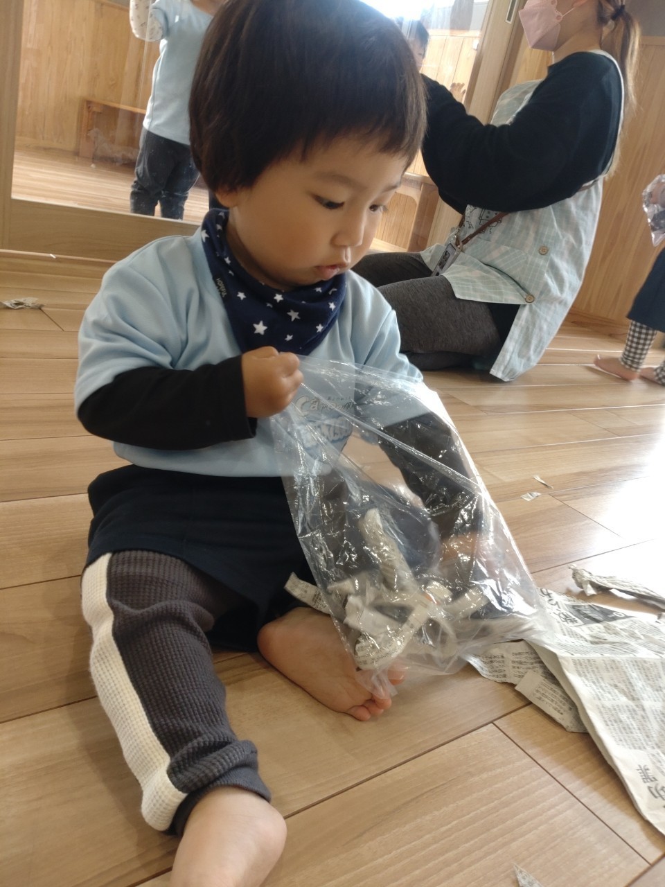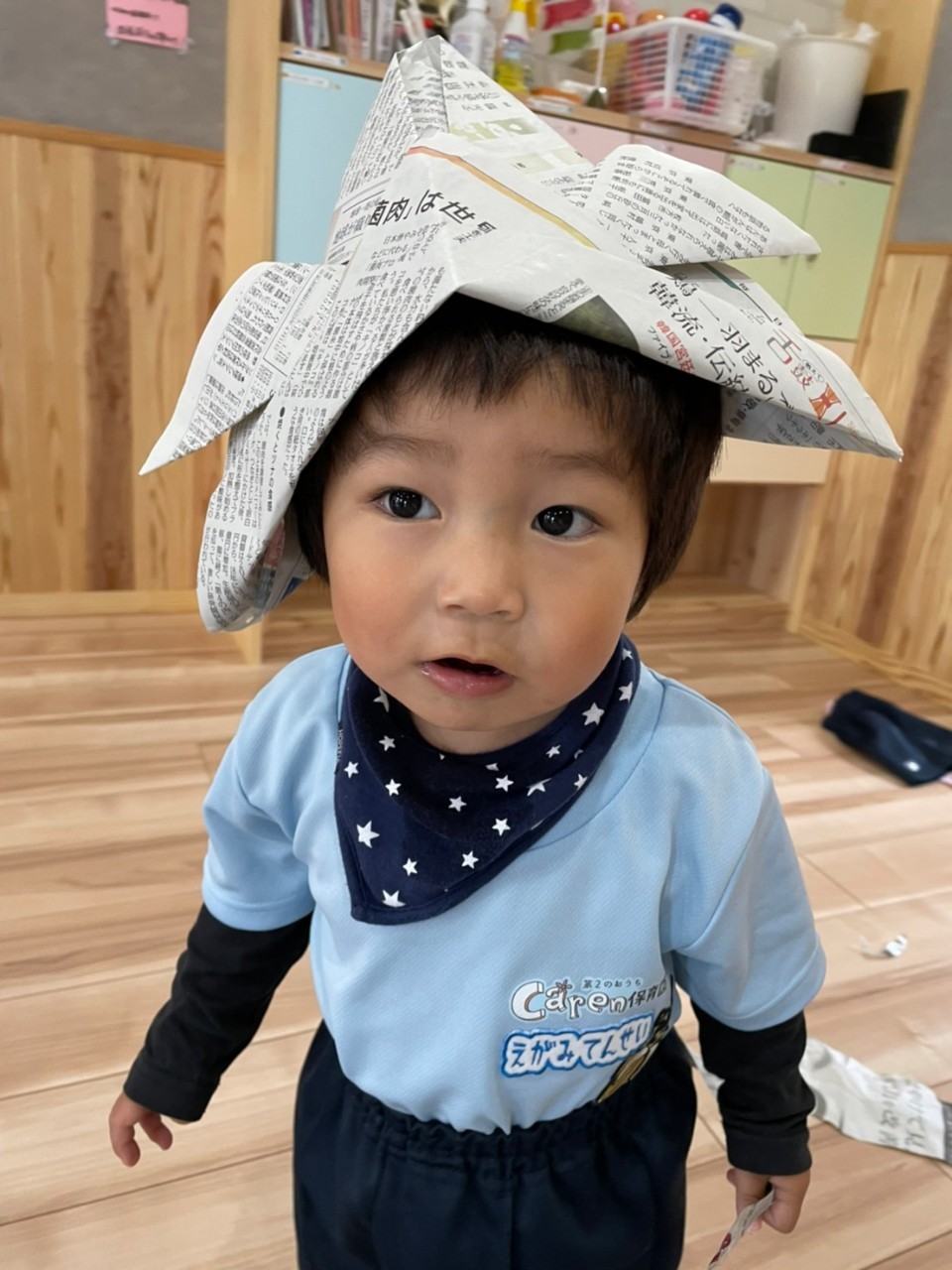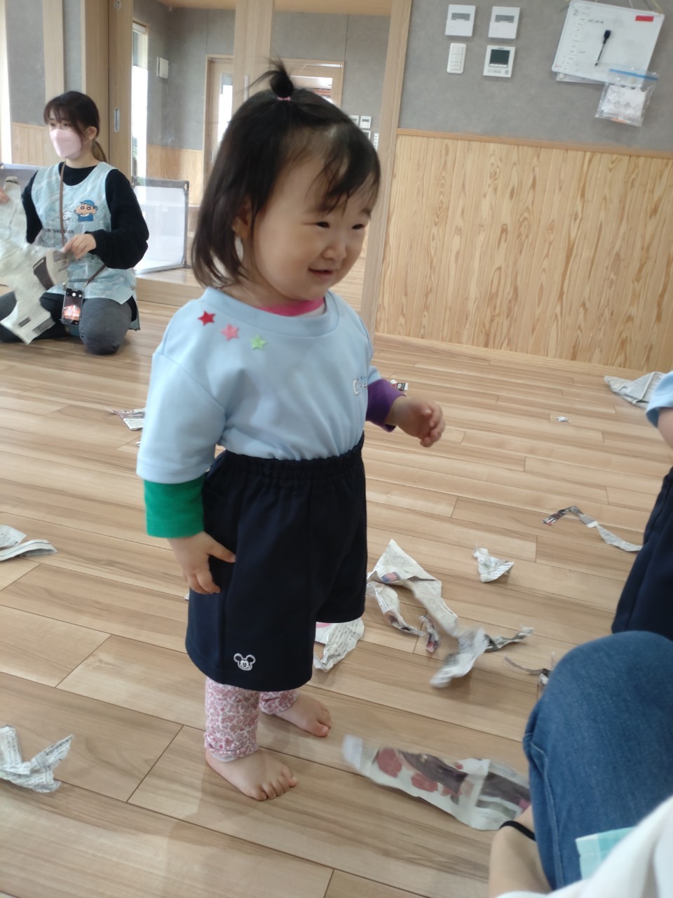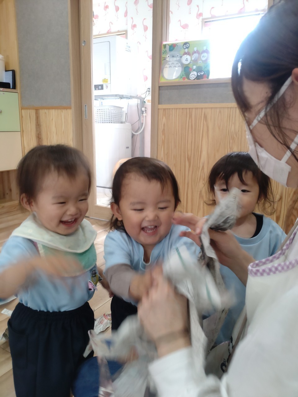 今日はお部屋で新聞紙遊びをしました✨もうすぐ子どもの日なので、兜をかぶって記念撮影をしました🎏新聞紙をちぎった後は、寝転んで上から散らすと大笑いして喜ぶ子ども達😆最後はビニール袋に入れてボールを作って遊びました⚾️ぱんだ組🥹