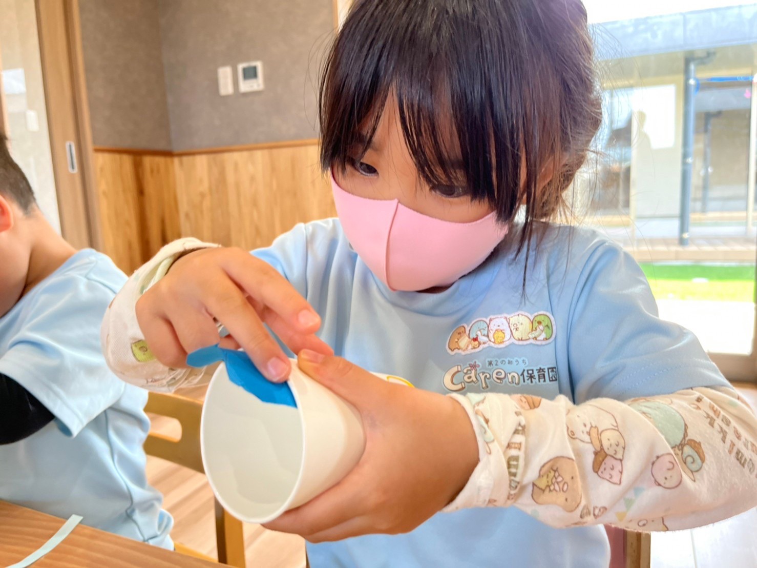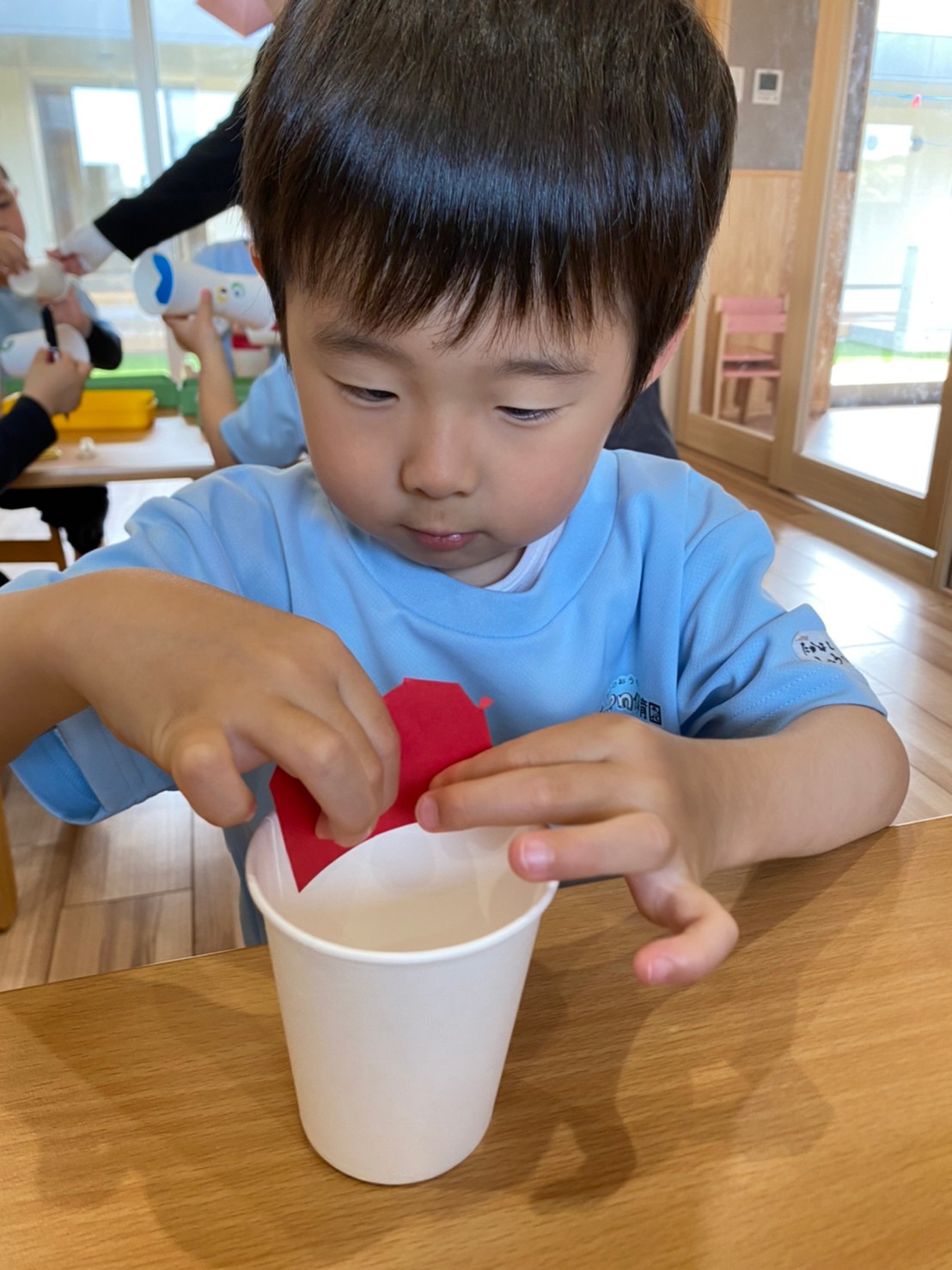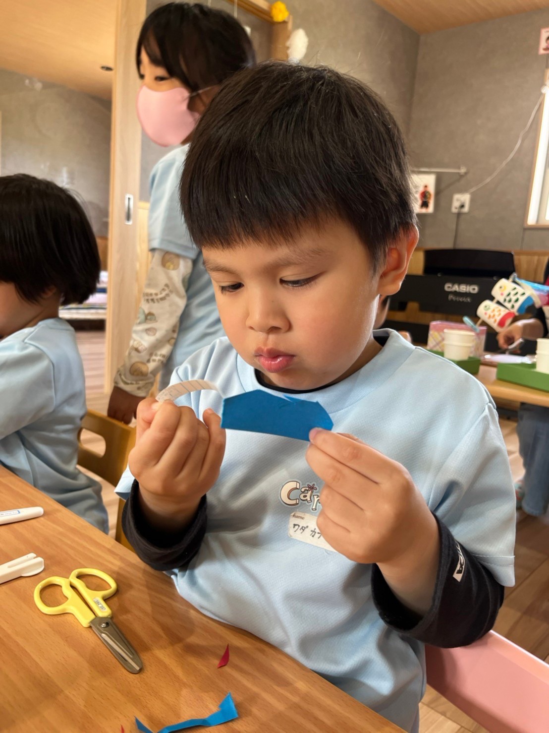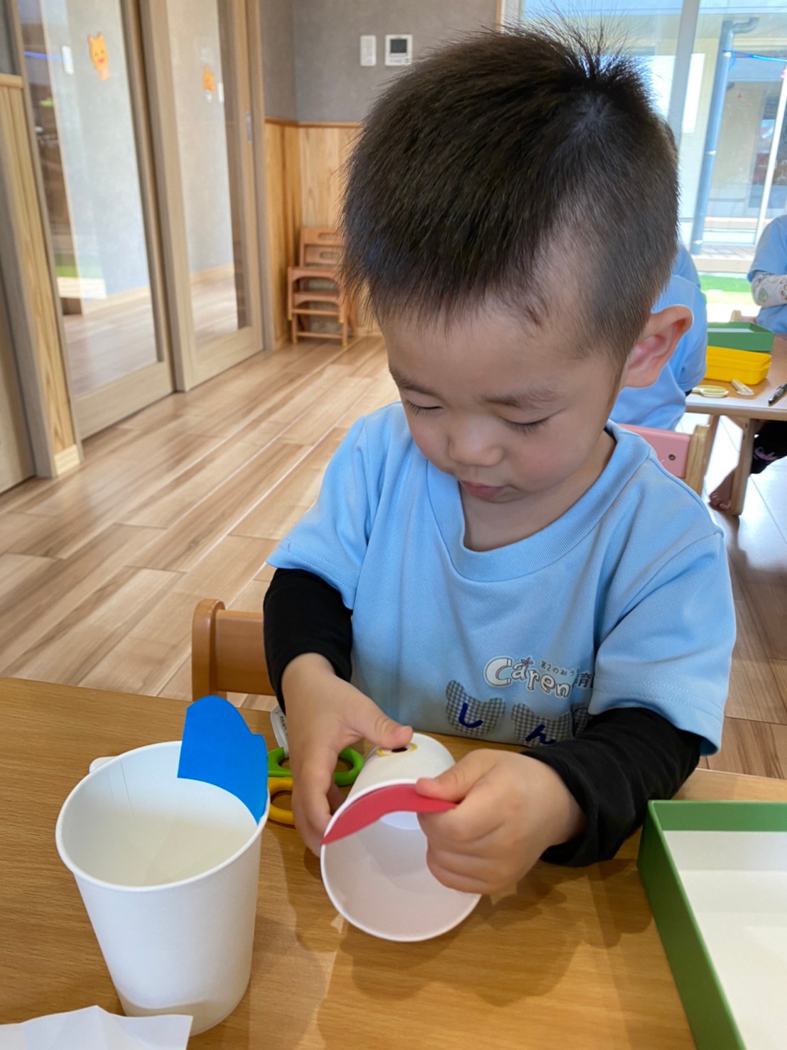 見本を見ながら、紙コップにシールを貼ったり、こいのぼりの尾鰭をハサミで切って貼ったりと、かわいいこいのぼりを製作することができました😊💕