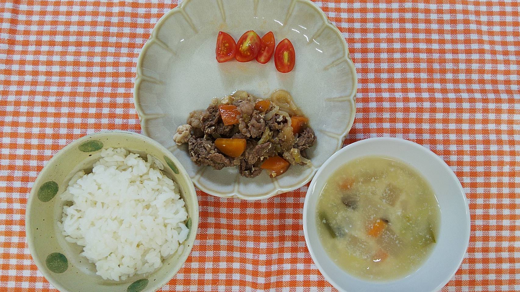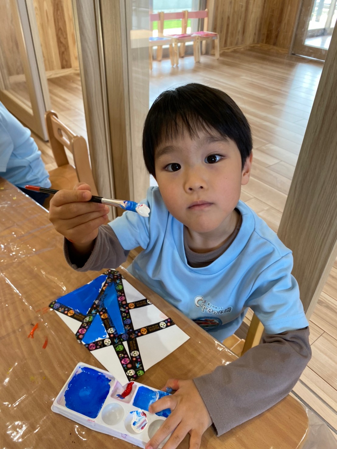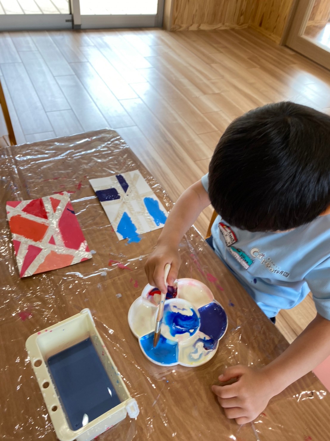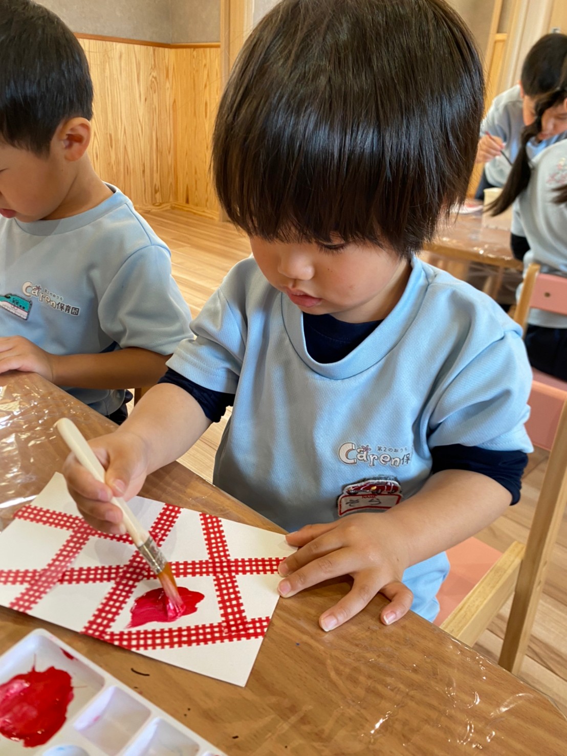 絵の具が乾いた後に、マスキングテープをはがすのを心待ちにしている子どもたちでした☺️💕【くりえいと園の今日の給食です】
