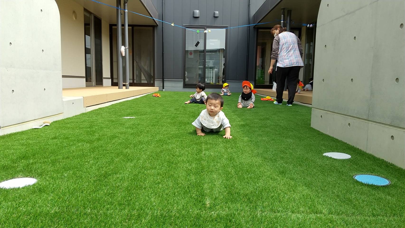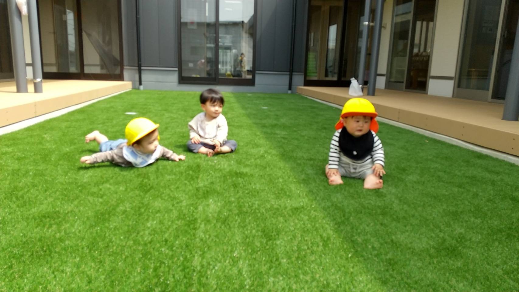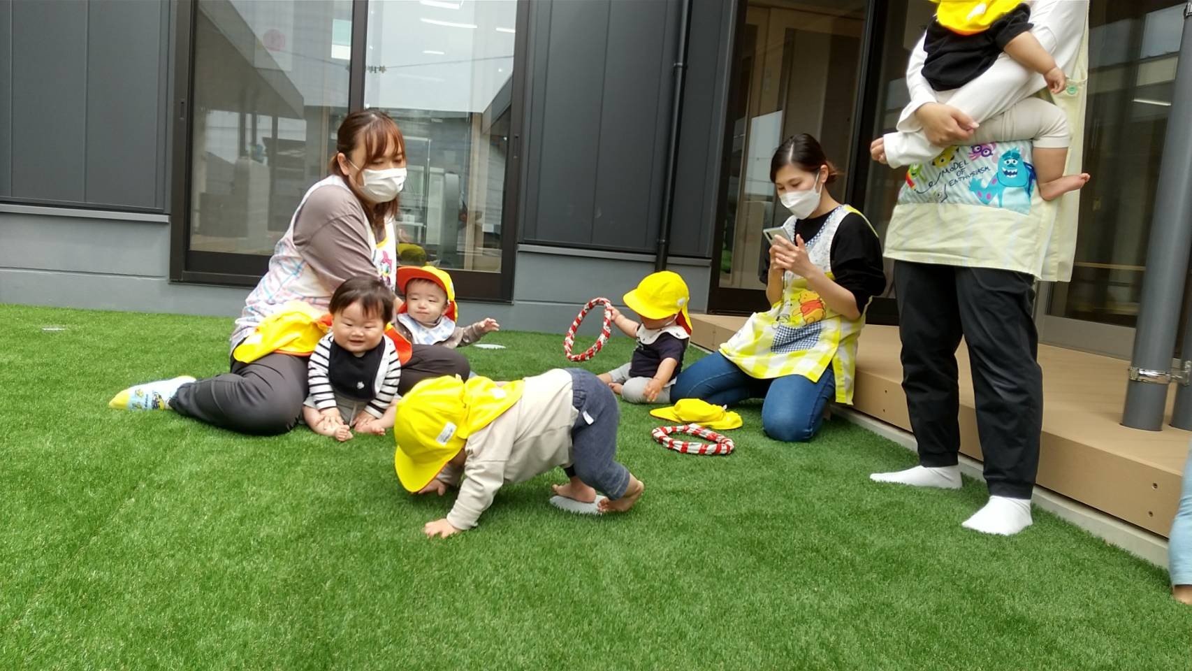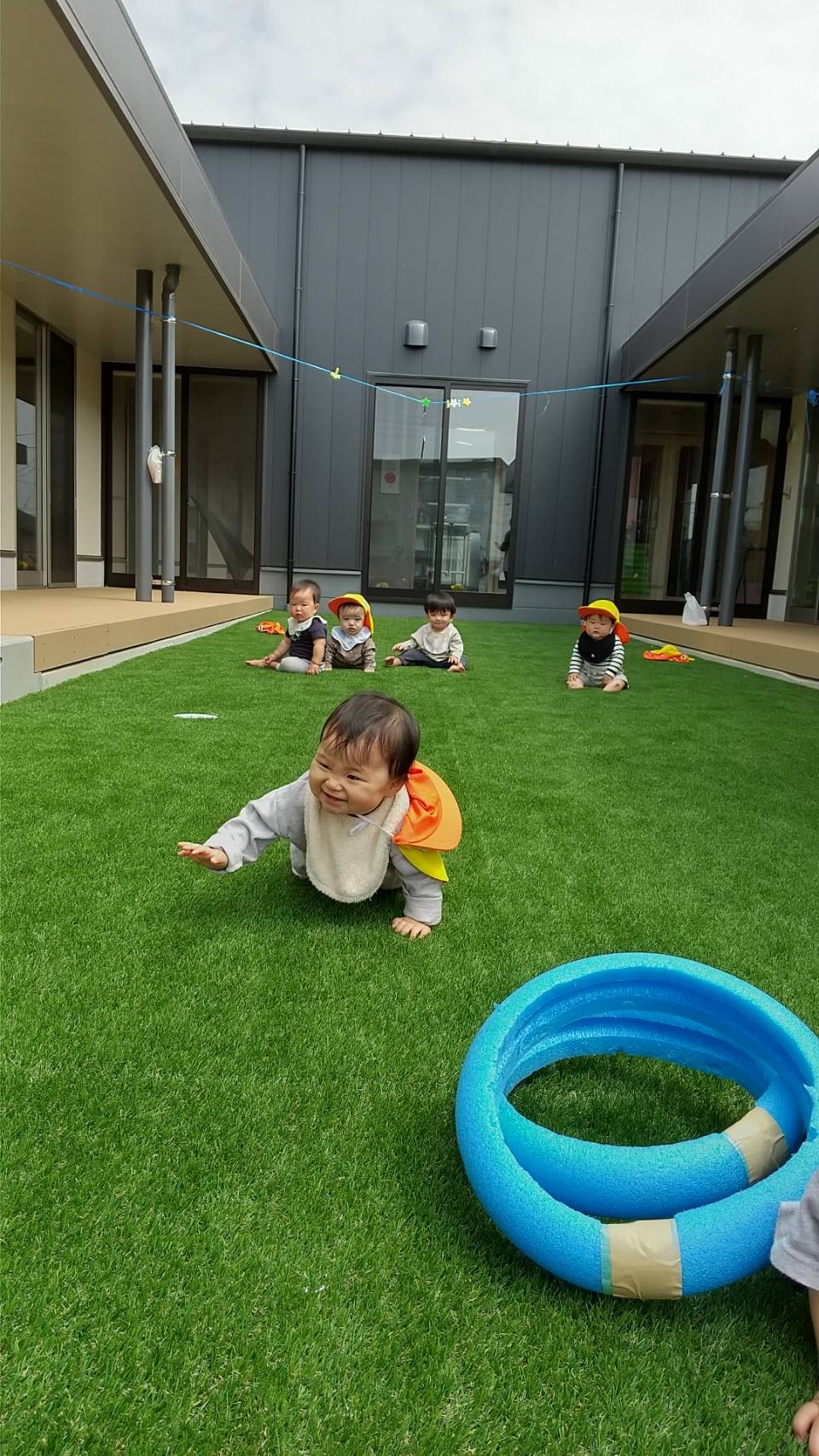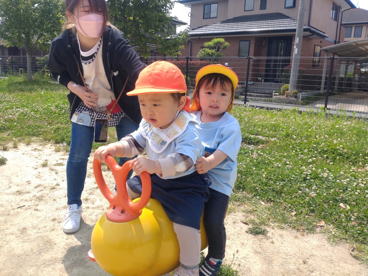 その後は園庭でボールやフープで遊んたり、ハイハイ競争をしました!いろんなものに興味がありすぎて、ゴールは遠いひよこさん達でした😅✨🐿りす組🐿